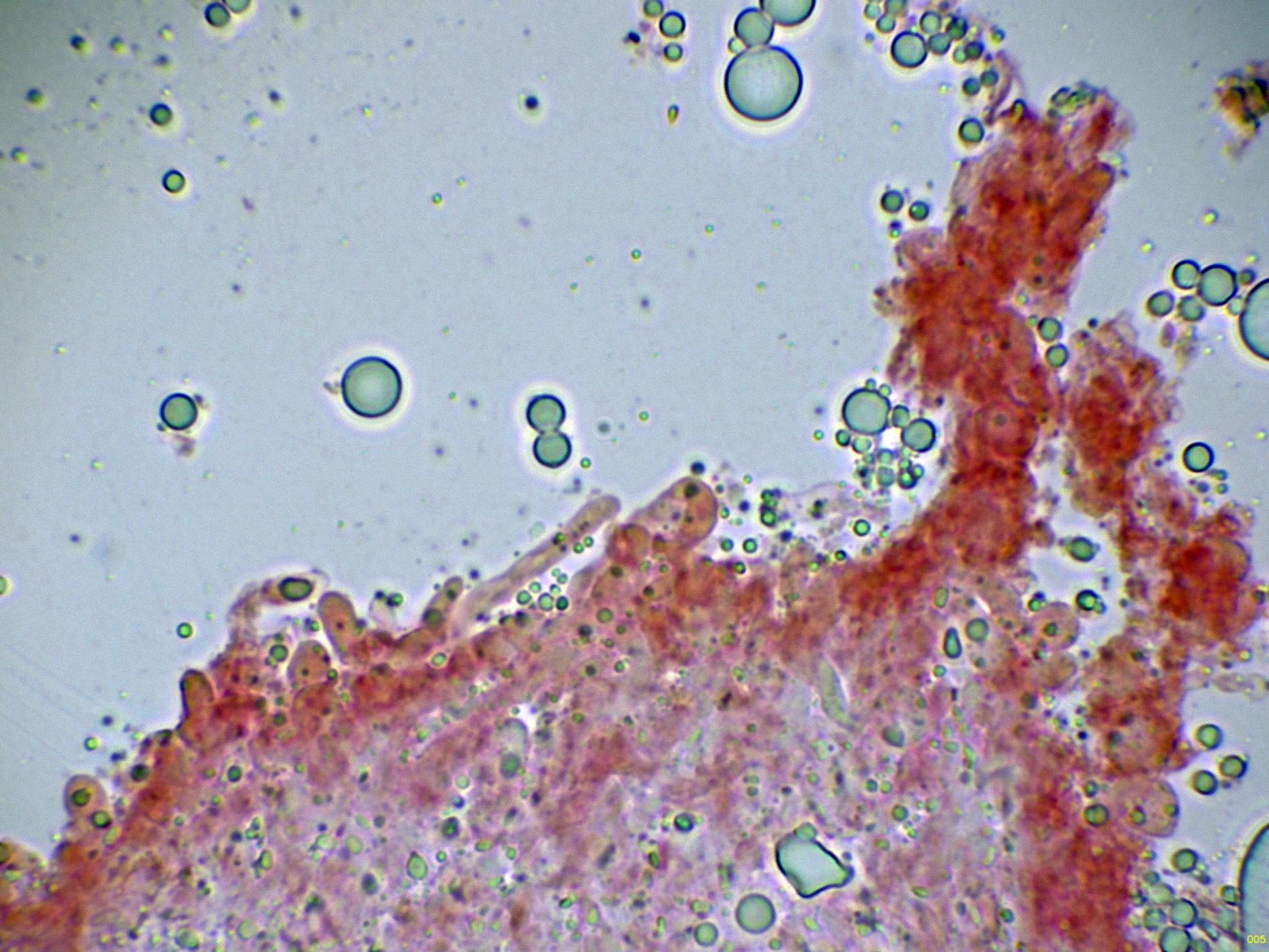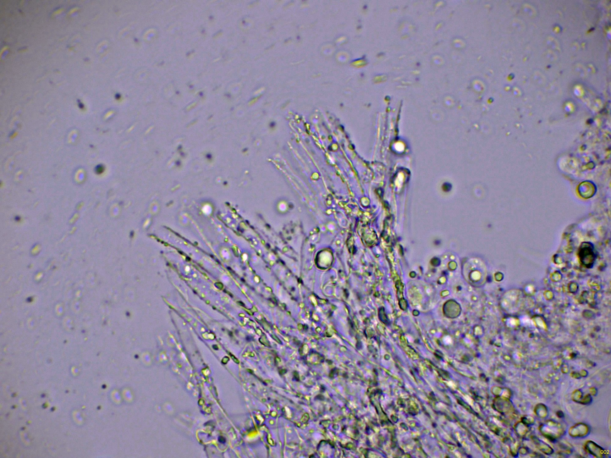 Los basidios en agua, estos basidios con unas medidas de (16.3) 16.9 - 22.8 (24.2) × (4.6) 5.1 - 6.7 (7.1) µm.