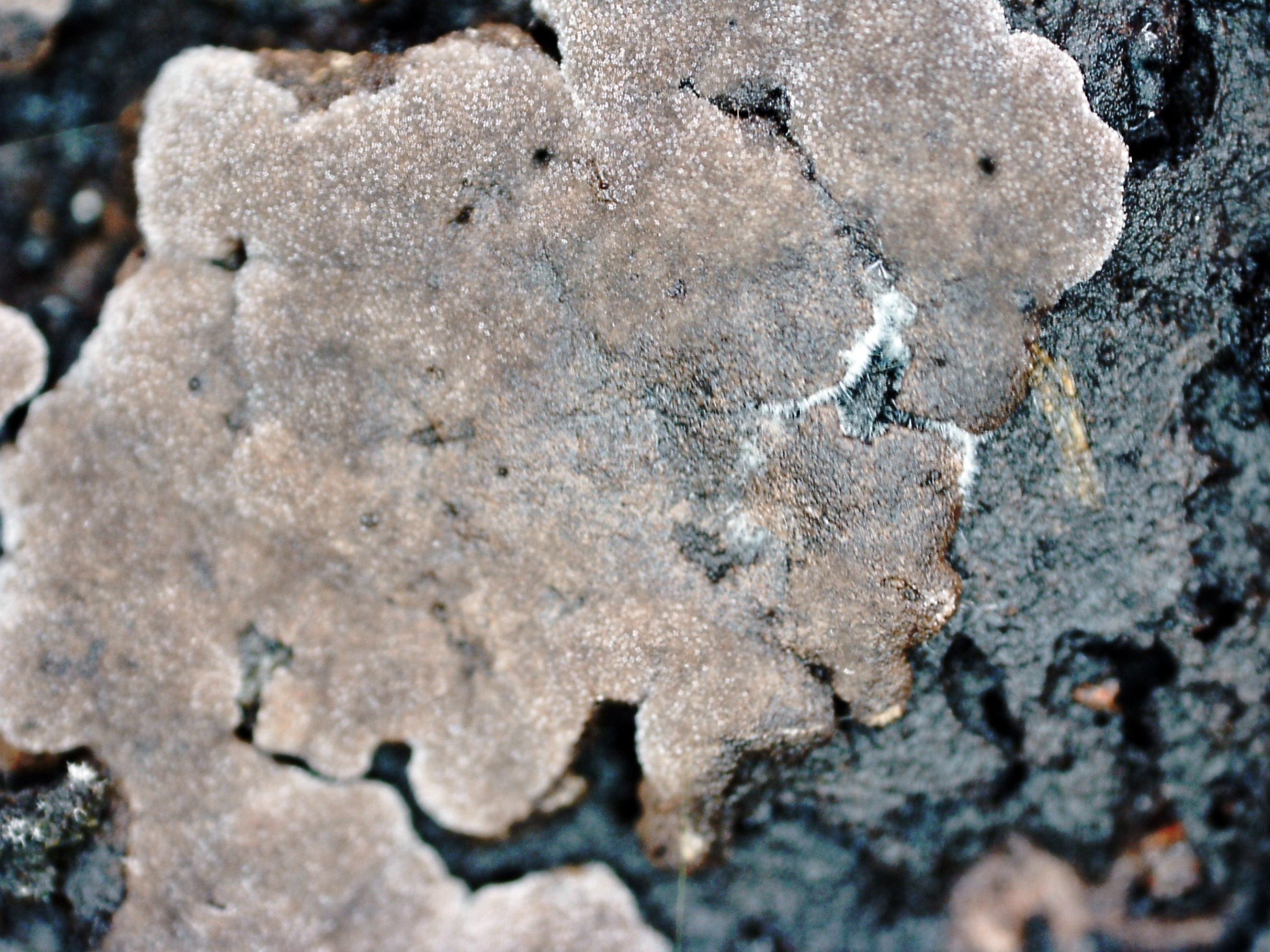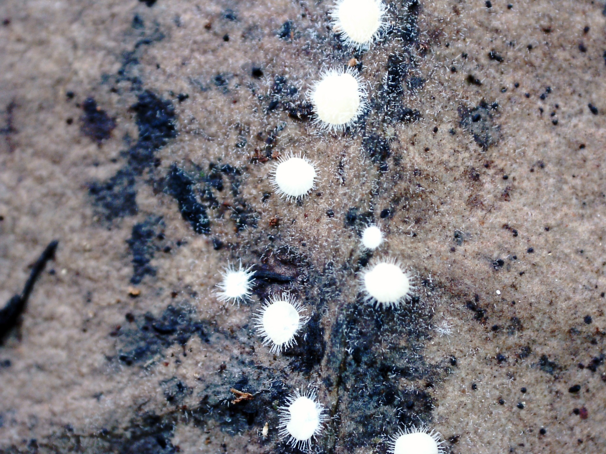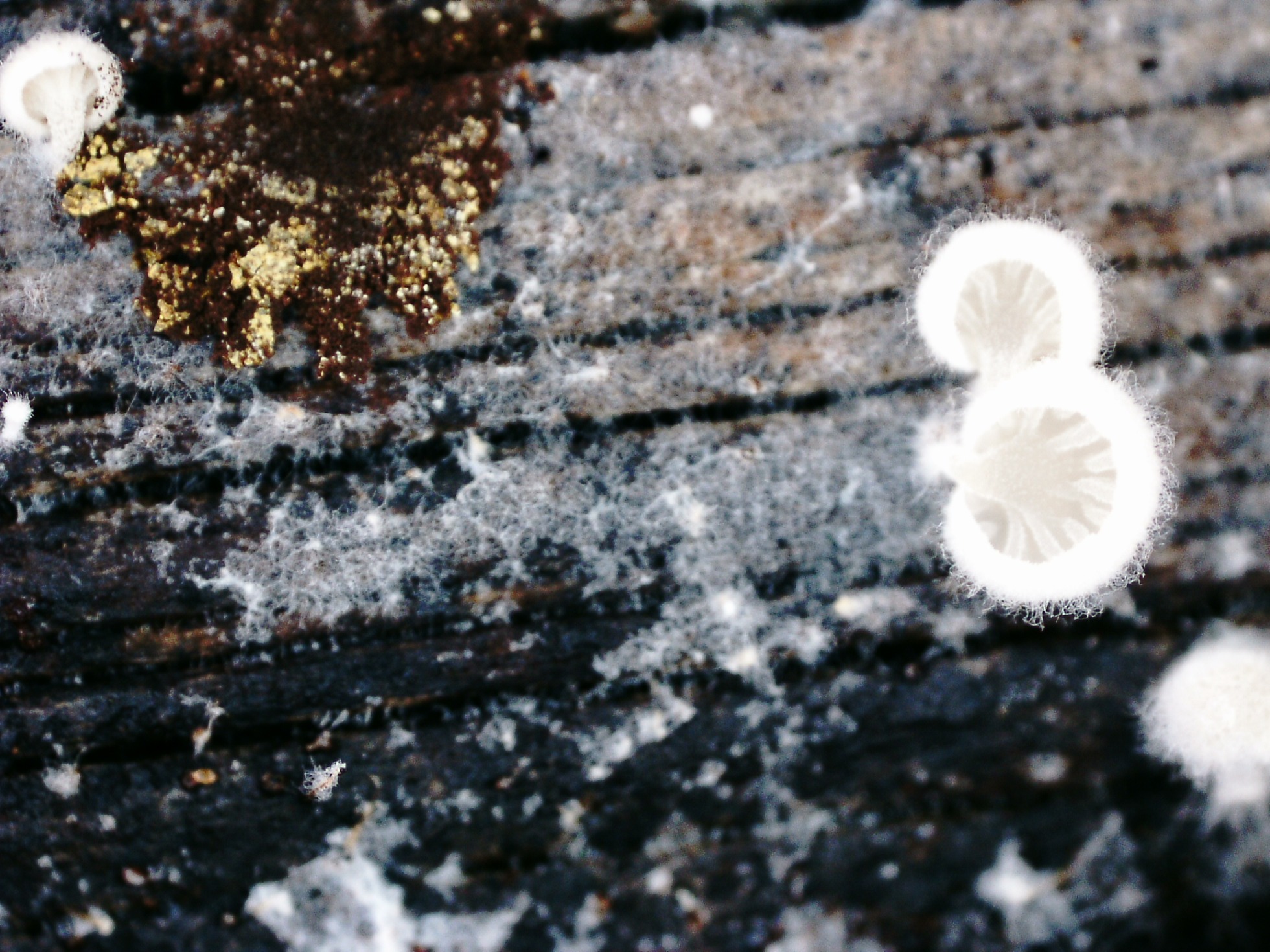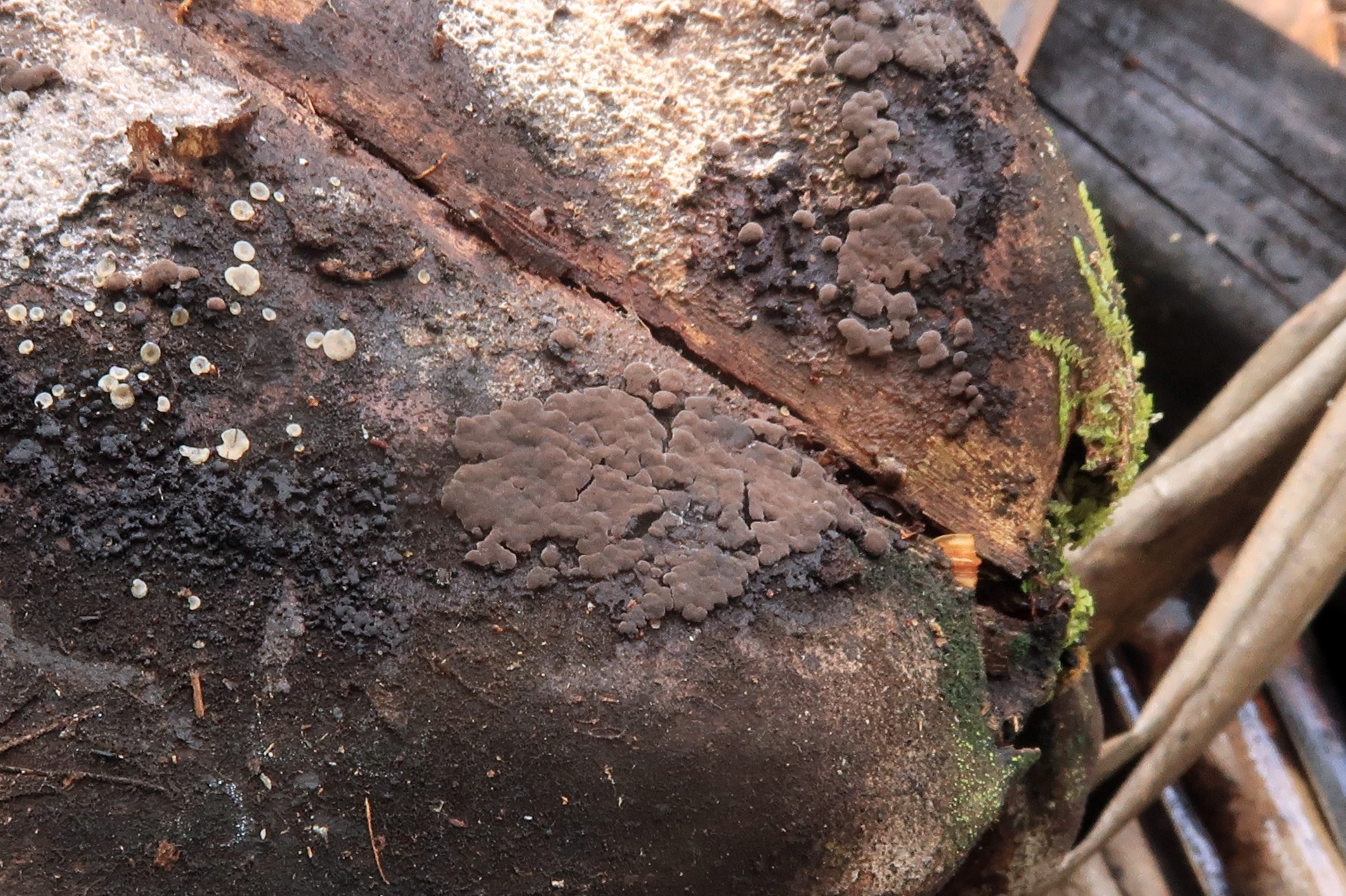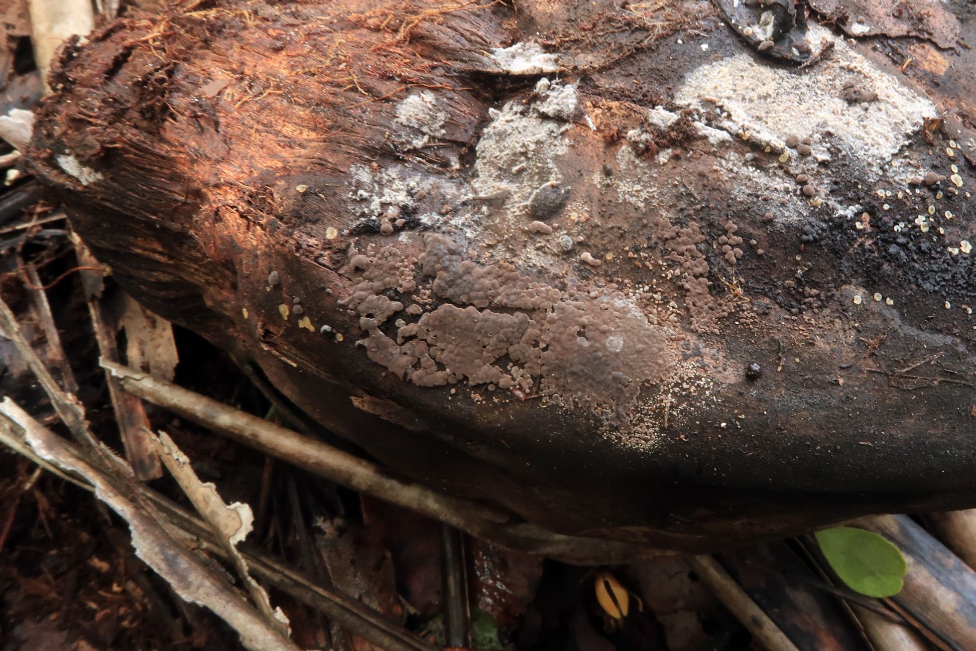 Sobre el escobajo de una cáscara de coco. una sin duda Tomentella, a tenor de sus características microscópicas cercana a la Toementella punicea Europea, es decir Tomentella aff. punicea: