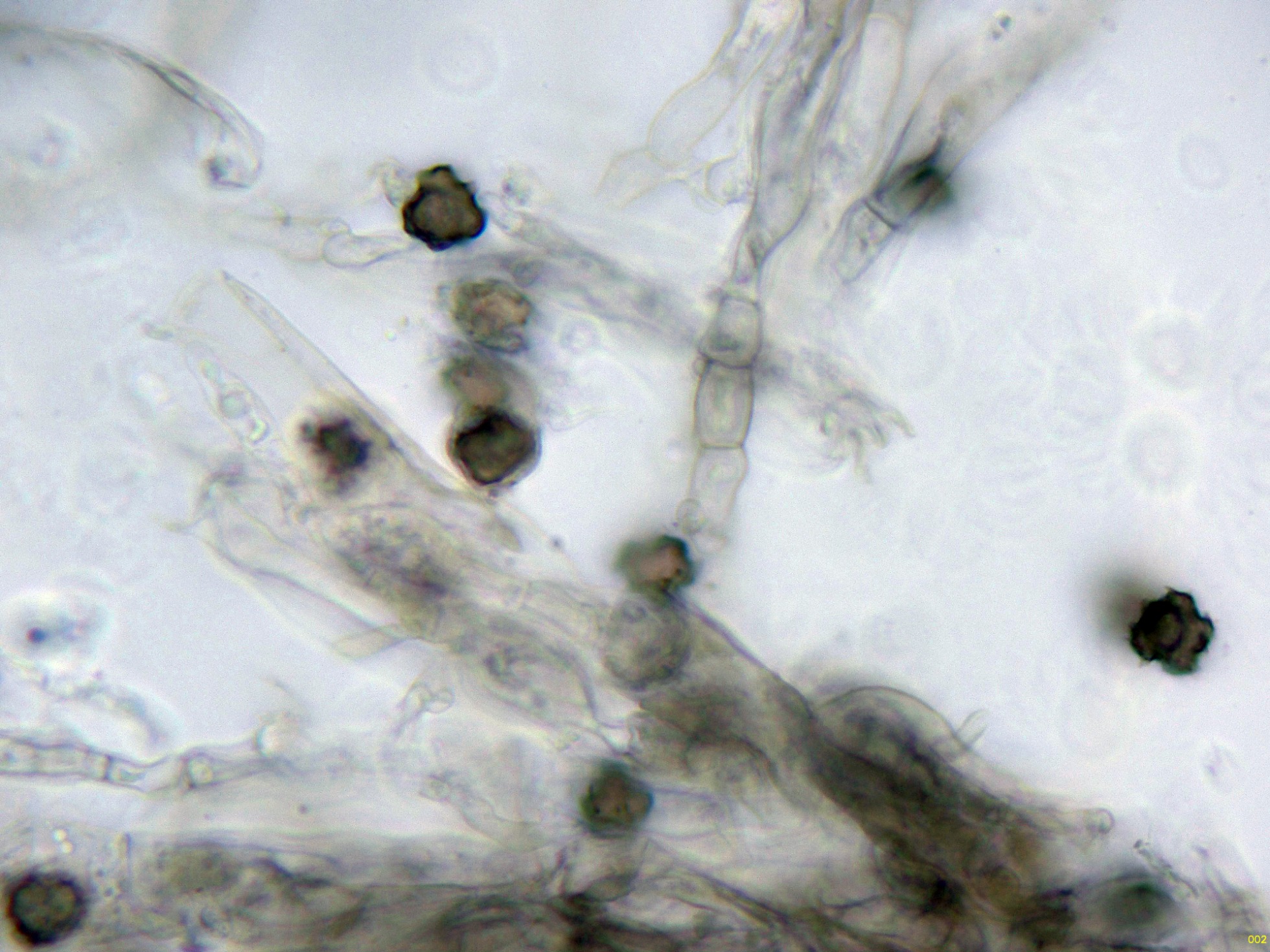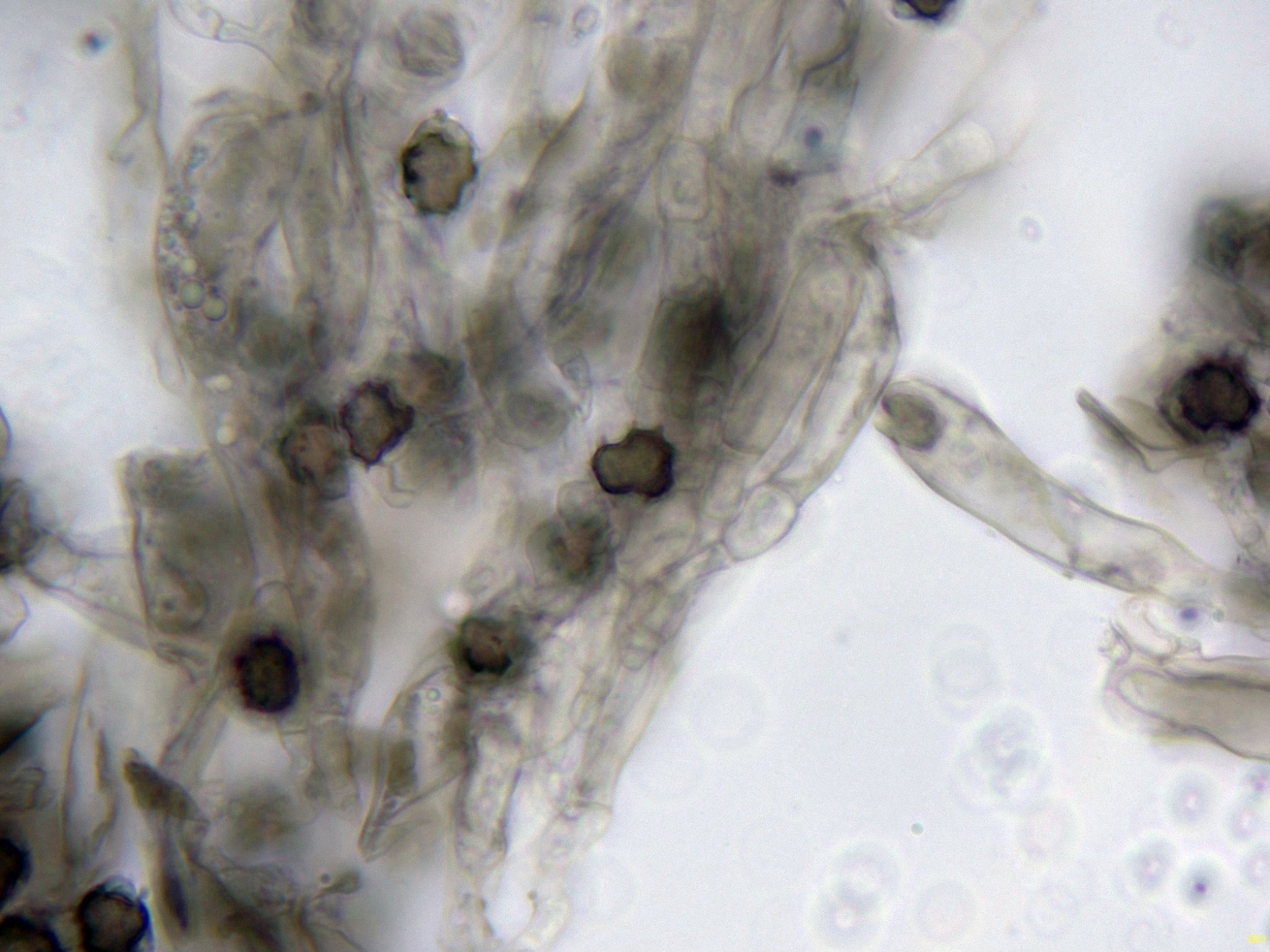 Las hifas marginales, globosas con 3 capas características de la especie: