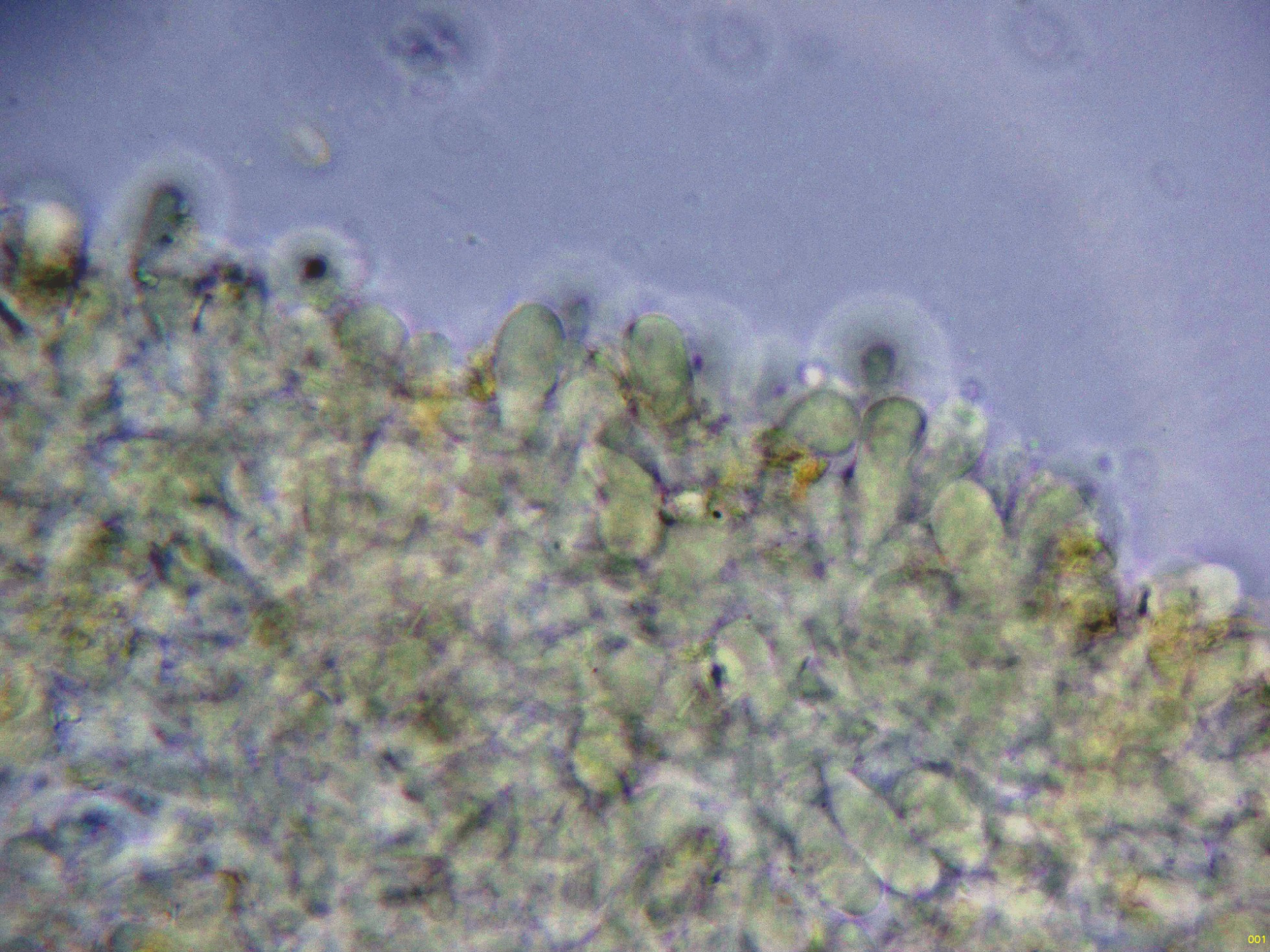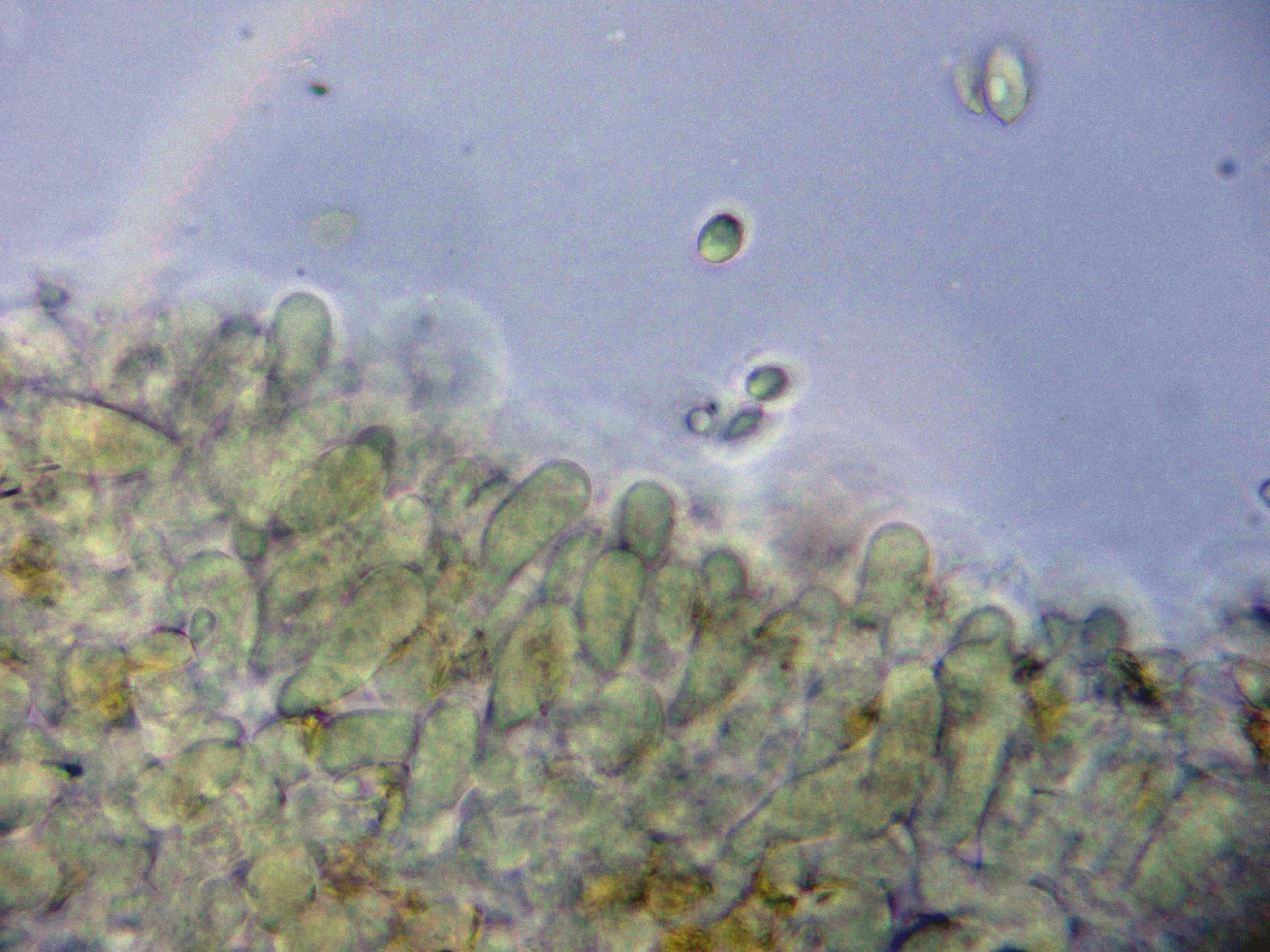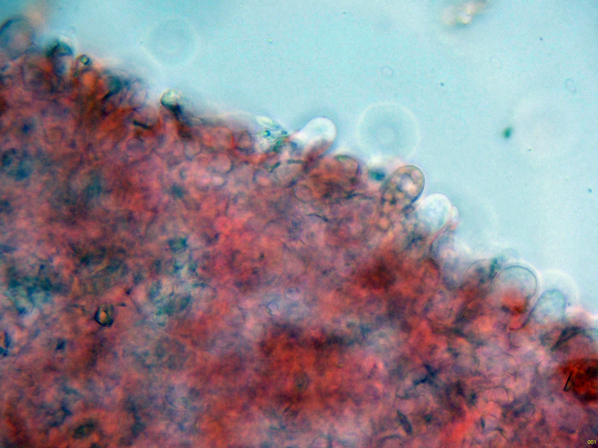 Los basidios en agua, estos basidios con unas medidas de (34.6) 40.2 - 53.2 (54.5) × (7) 9.2 - 12 (13.4) µm., Me = 45.3 × 10.5 µm.