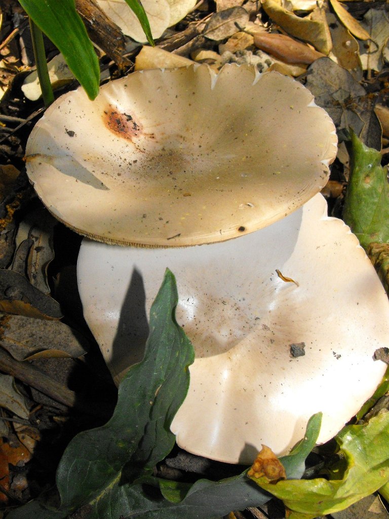 Sombrero: 9 cms. Color blanquecino grisáceo con tonos crema-pardo. Aplanado-deprimido al centro con un mamelón poco pronunciado. Cutícula lisa, seca y separable. Borde liso.