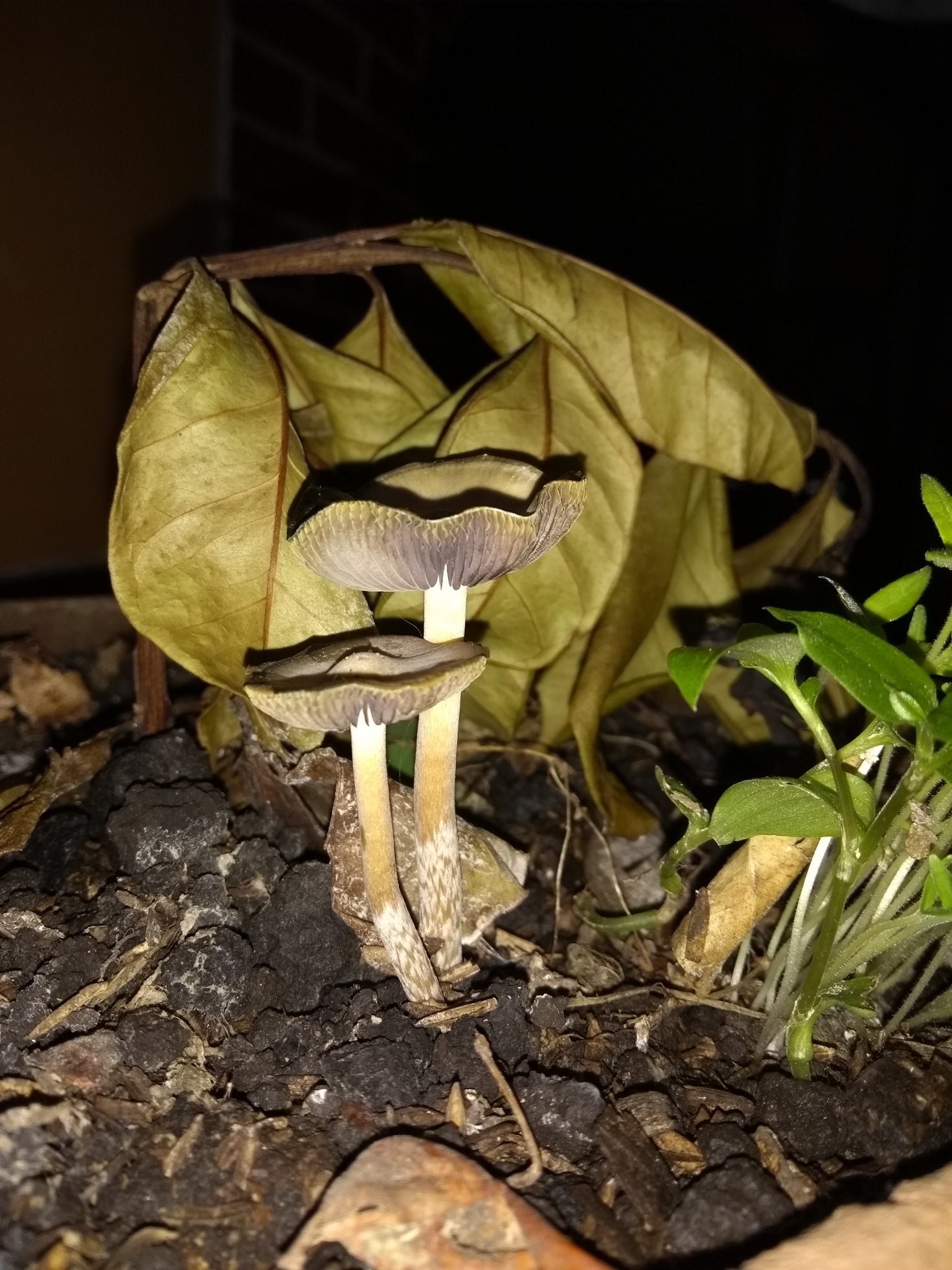 Hola, lo suyo es que tomes las fotos con luz natural por que de lo contrario los colores de desvirtúan, no obstante parece que simplemente se traten de Coprinus sp estas suelen aparecer en el sustrato de las macetas.