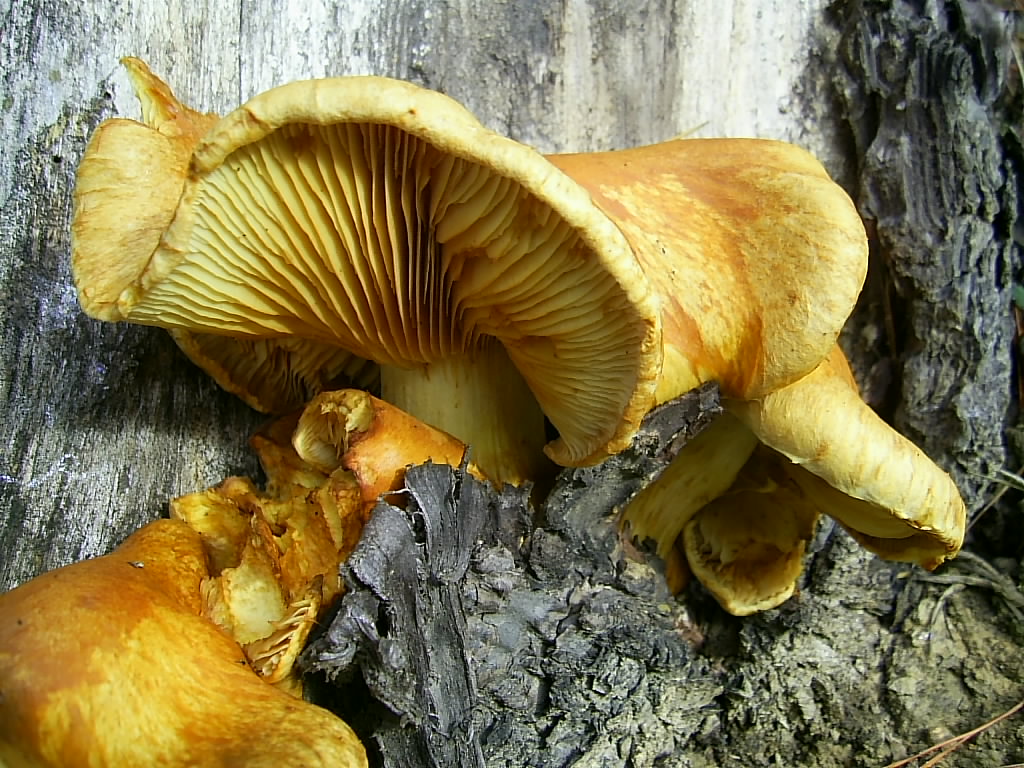 Como está en un tocón de pino, pensé primero en una Armillaria mellea, al fijarme en el pie la descarté y ahora tengo la duda. Puede ser un Tricholoma viridifucatum?