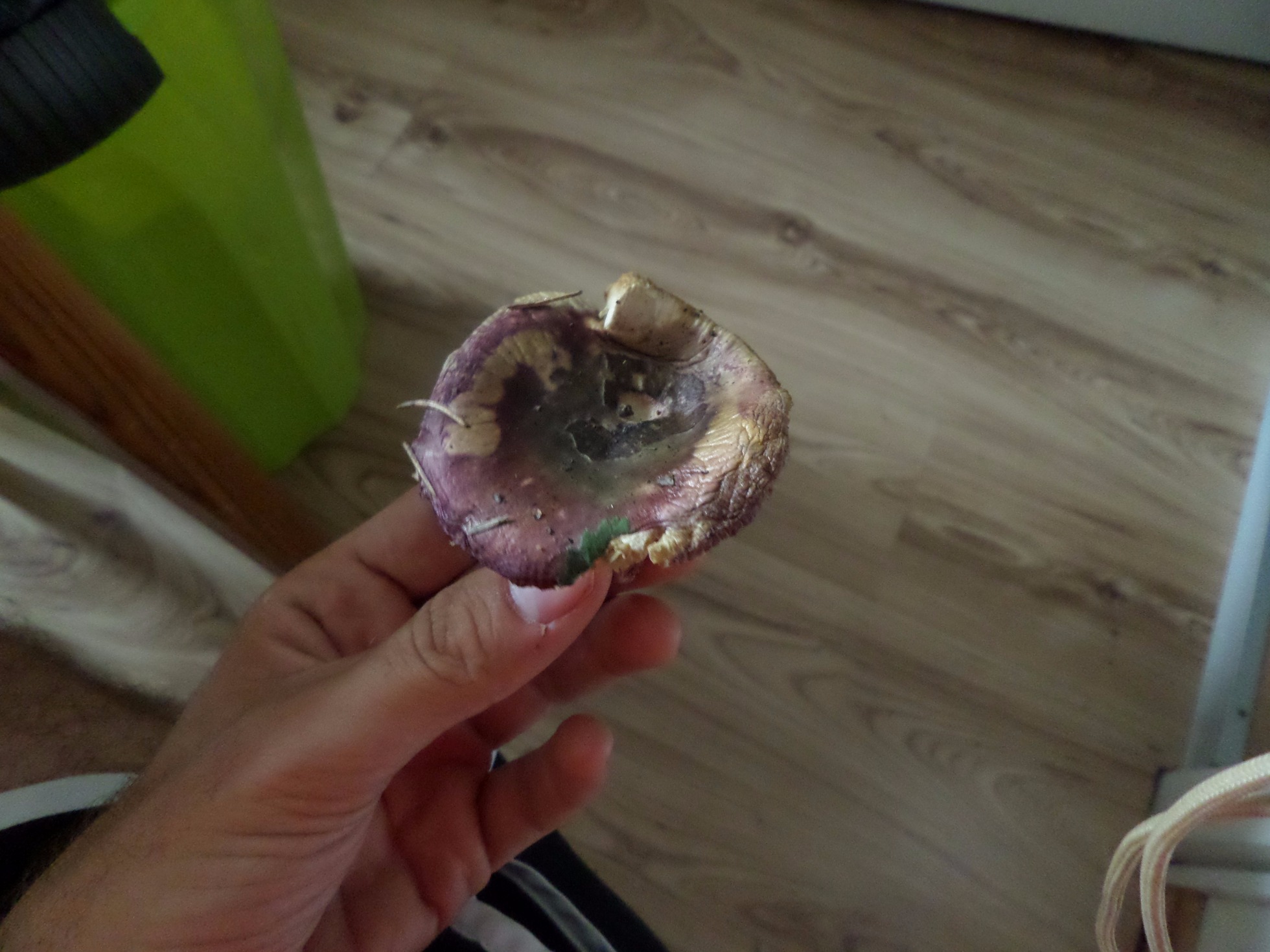 2.Diría que es una seta de la familia de las lepistas, pero las láminas marrones me descolocan. Además tiene un color marron con tonos violetas brillante tanto en el sombrero como en el tronco. Aproximadamente 10cm de sombrero y un tronco de 6 cm de longitud. (2A, 2B).