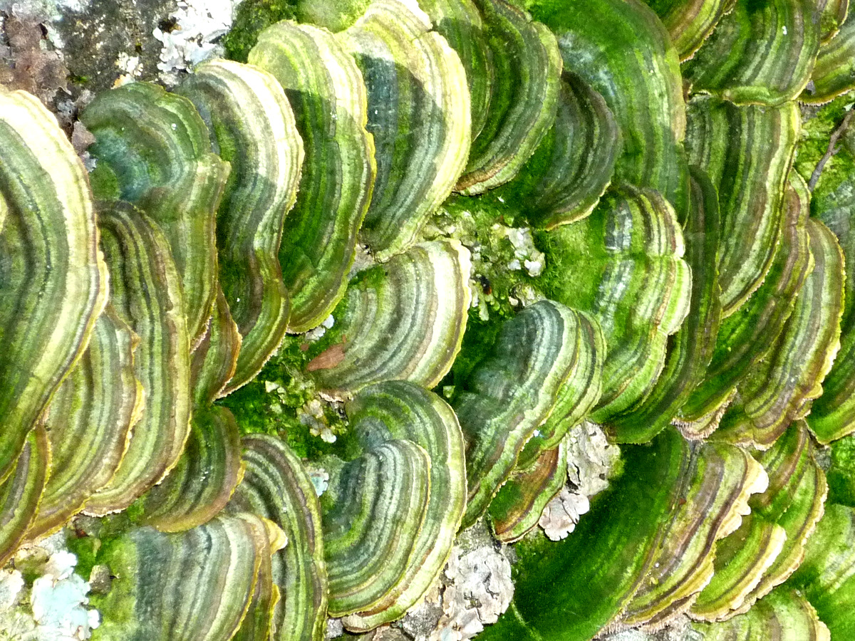 Alcedo lo más probable es tramete versicolor. Pero no es el color lo que pretendía ver, ya que me imaginaba que las setas estarían ya pasadas y no mantendrían su color original.