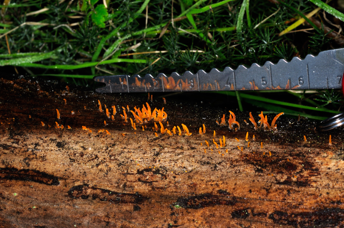 La otra es Calocera cornea, mucho más pequeña y que suele aparecer sobre madera de planifolios