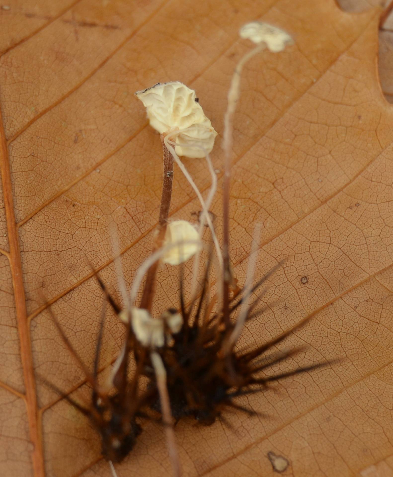Marasmius epiphyllus (Pers.) Fr. 1838) una minisetilla de pocos milímetros de sombrero y poco mas de un cm de pie. De este otoño pasado en un sotobosque, naciendo sobre hojas de castaño podridas, algún erizo de castaña y ramítas muertas. de esas que se ven por casualidad al ponerse de rodillas a buscar otra seta: