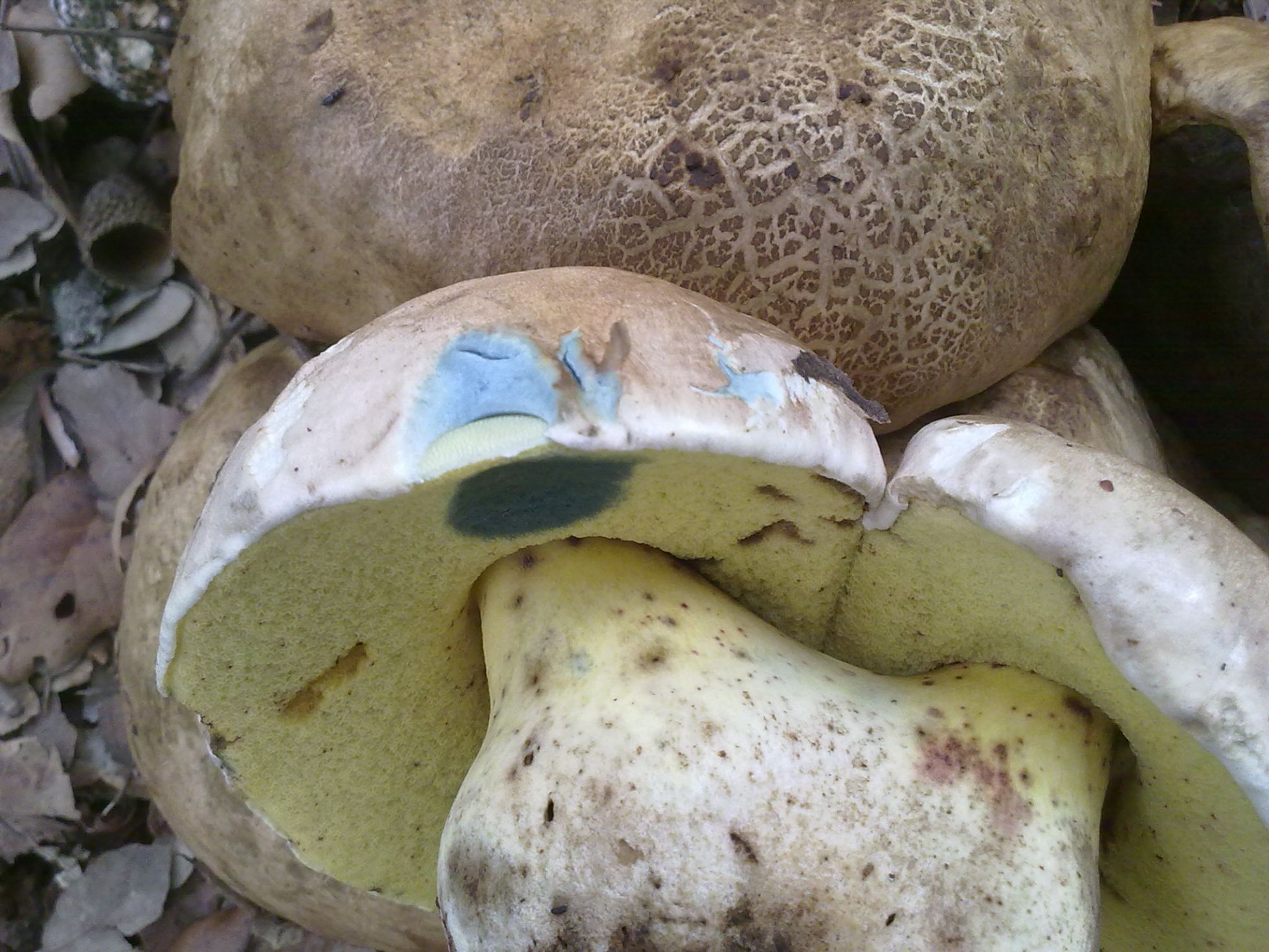 Estuve por la misma zona y me encontré con este enorme grupo de estos amargos boletus. En la primera foto se aprecia su considerable tamaño y también vemos como pueden salir varios individuos unidos por el pié. En la última de las fotos vemos el bonito color azulado que toma después de haberle presionado con los dedos.