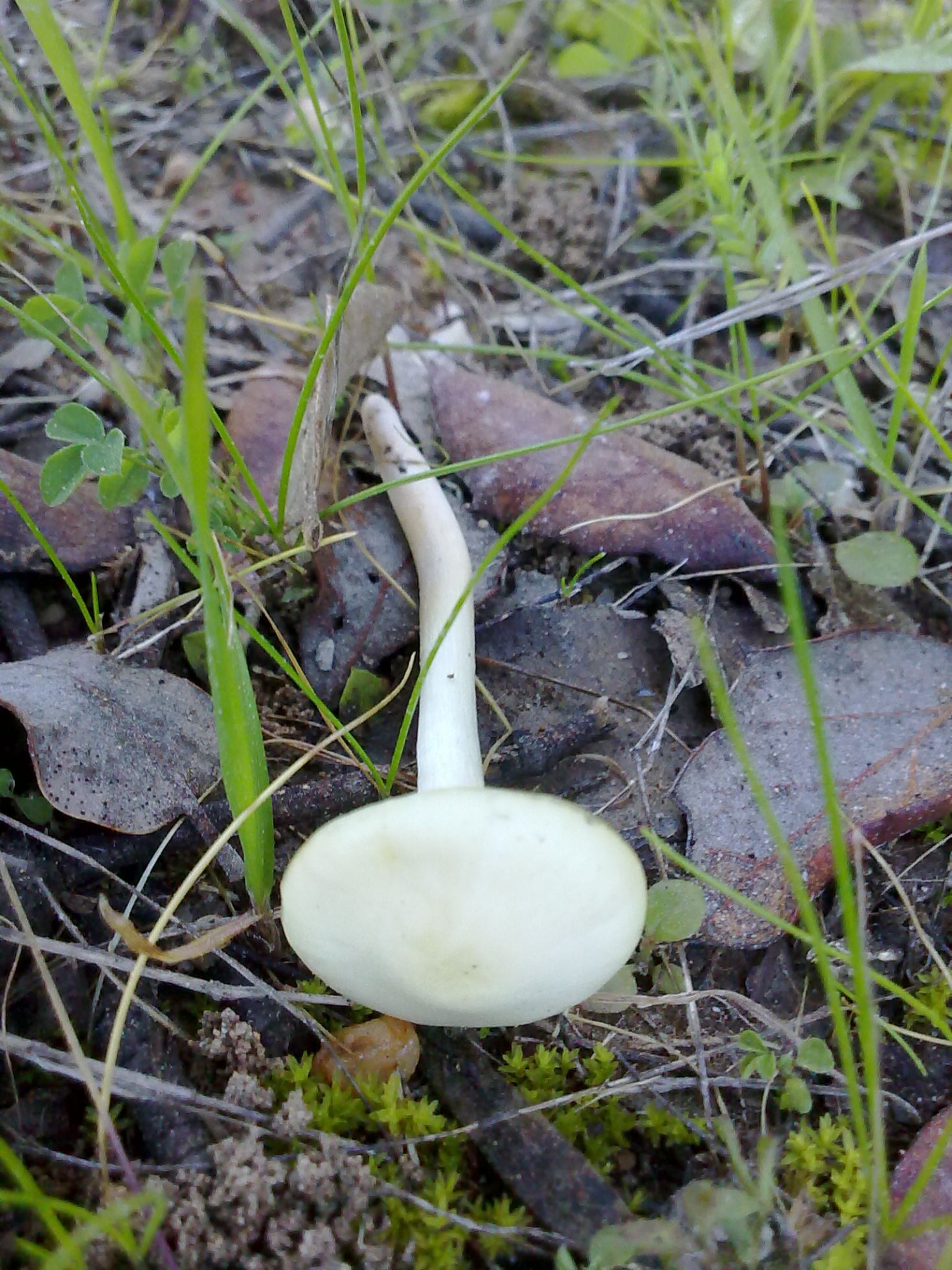 Encontrada junto a un camino no asfaltado entre jara pringosa y otras herbáceas, de un color casi blanco-crema, sombrero de unos 3cm, laminas blancas decurrentes, pié largo y afilado en la base.