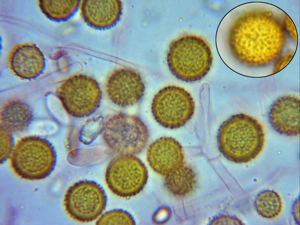 En la etapa amarilla las esporas son de un bonito color amarillento, granulosas, globosas y en mi caso de entre 12,1 a 16,3 µm.