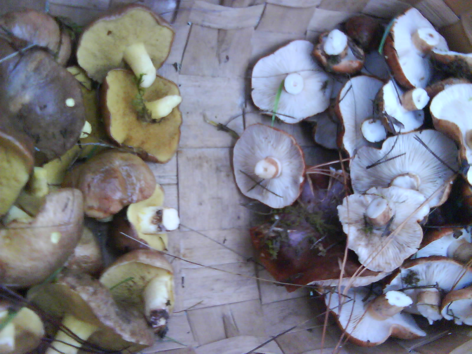 Un pequeño consejo, solo debes cortar las setas que conoces perfectamente y que vas a comer, si necesitas una identificación, con uno o dos ejemplares vale, que estén enteros, de esa forma te abrías ahorrado el cortar tropecientos Tricholoma fracticum que no se comen, y es una pena cortarlos. Es la seta de la derecha de la cesta. Un poquito de paciencia, y verás como en poco tiempo conoces varias setas ricas que poder degustar.