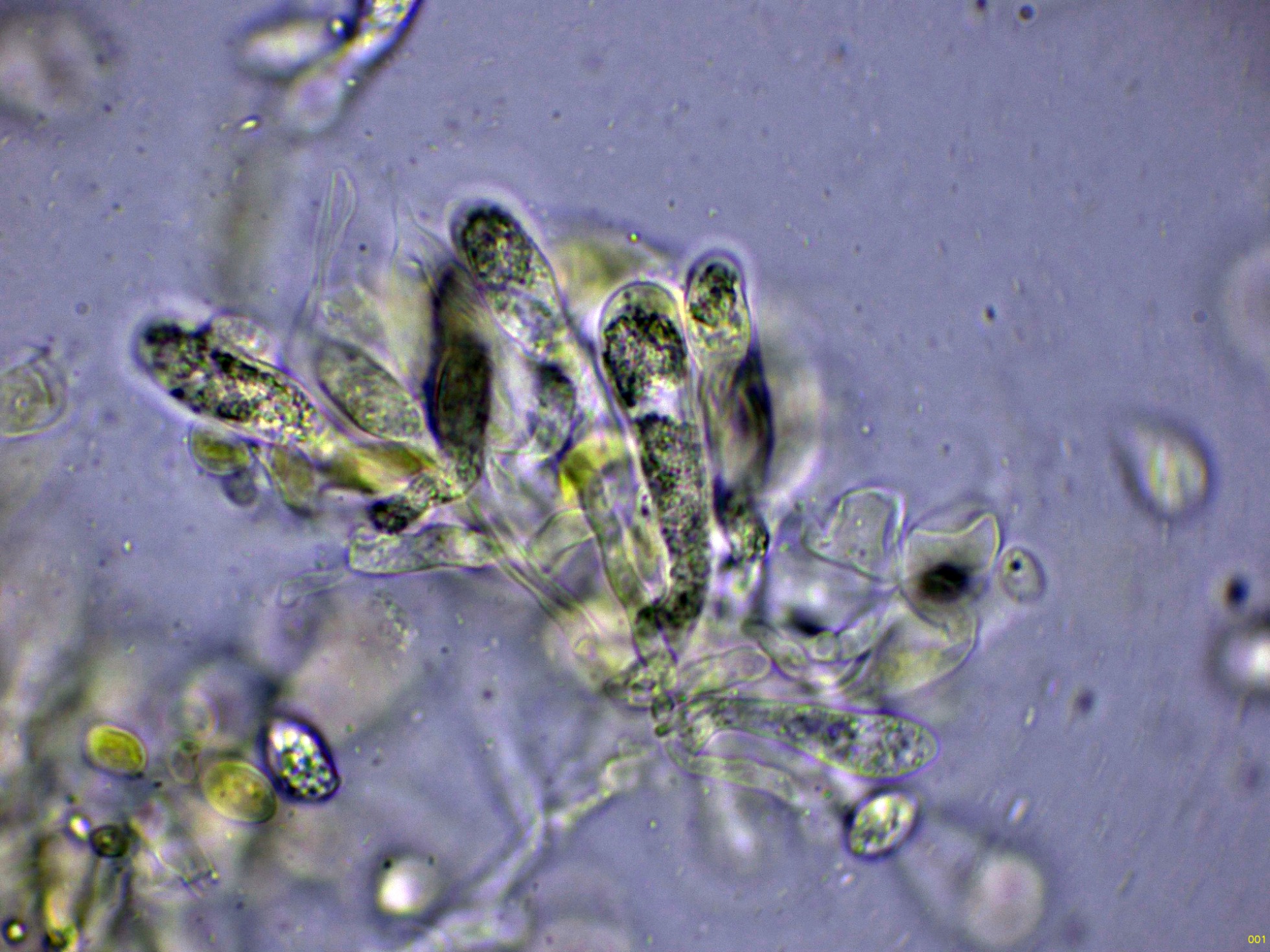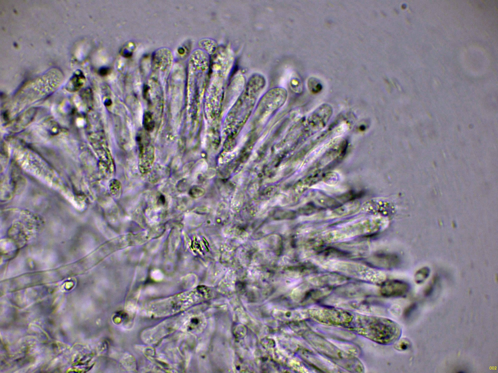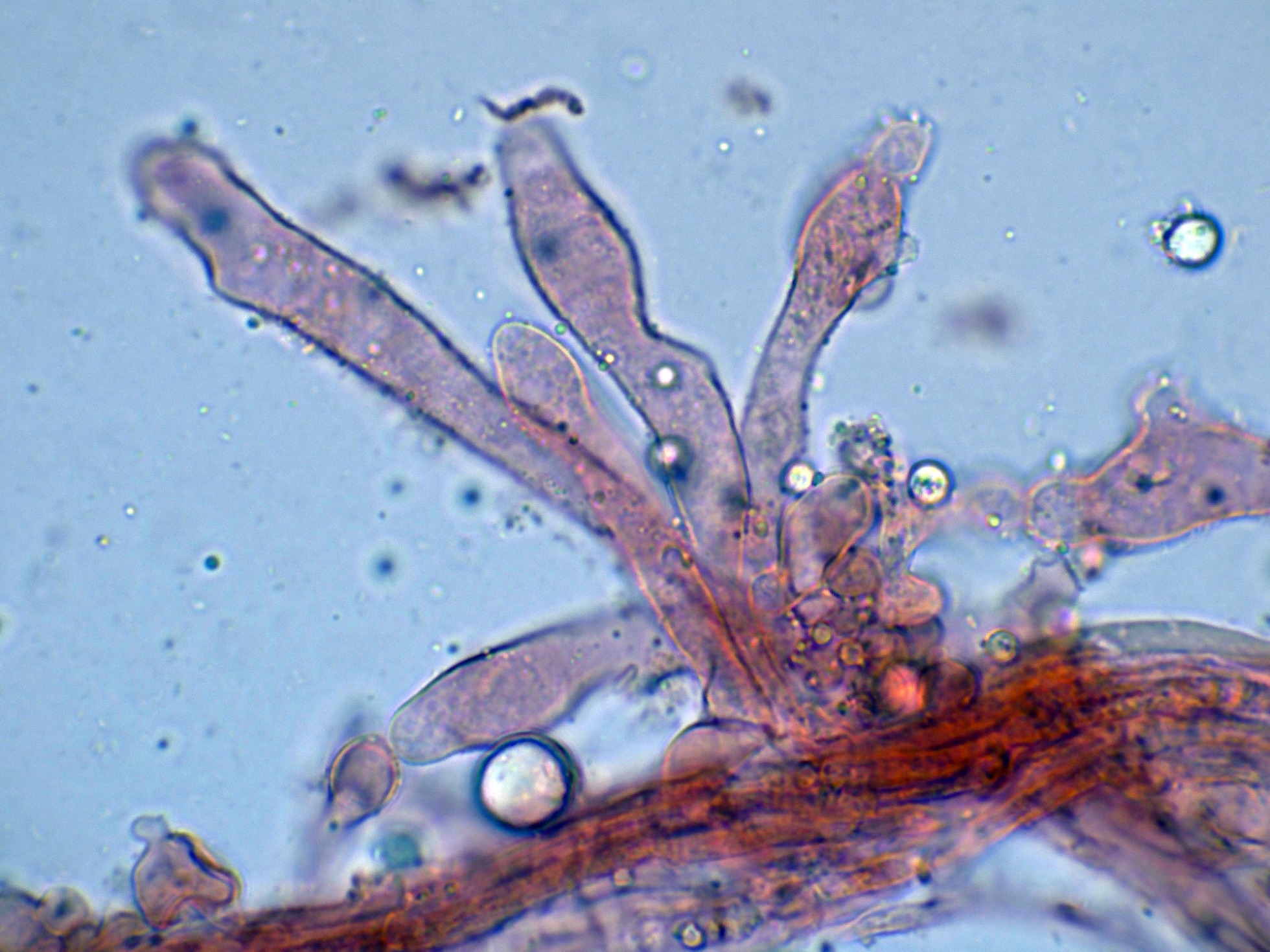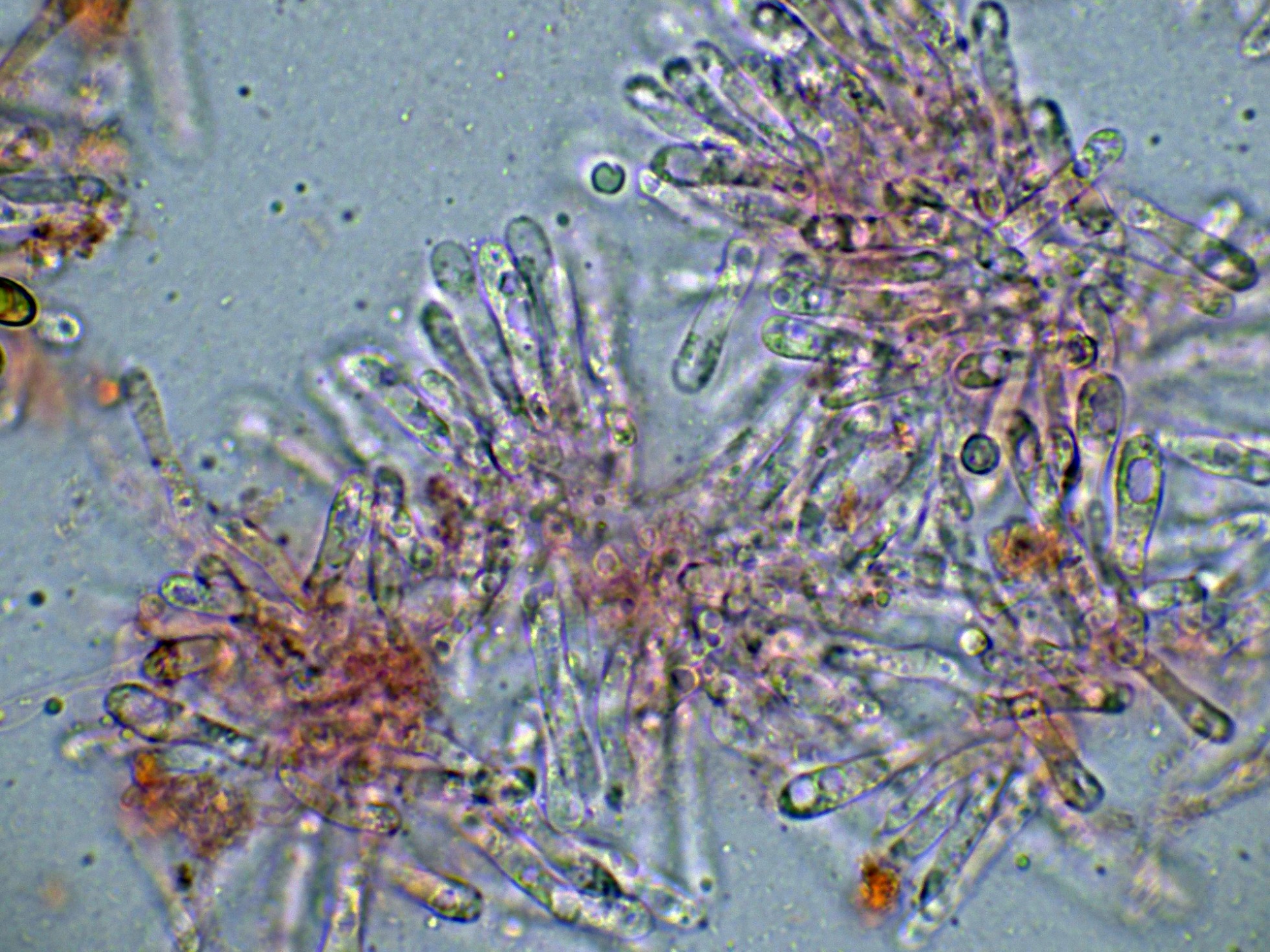 Los basidios en solución de KOH, sin ninguna tinción aparente: