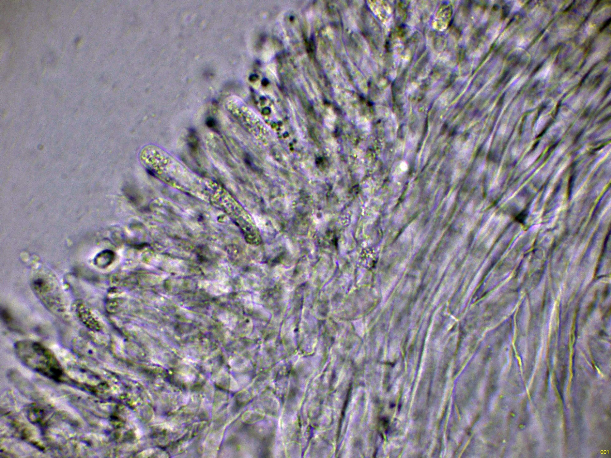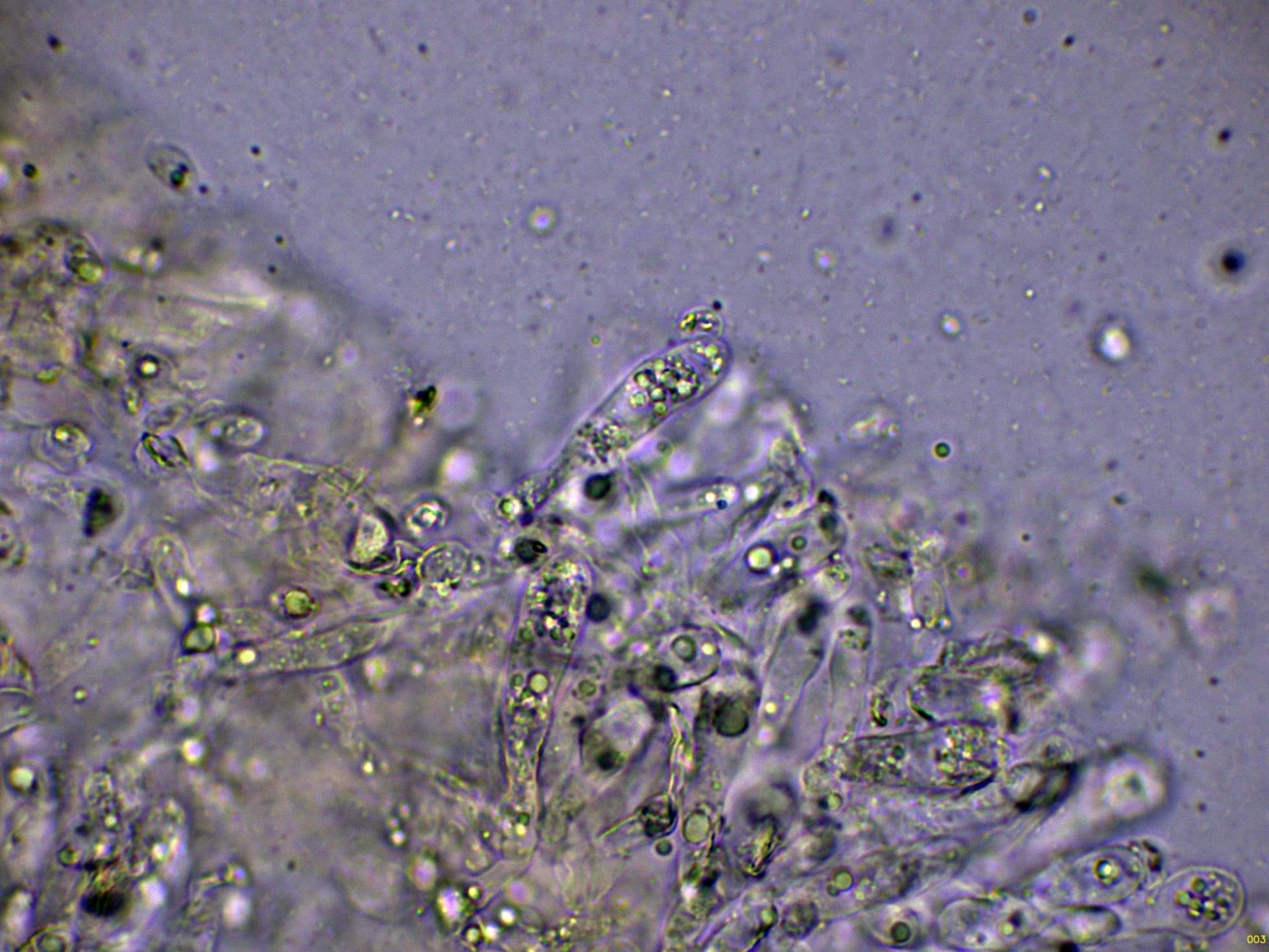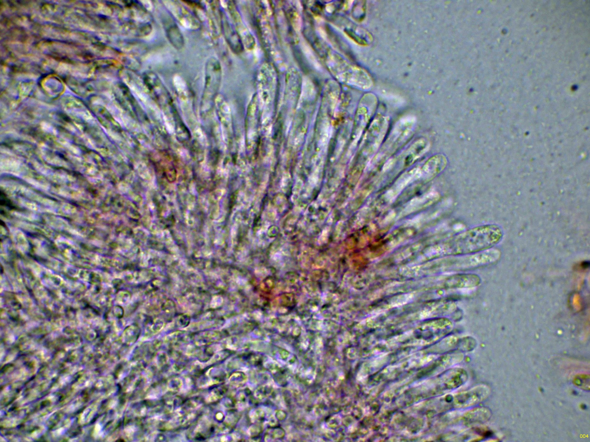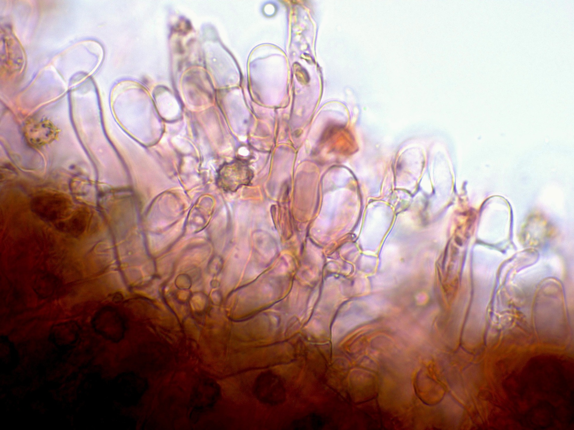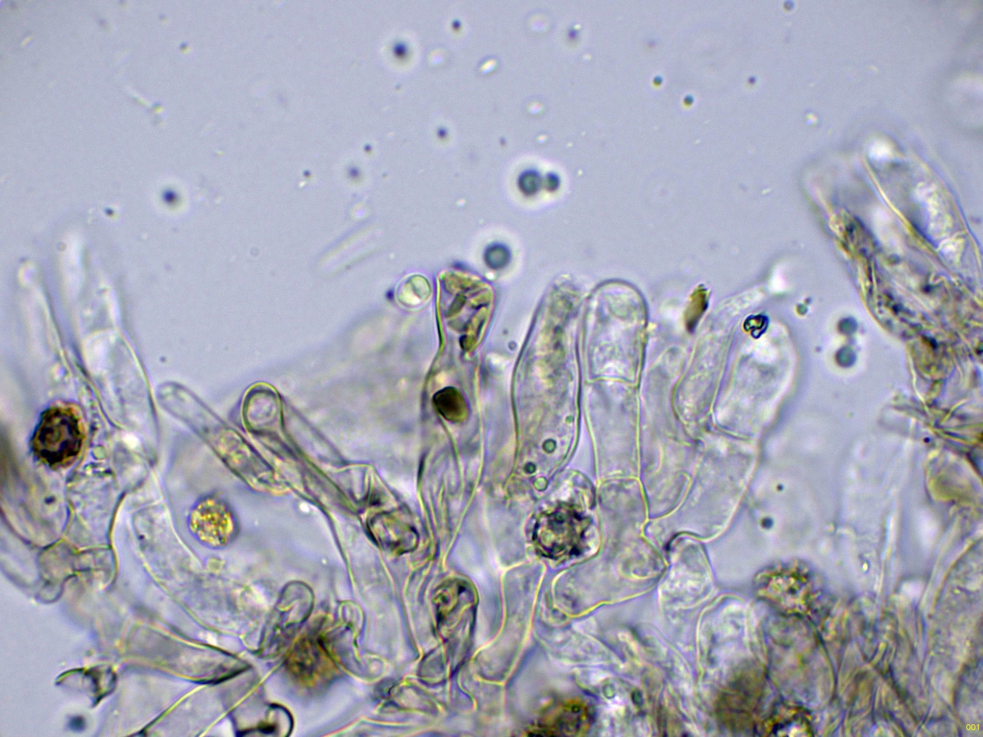 Los basidios en solución de KOH, sin ninguna tinción aparente: