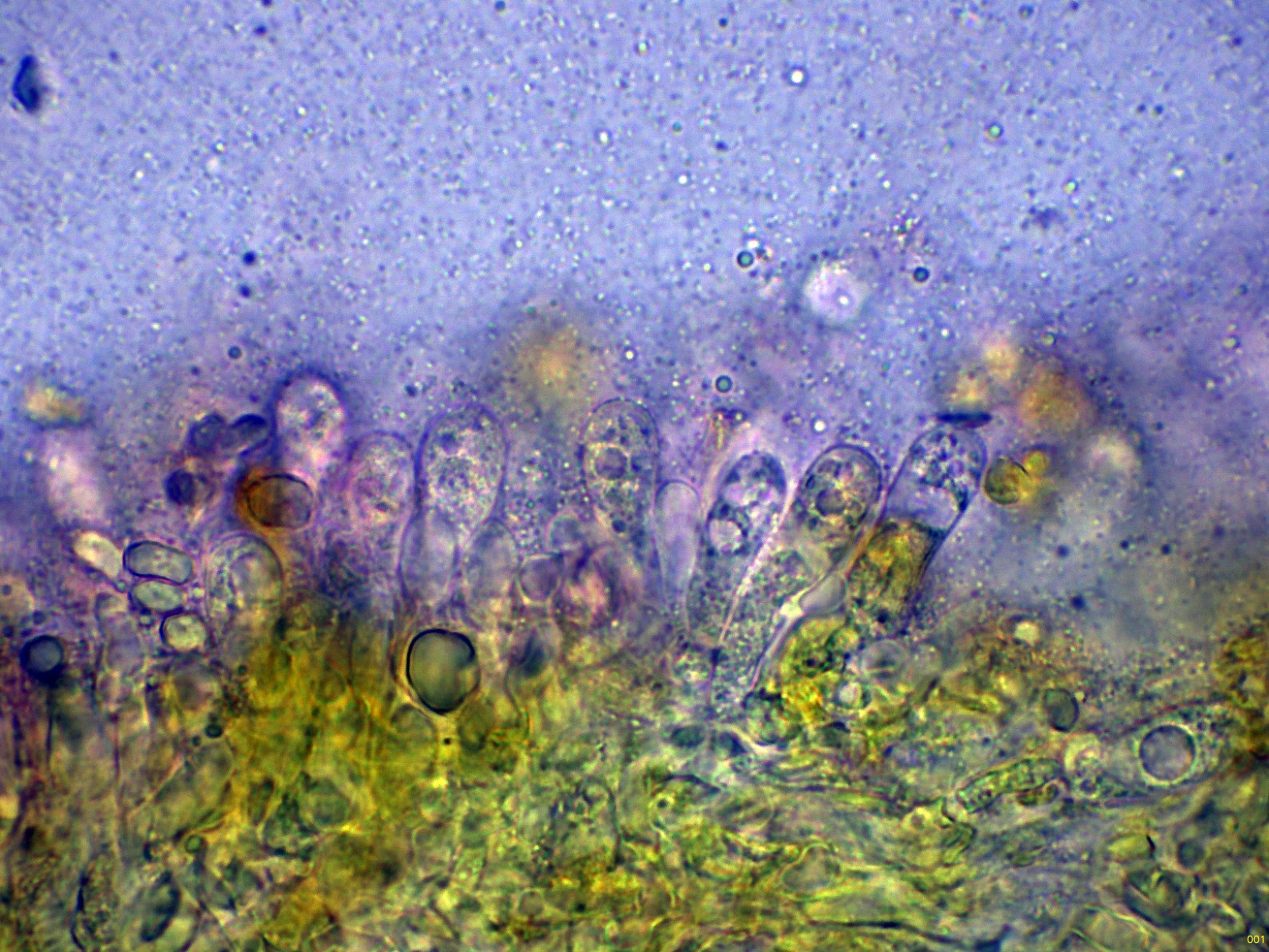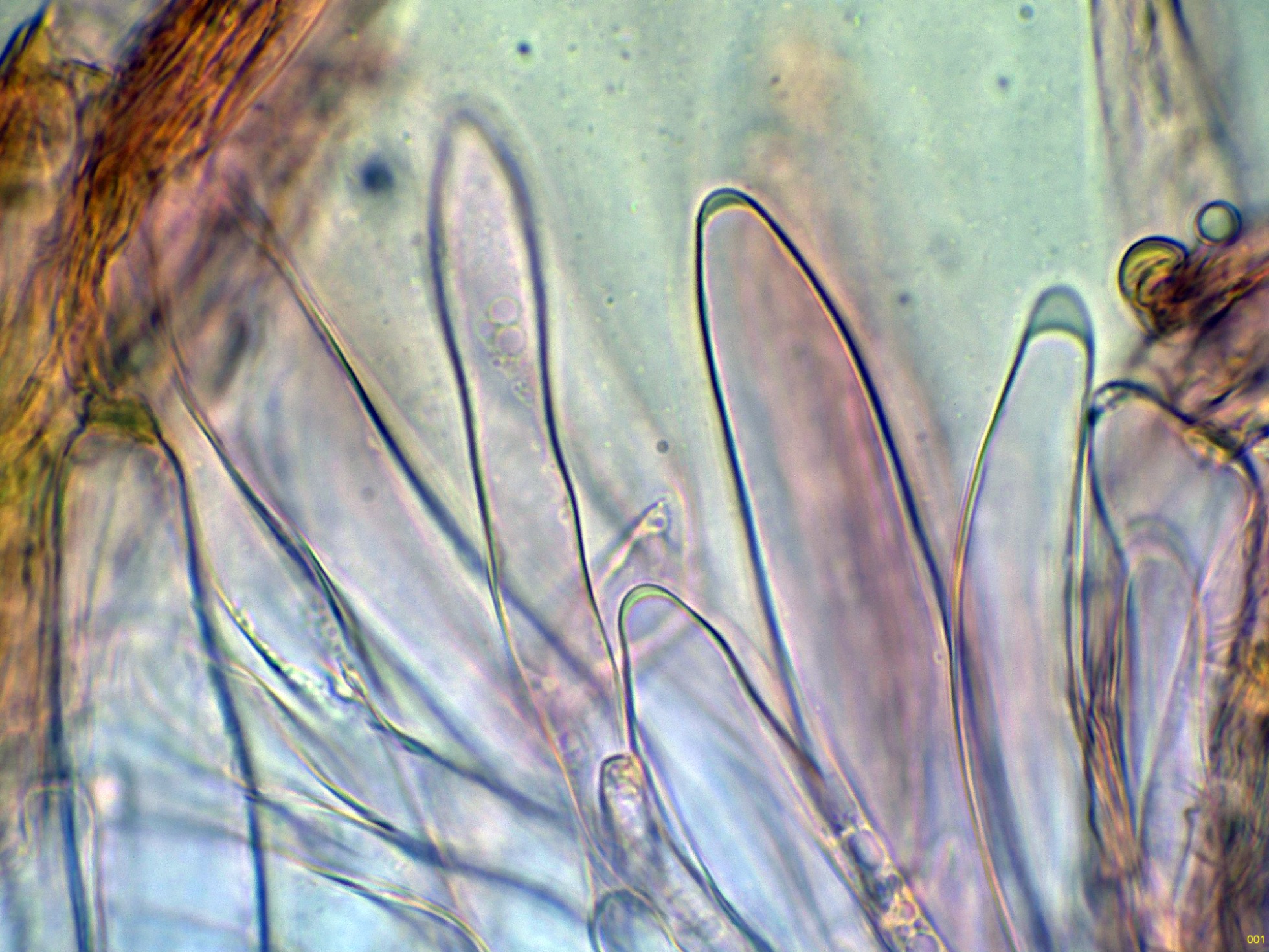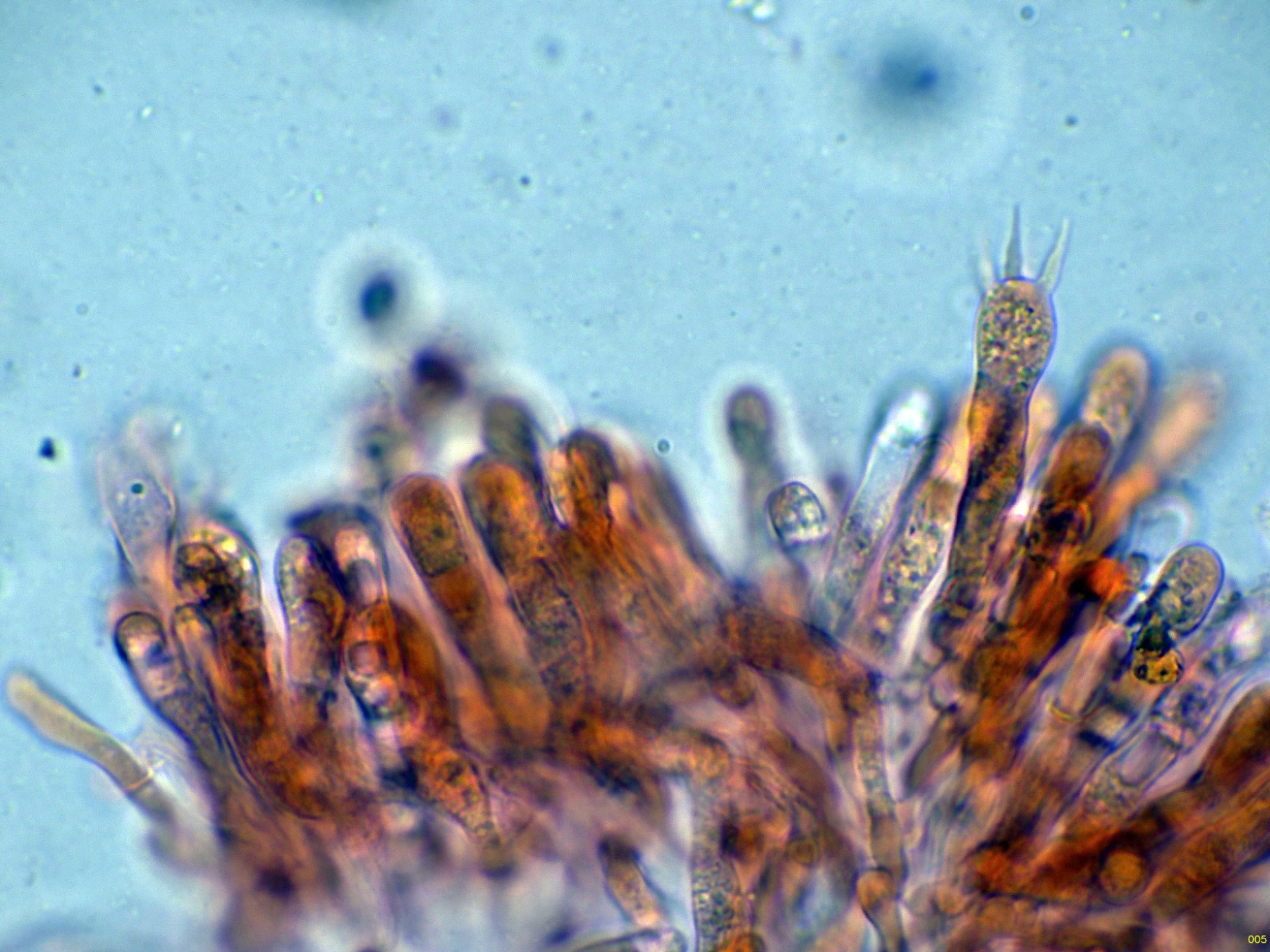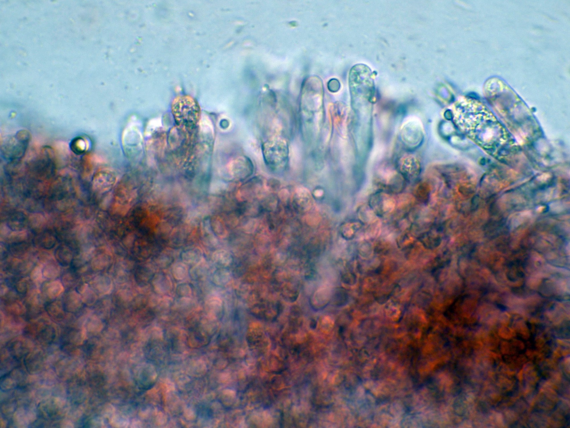 Los basidios en solución de KOH, sin ninguna tinción aparente: