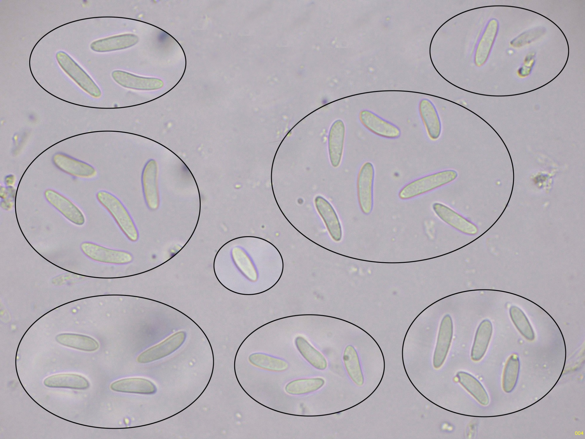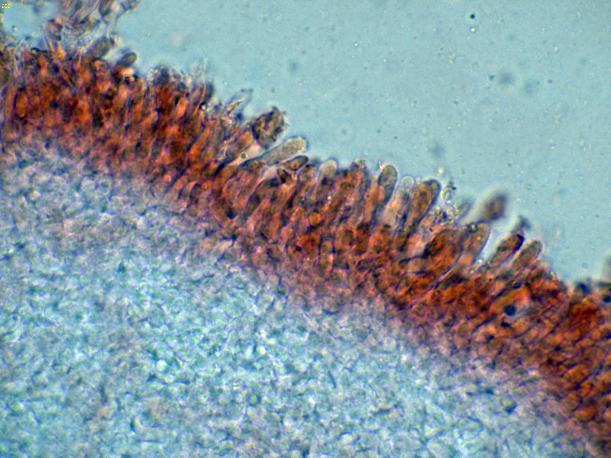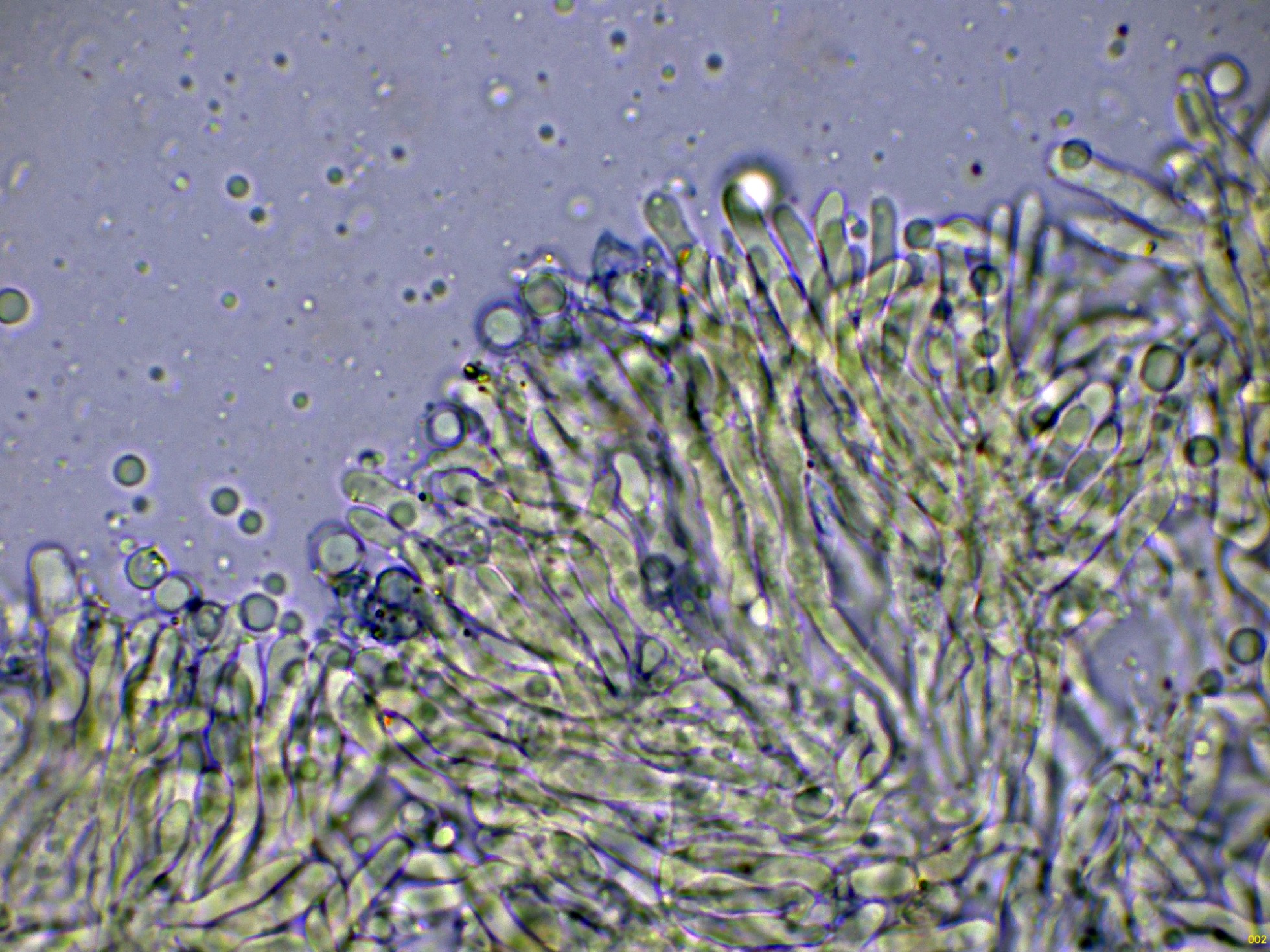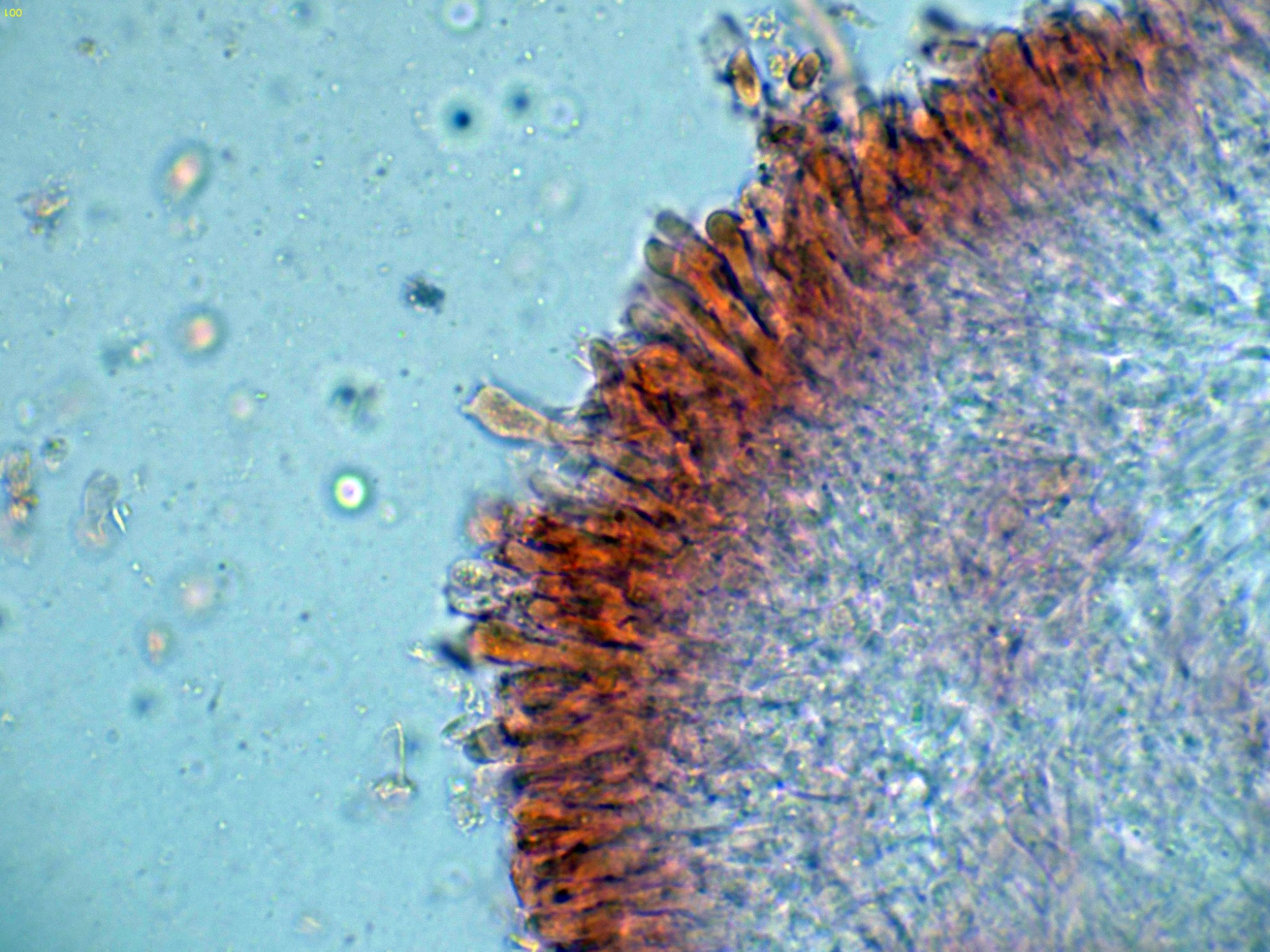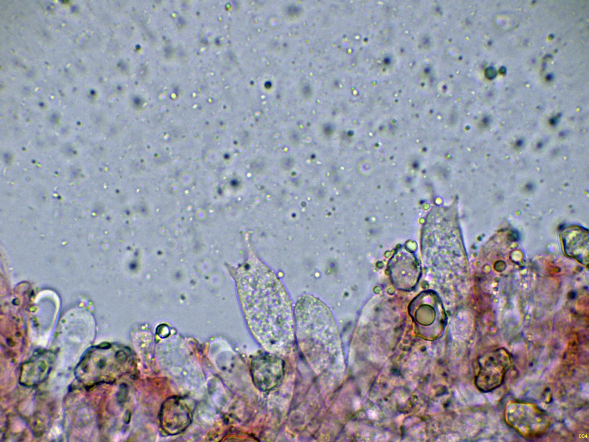 Estos queilocistidios con unas medidas de (26.2) 32 - 38.8 (39.5) × (4.2) 4.3 - 5.3 (6) µm.