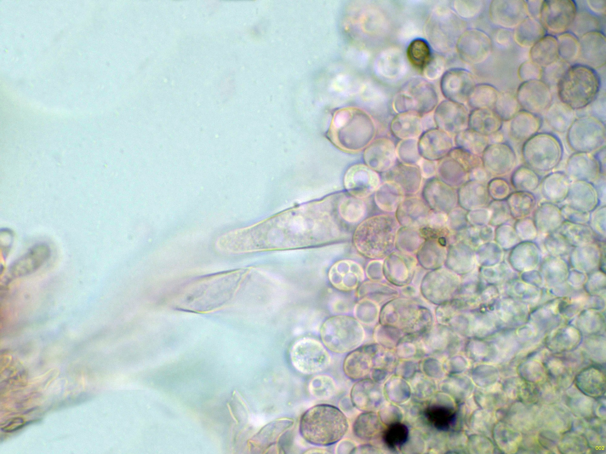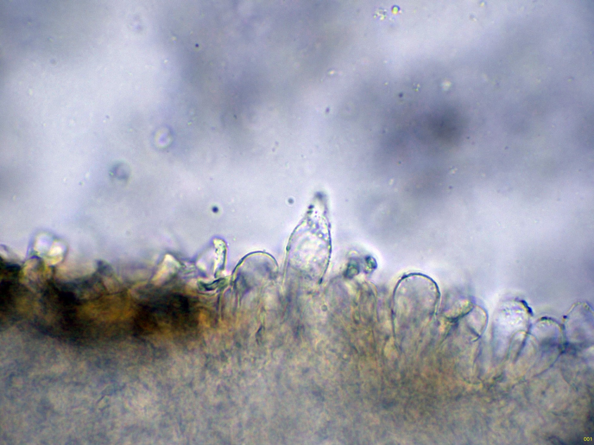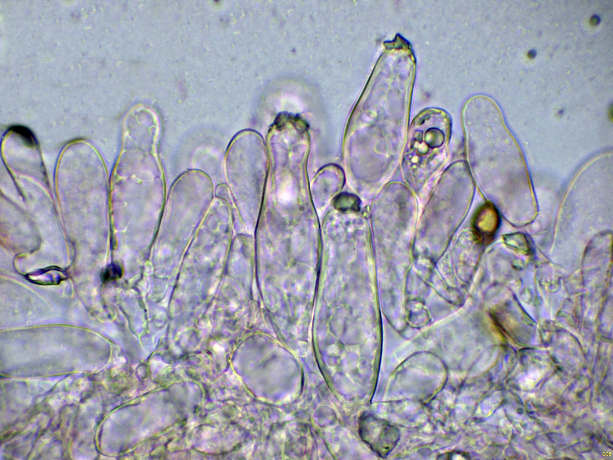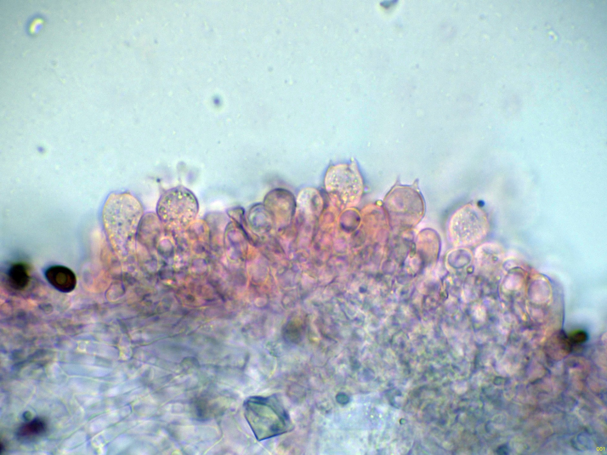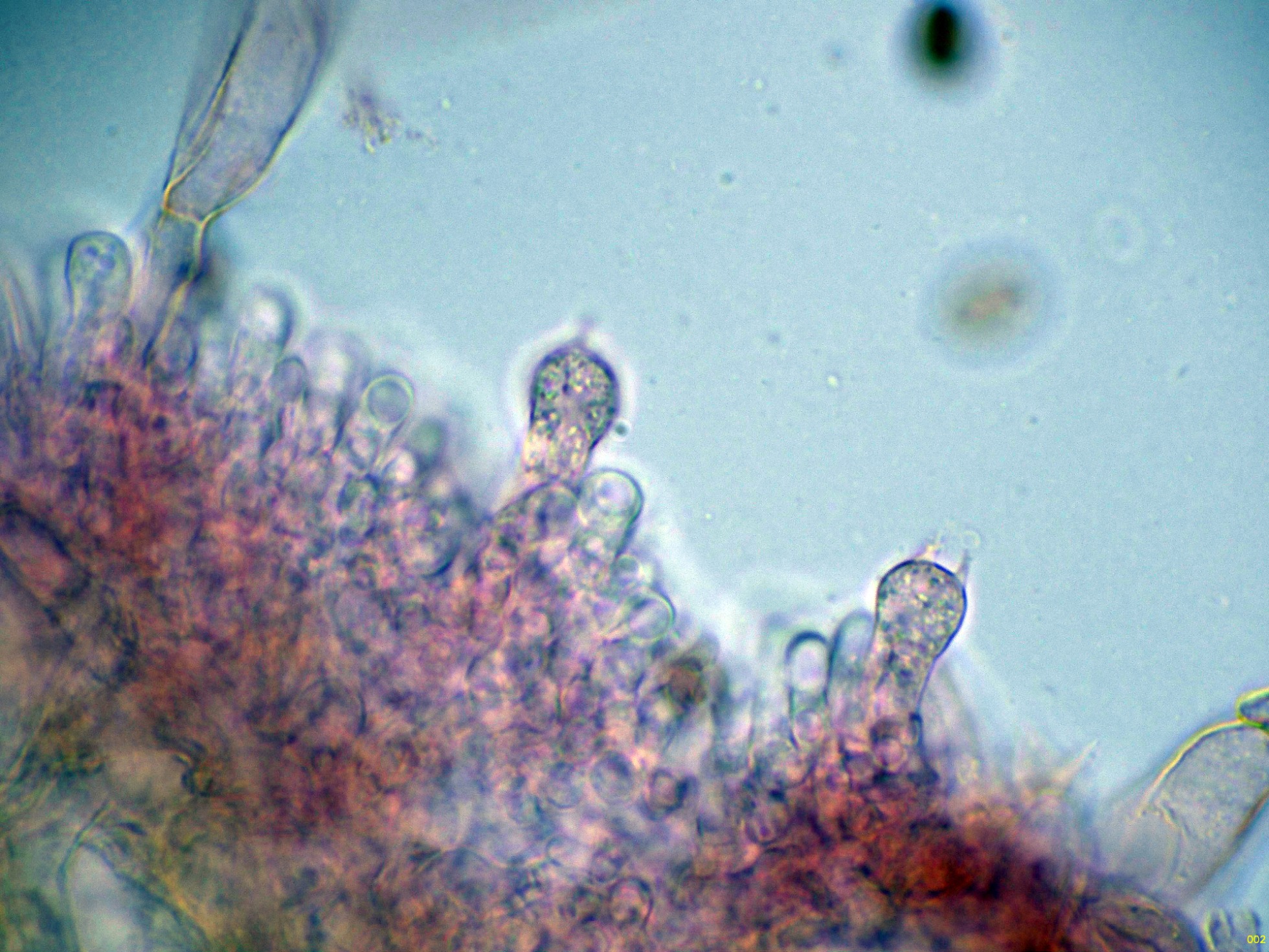 Queilocistidios muy abundantes que dejan prácticamente estéril la arista laminar, estos queilocistidios con unas medidas de (40) 43.6 - 57.8 (68.5) × (11.8) 12.1 - 16.4 (19) µm., con una media de Me = 50.6 × 14.6 µm: