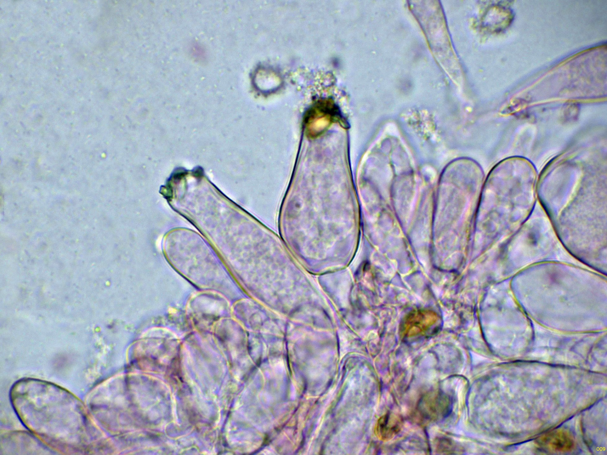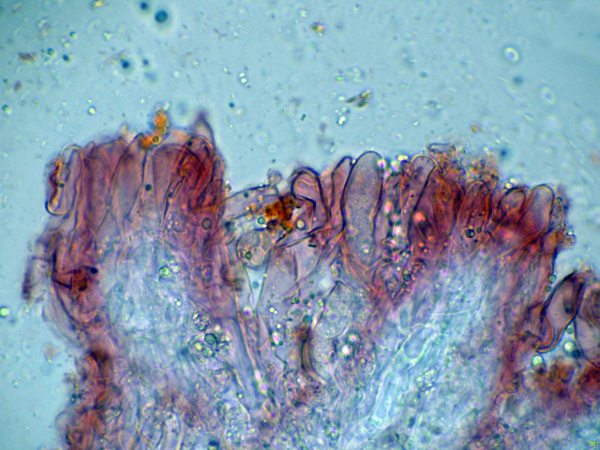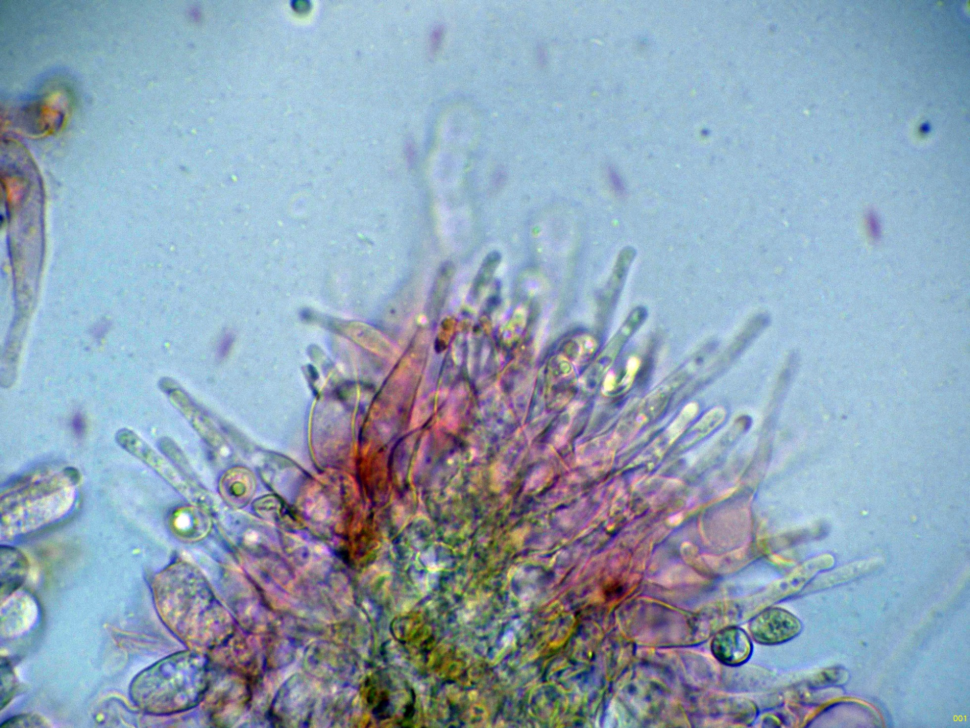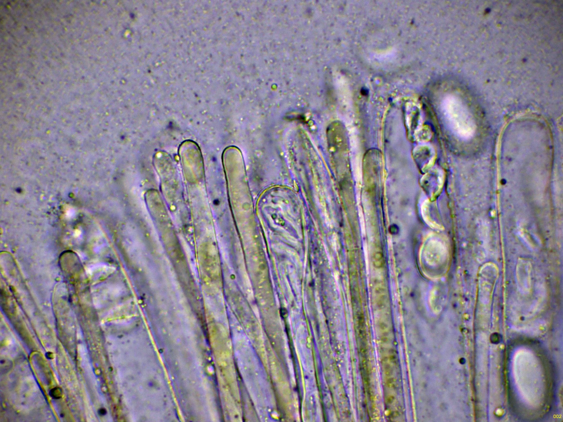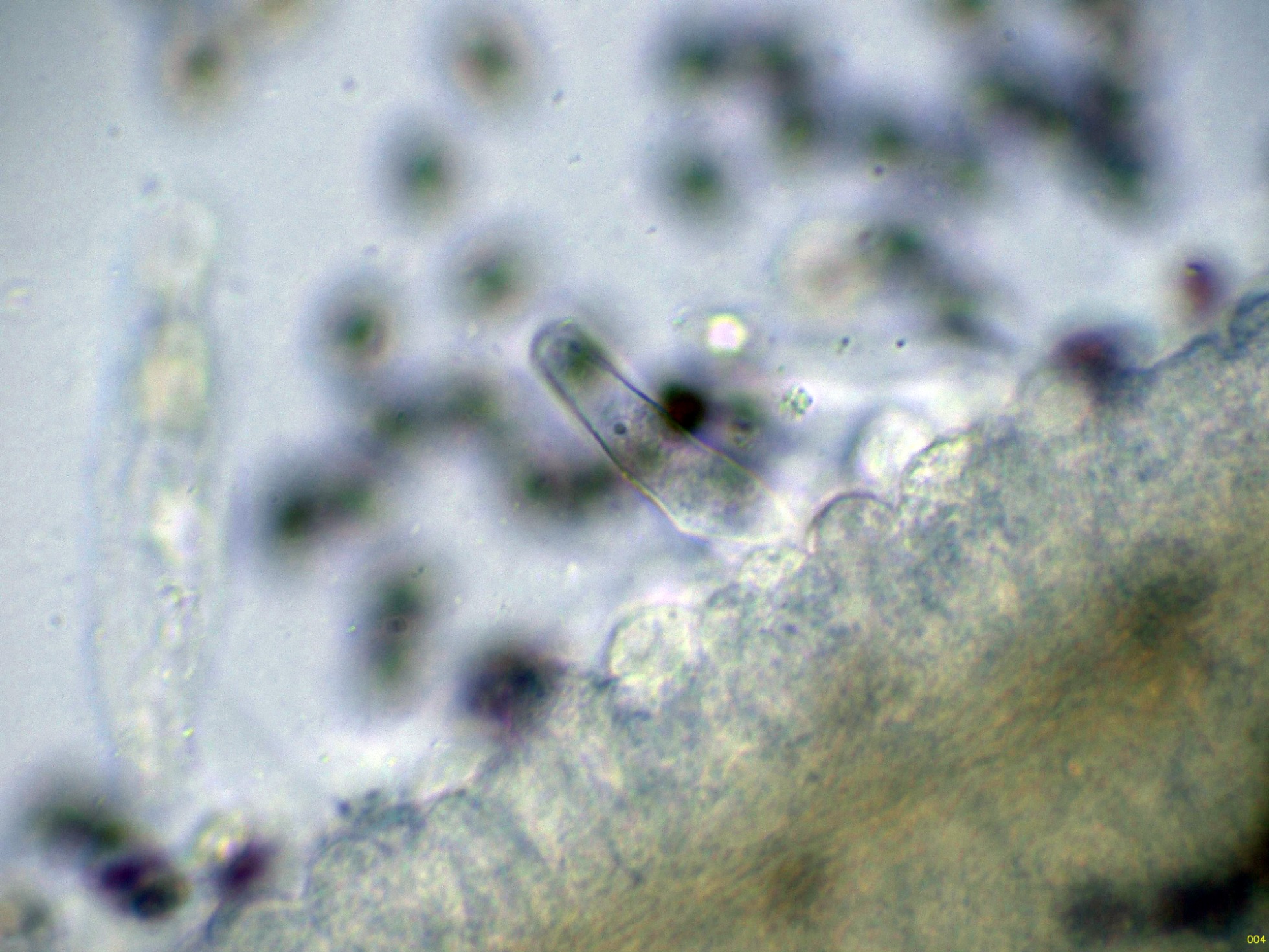 Queilocistidios muy abundantes que dejan prácticamente estéril la arista laminar, estos queilocistidios con unas medidas de (40) 43.6 - 57.8 (68.5) × (11.8) 12.1 - 16.4 (19) µm., con una media de Me = 50.6 × 14.6 µm: