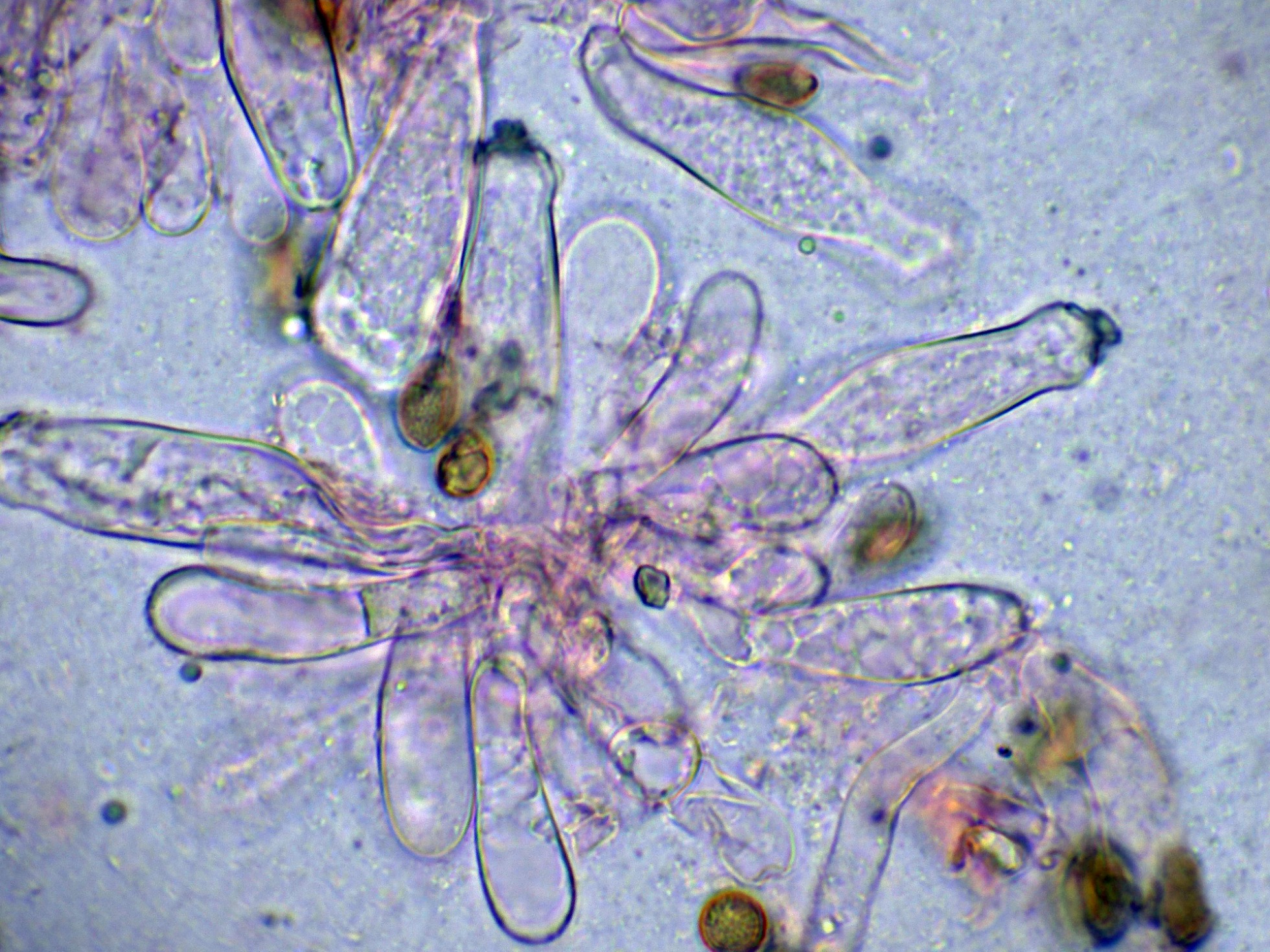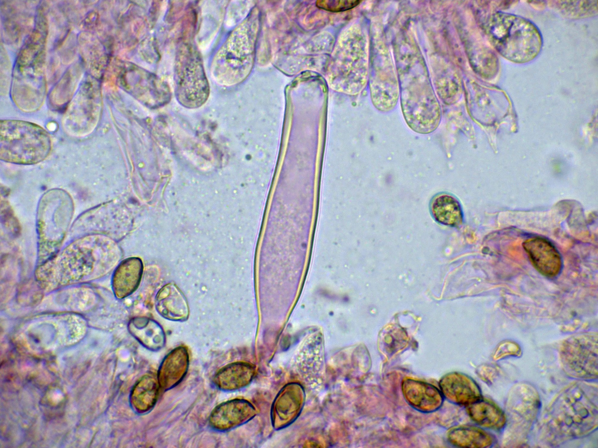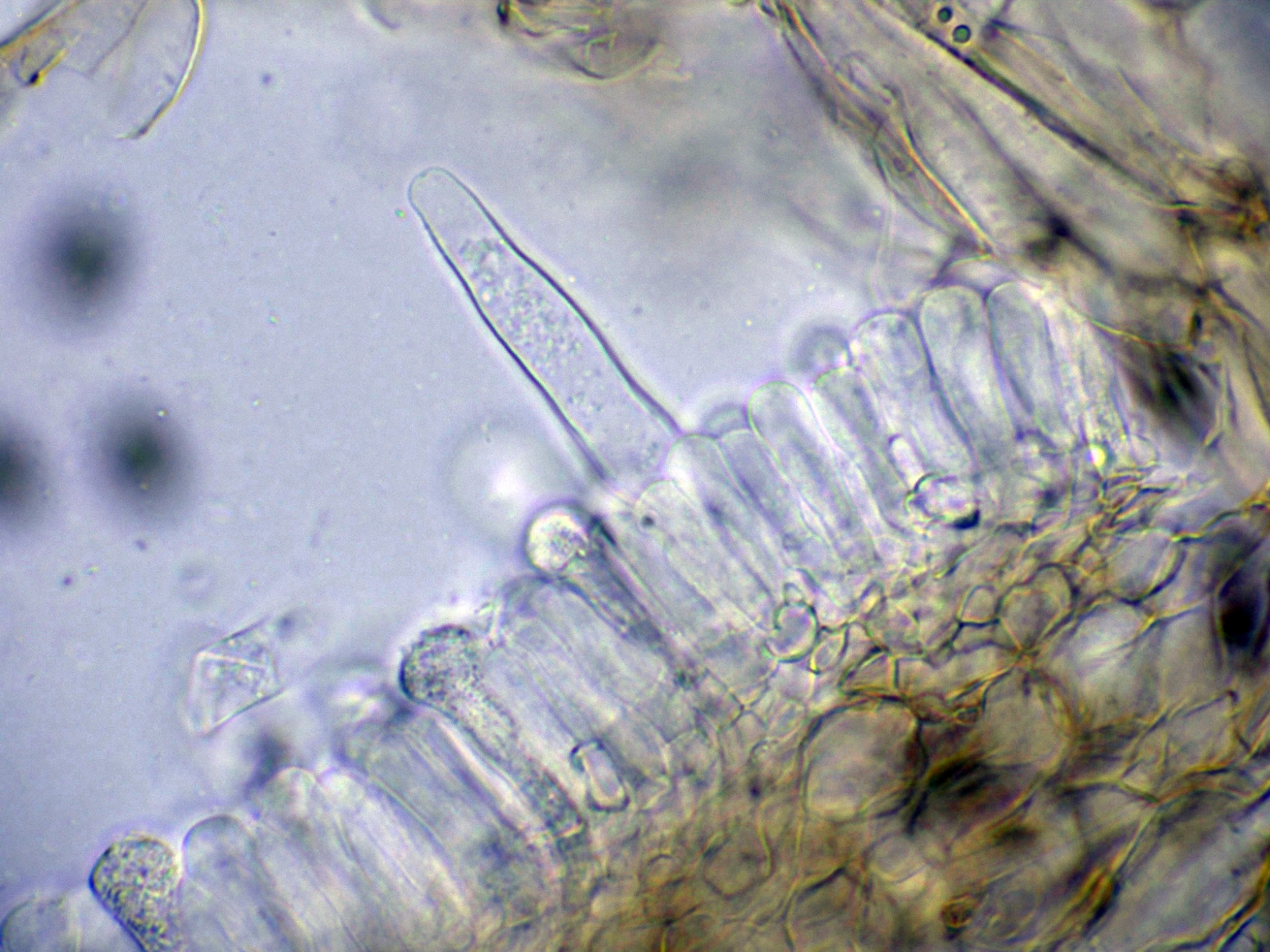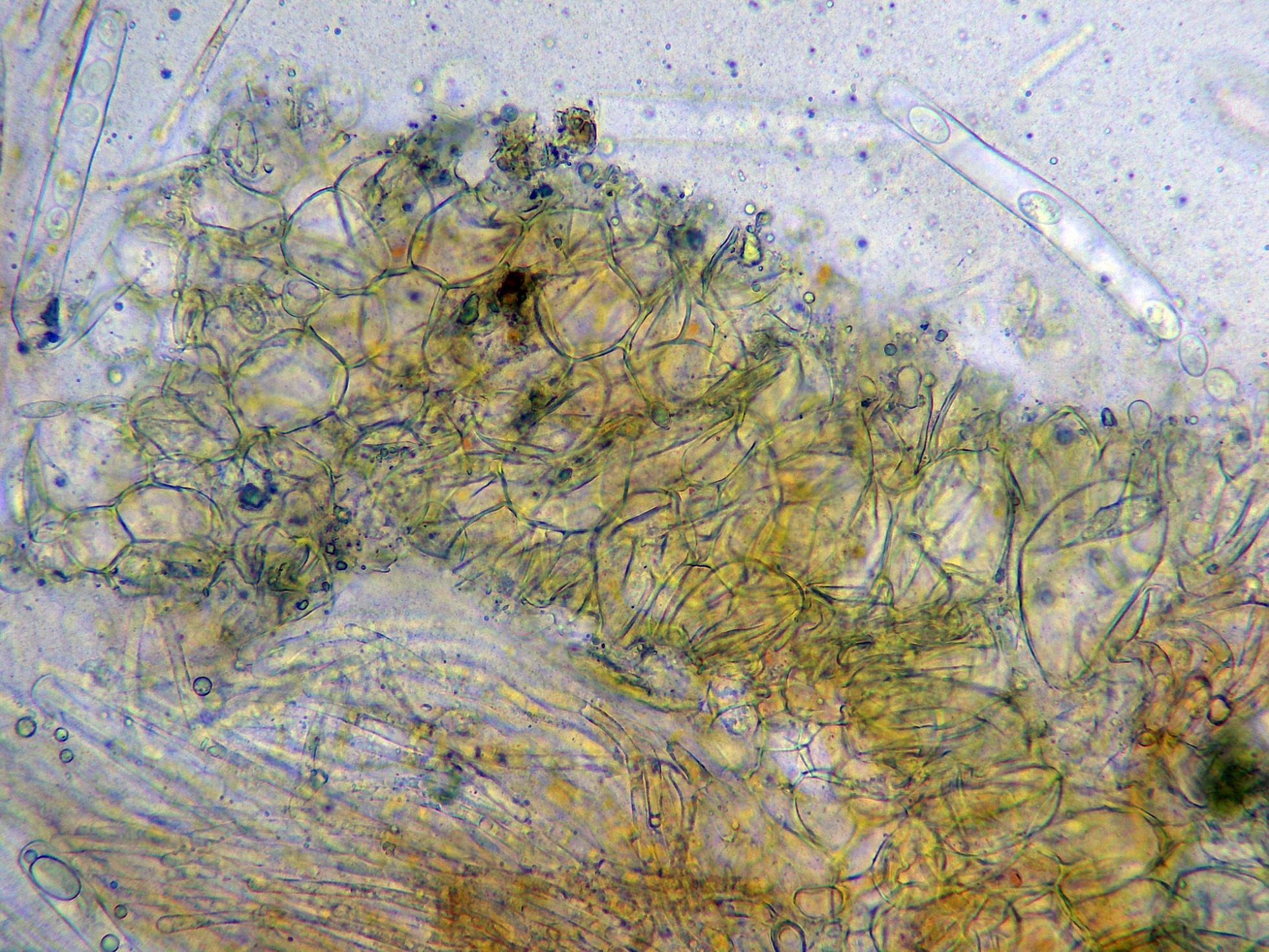 Queilocistidios muy abundantes que dejan prácticamente estéril la arista laminar, estos queilocistidios con unas medidas de (40) 43.6 - 57.8 (68.5) × (11.8) 12.1 - 16.4 (19) µm., con una media de Me = 50.6 × 14.6 µm: