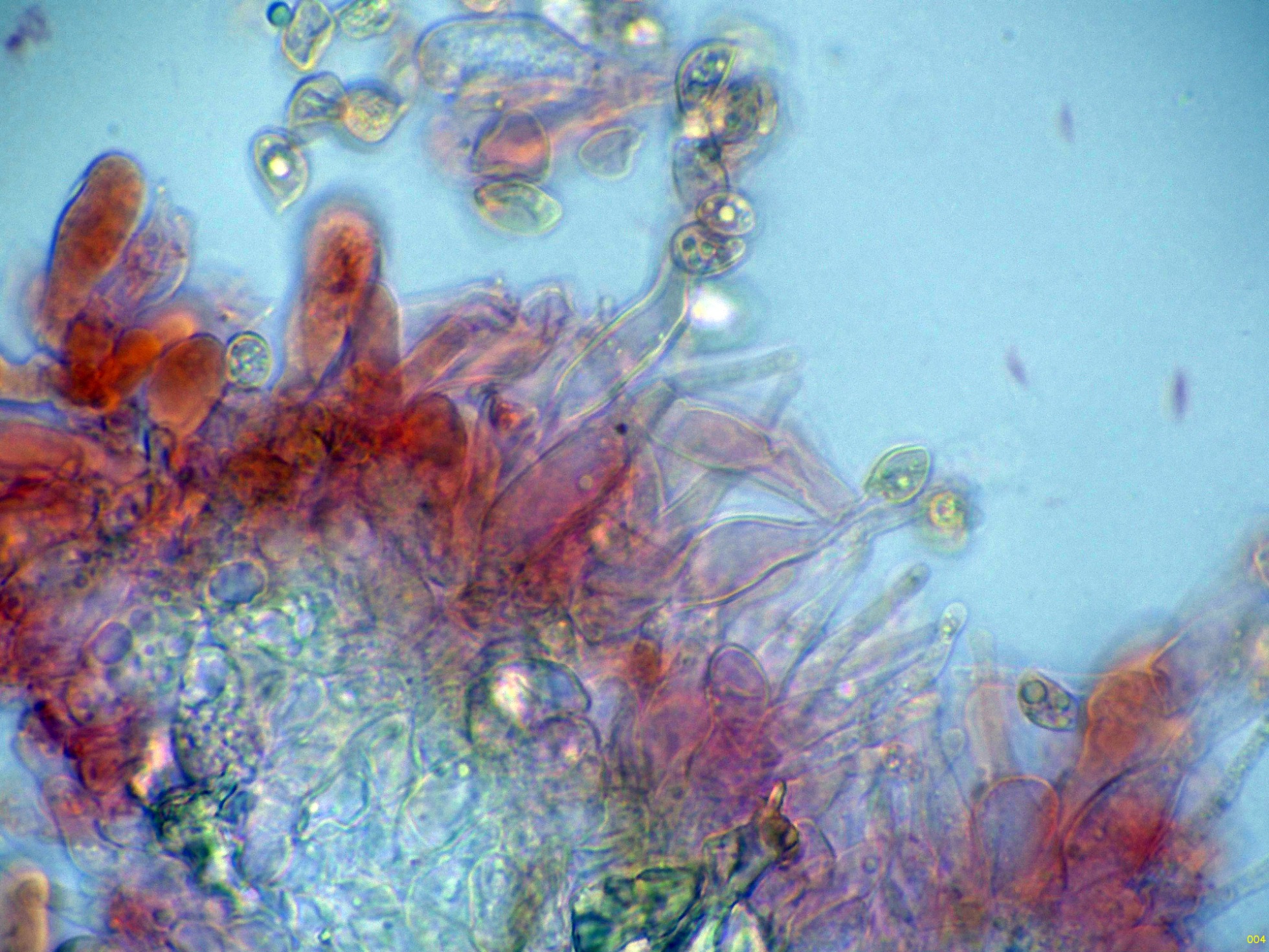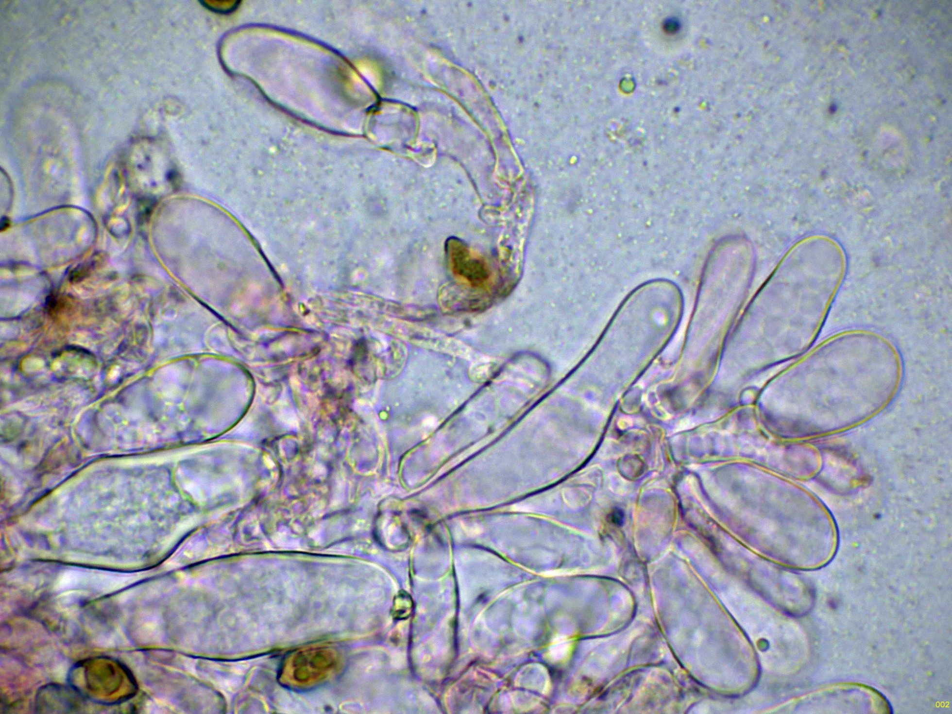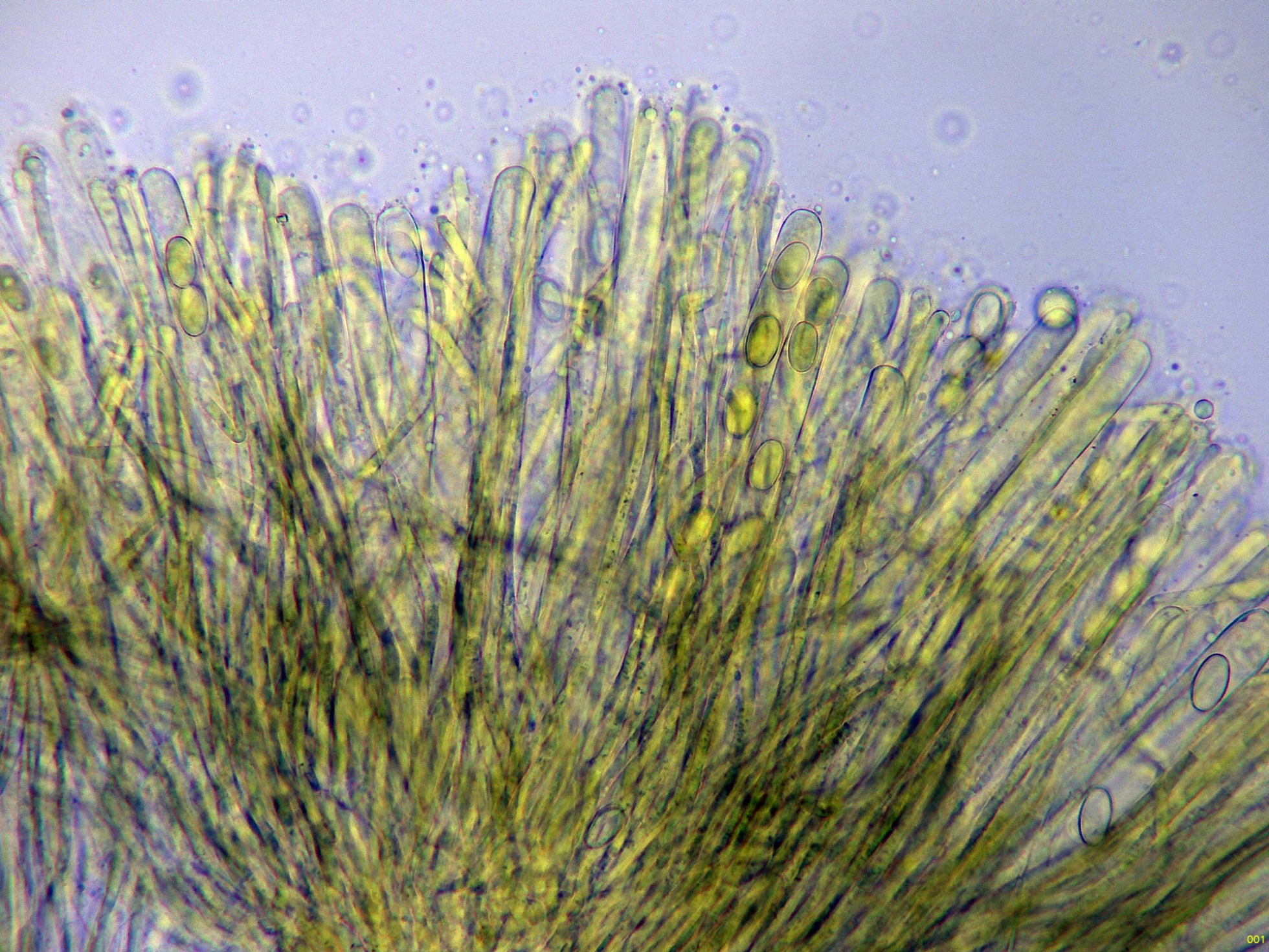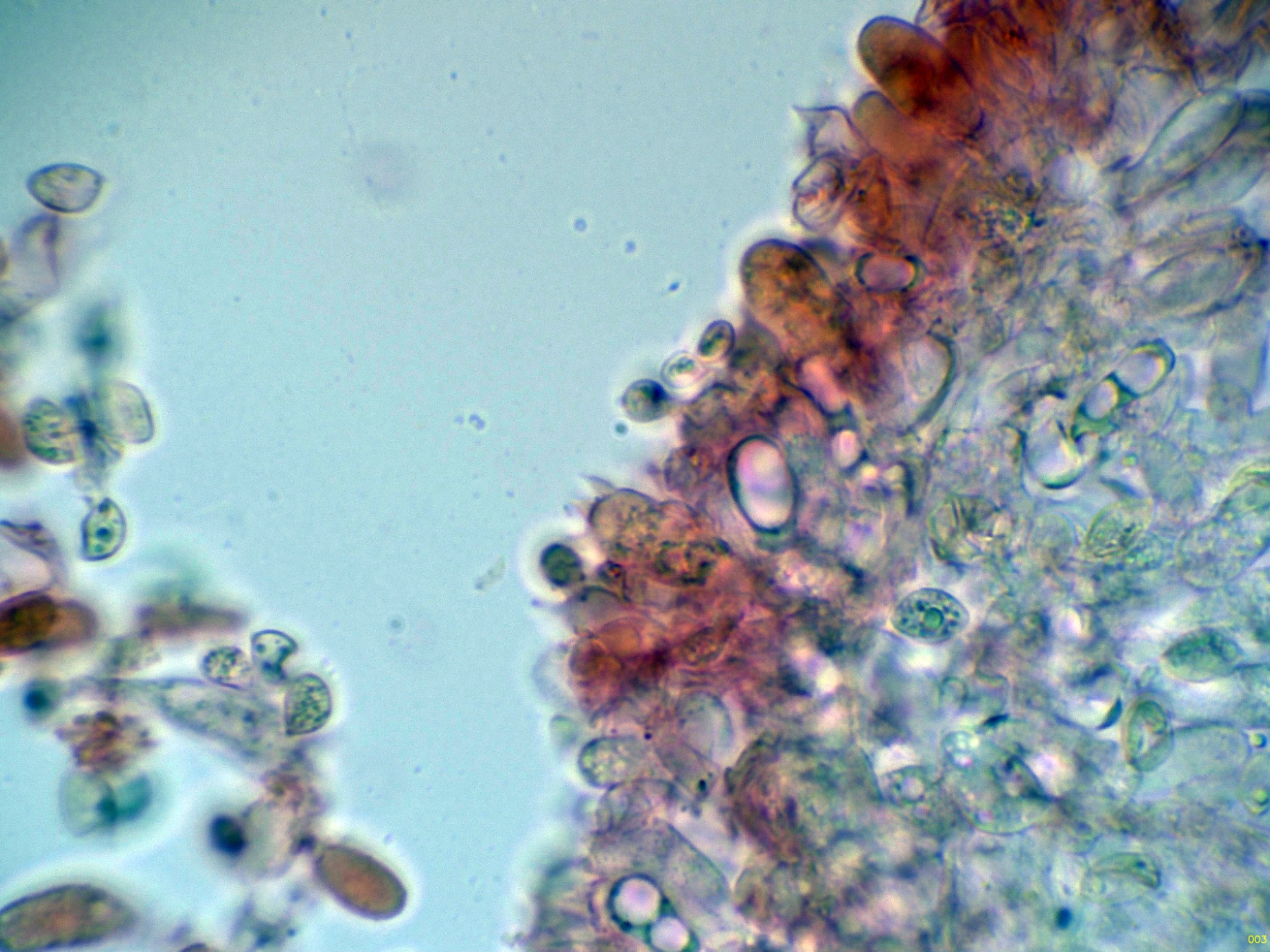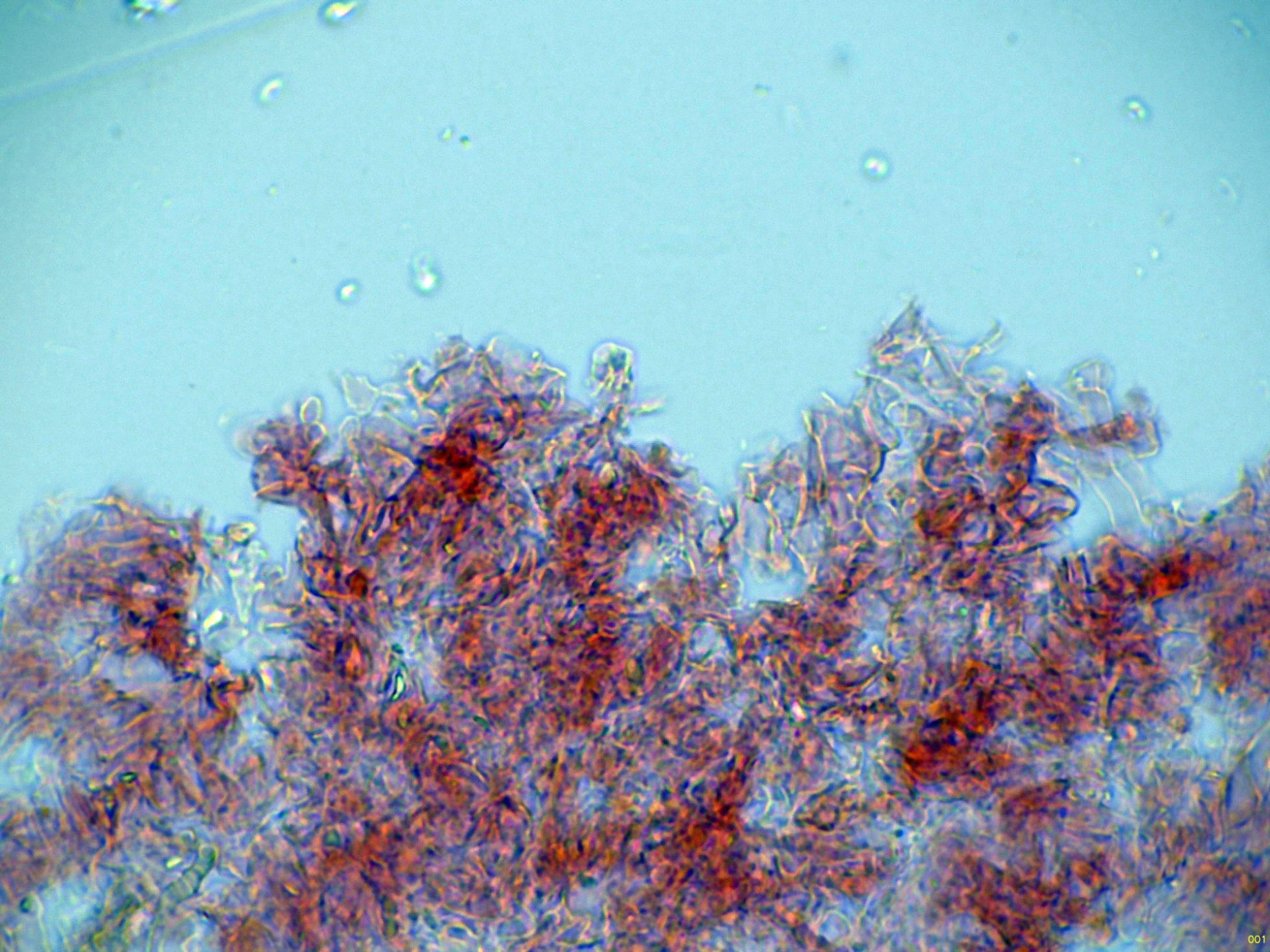 Queilocistidios muy abundantes que dejan prácticamente estéril la arista laminar, estos queilocistidios con unas medidas de (40) 43.6 - 57.8 (68.5) × (11.8) 12.1 - 16.4 (19) µm., con una media de Me = 50.6 × 14.6 µm: