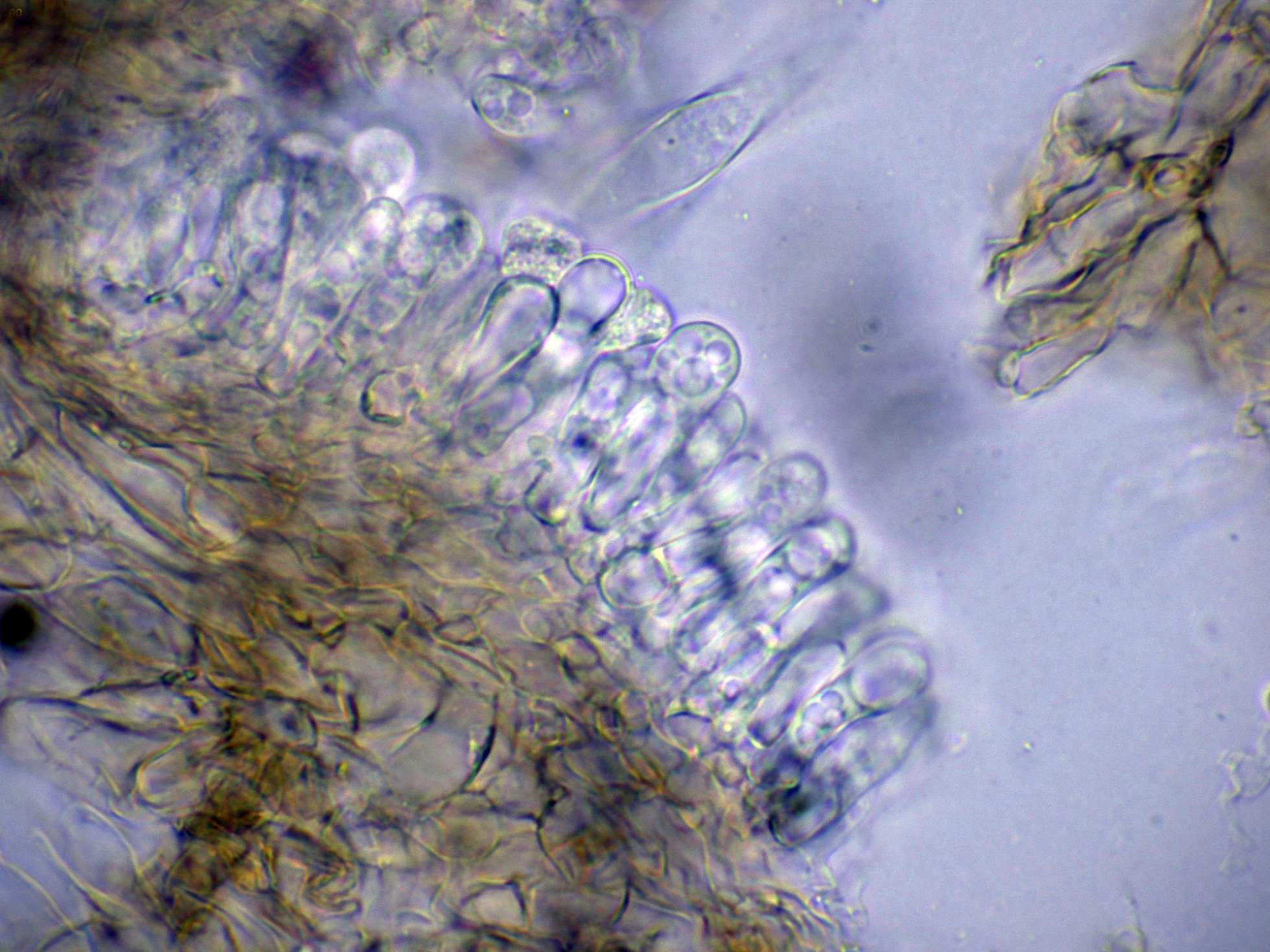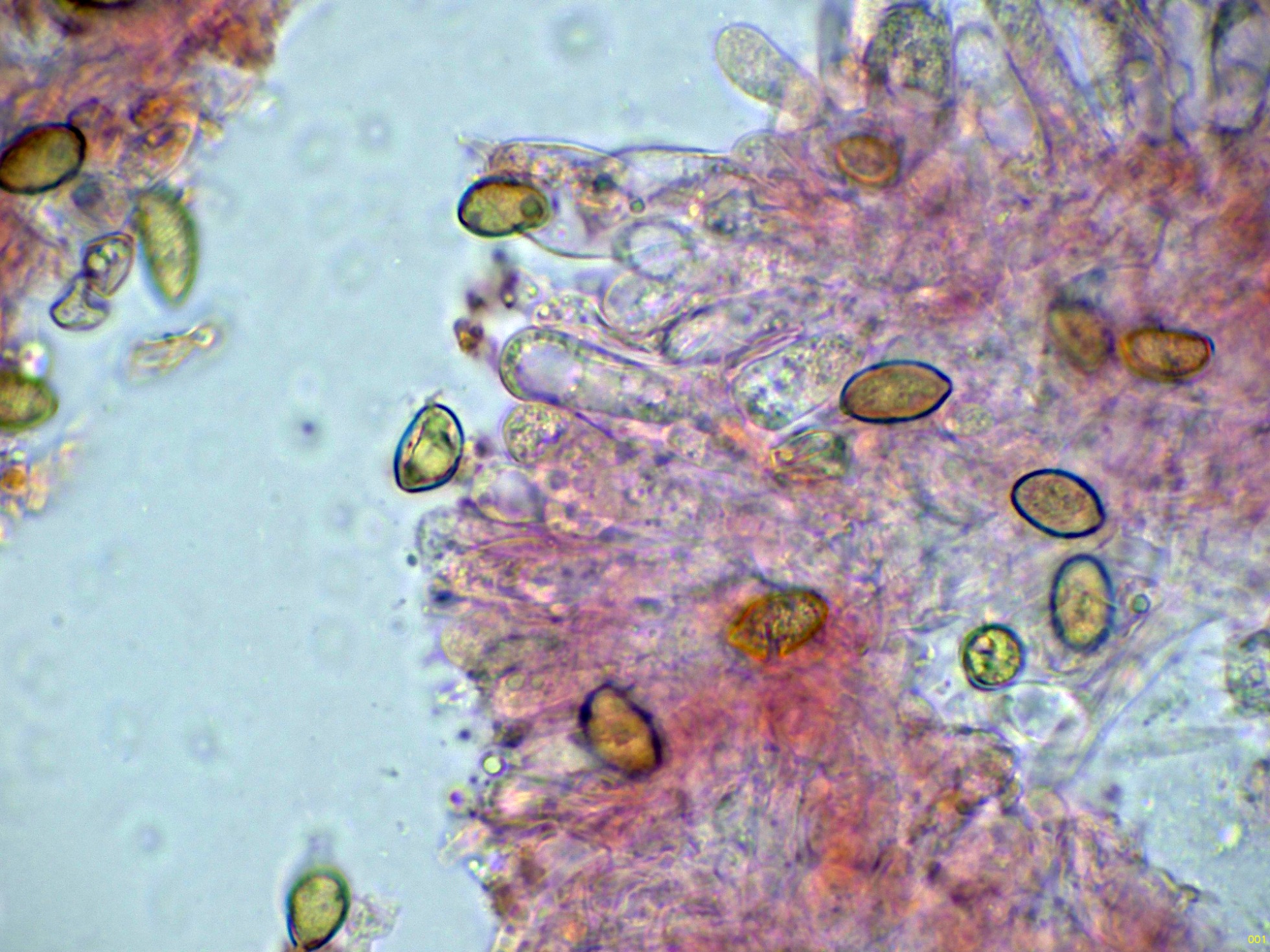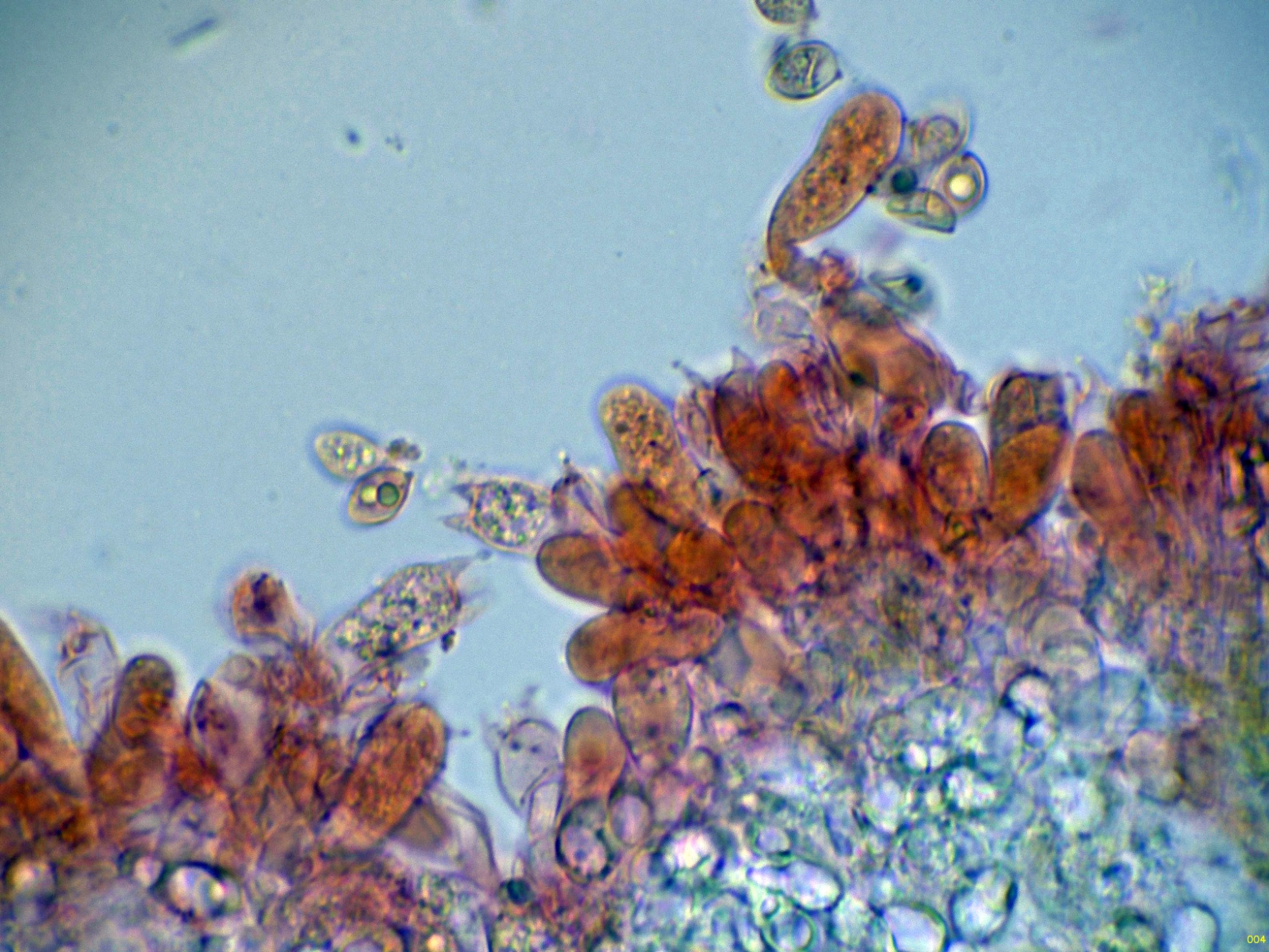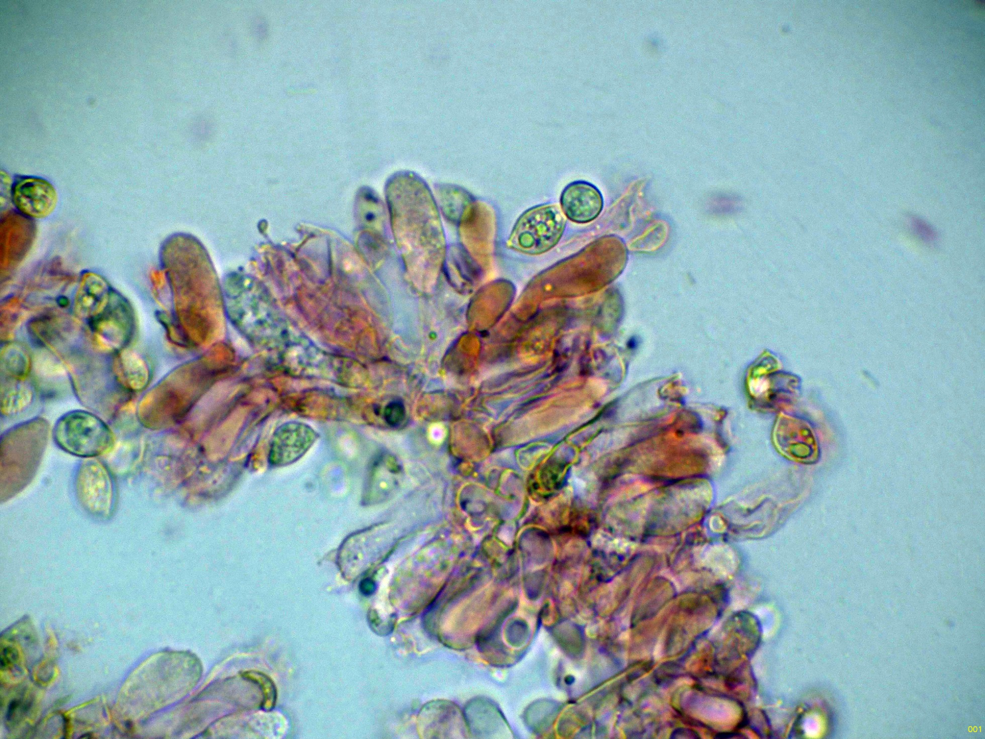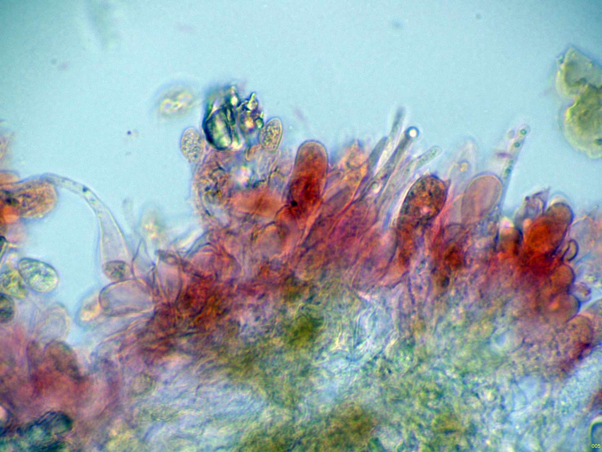 Queilocistidios muy abundantes que dejan prácticamente estéril la arista laminar, estos queilocistidios con unas medidas de (40) 43.6 - 57.8 (68.5) × (11.8) 12.1 - 16.4 (19) µm., con una media de Me = 50.6 × 14.6 µm: