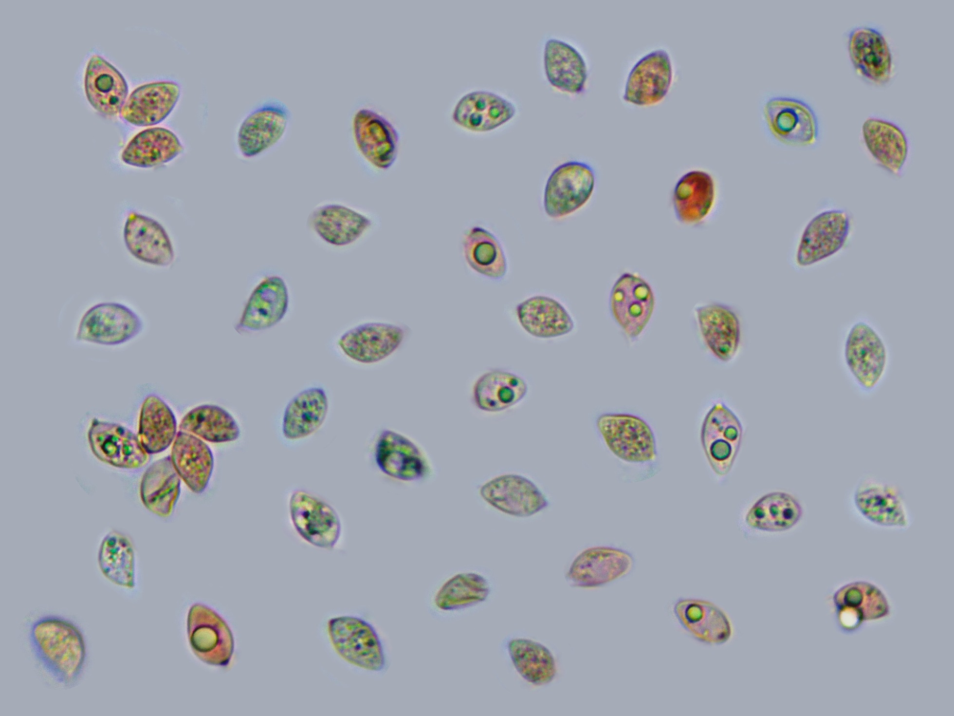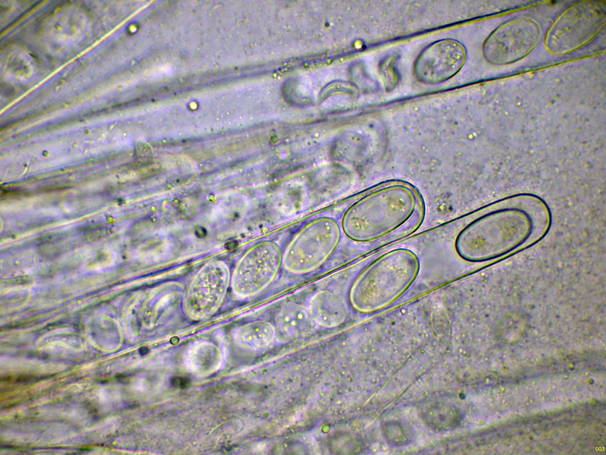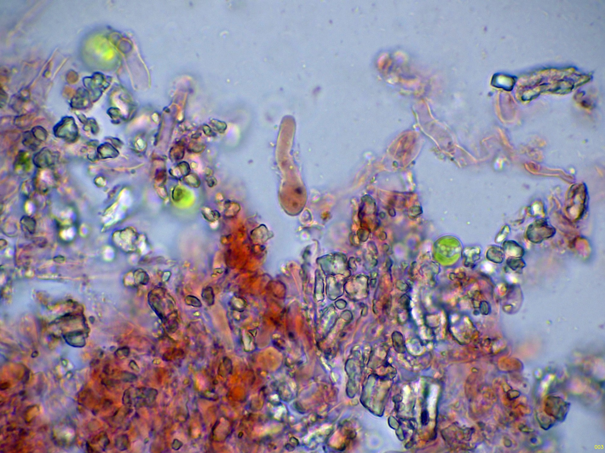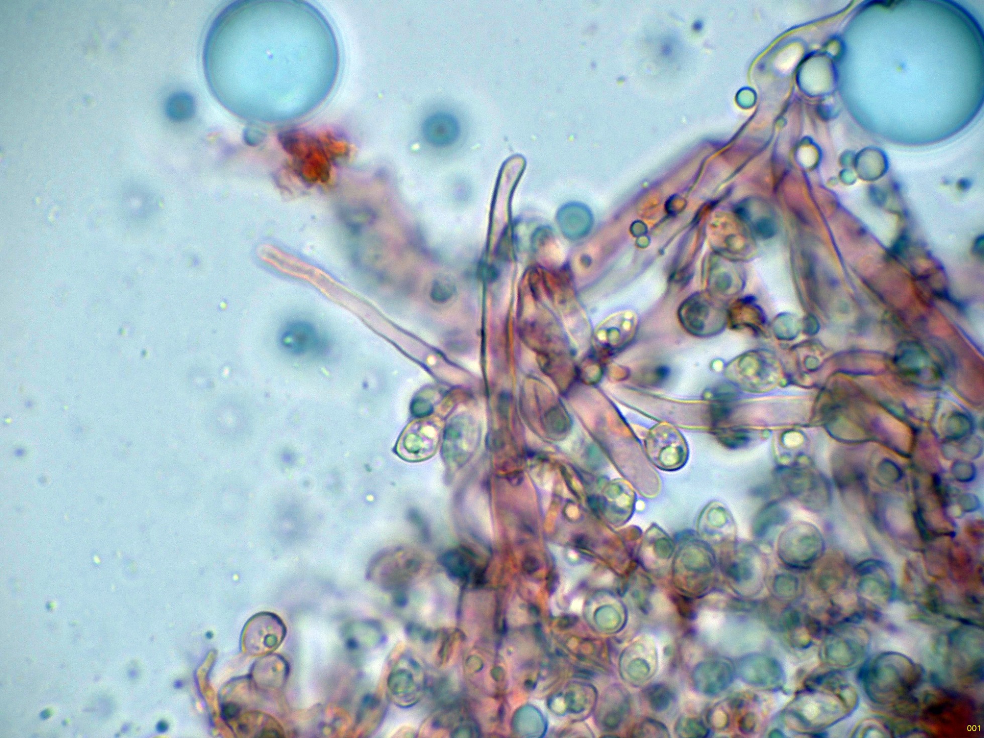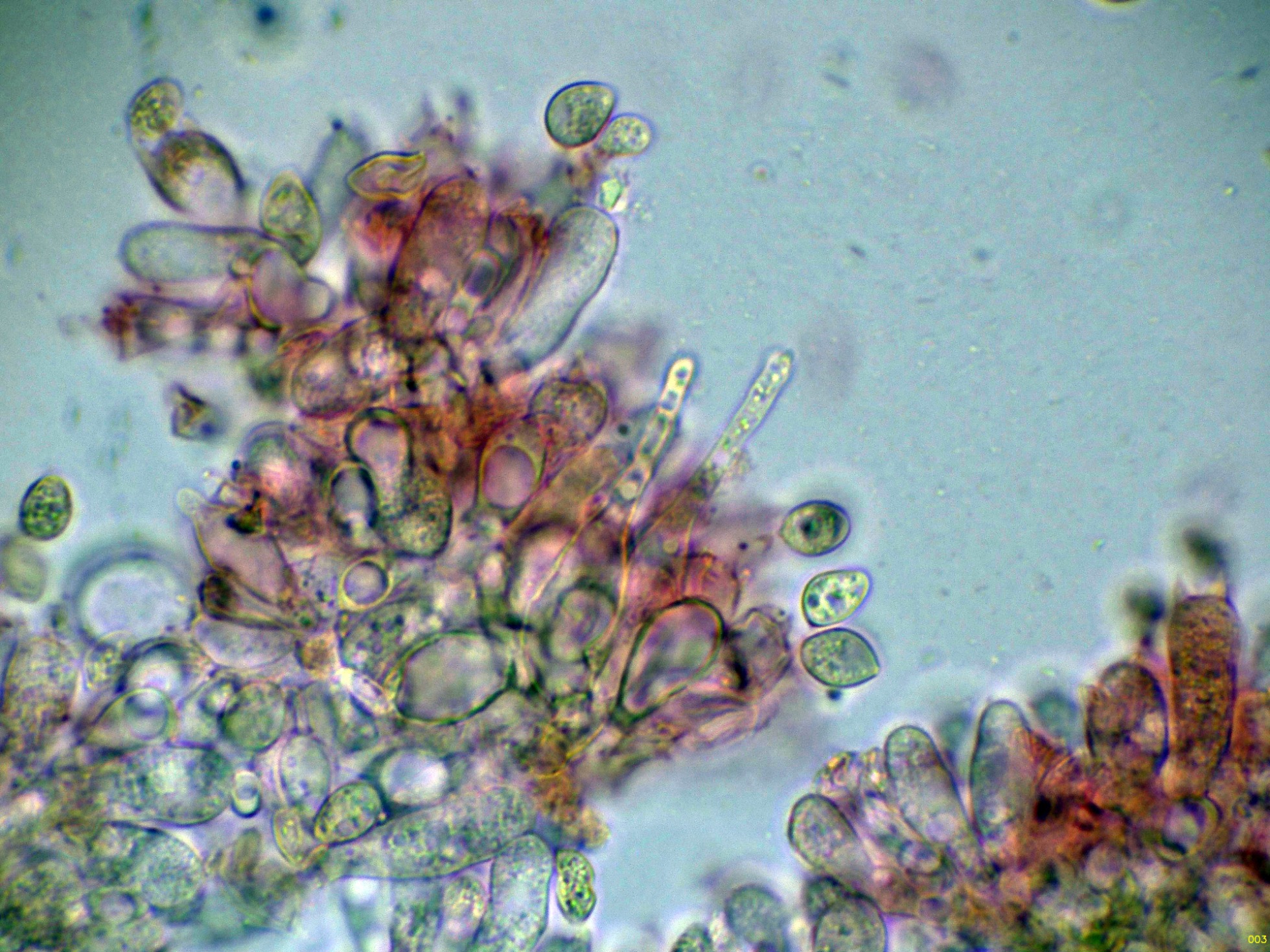 Queilocistidios muy abundantes que dejan prácticamente estéril la arista laminar, estos queilocistidios con unas medidas de (40) 43.6 - 57.8 (68.5) × (11.8) 12.1 - 16.4 (19) µm., con una media de Me = 50.6 × 14.6 µm: