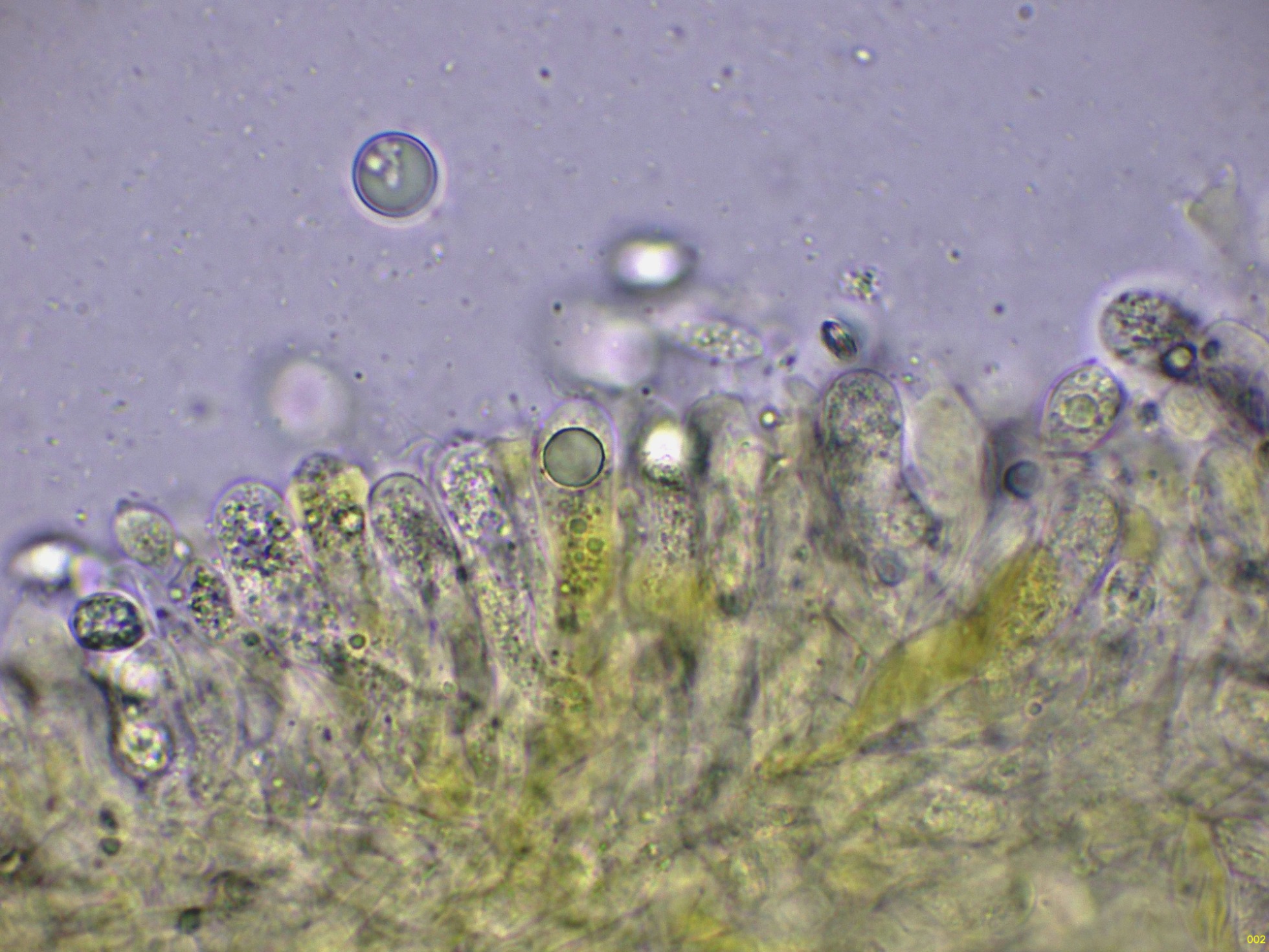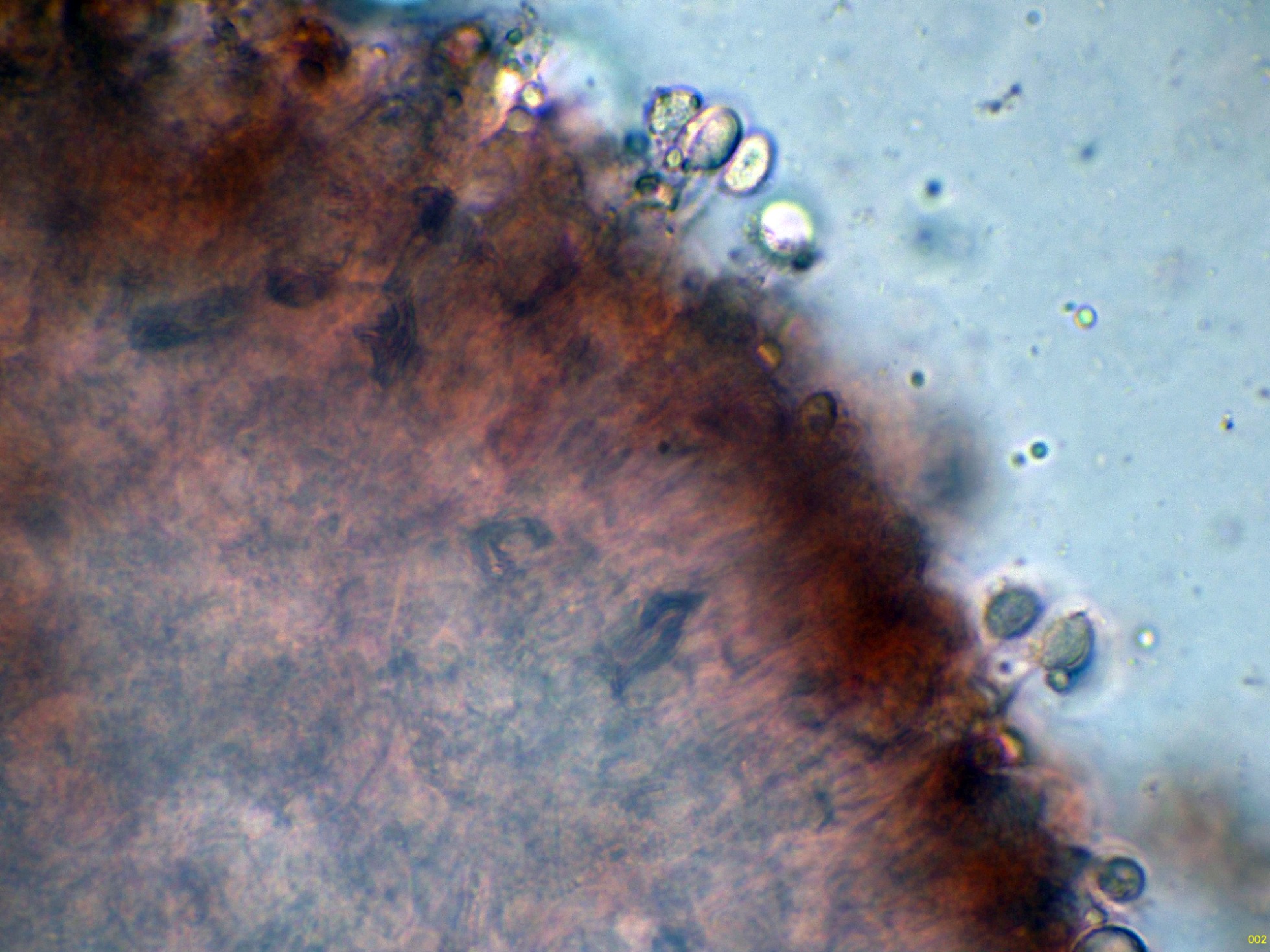 Para terminar con las microscopías, uno que aunque parecía brotar del suelo, lo hacía sobre un resto de tocón enterrado de pino, ya un poco desmejorada, tenemos la Tricholomopsis rutilans:
