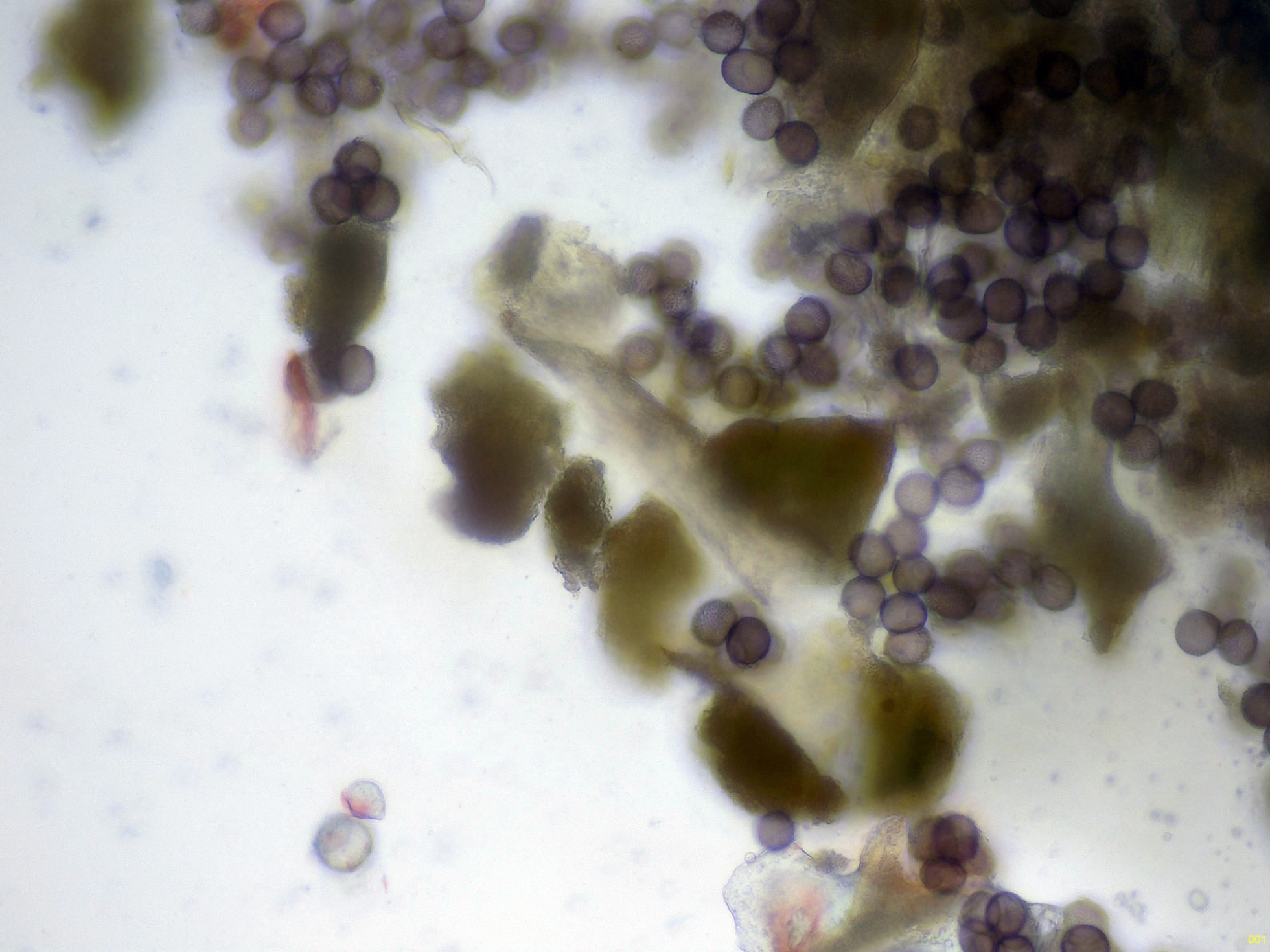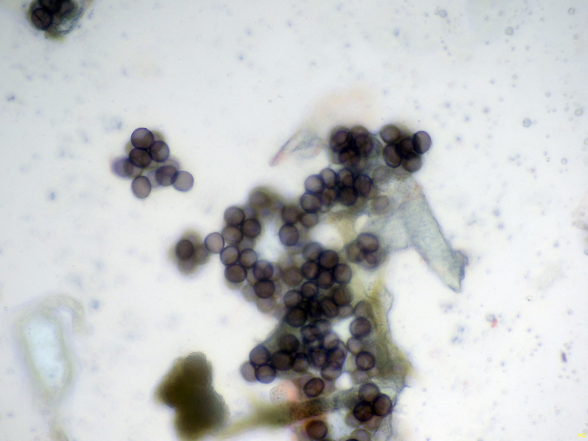 Esporas a 400 aumentos, agrupadas en grupos de entre 4 a 20 esporas: