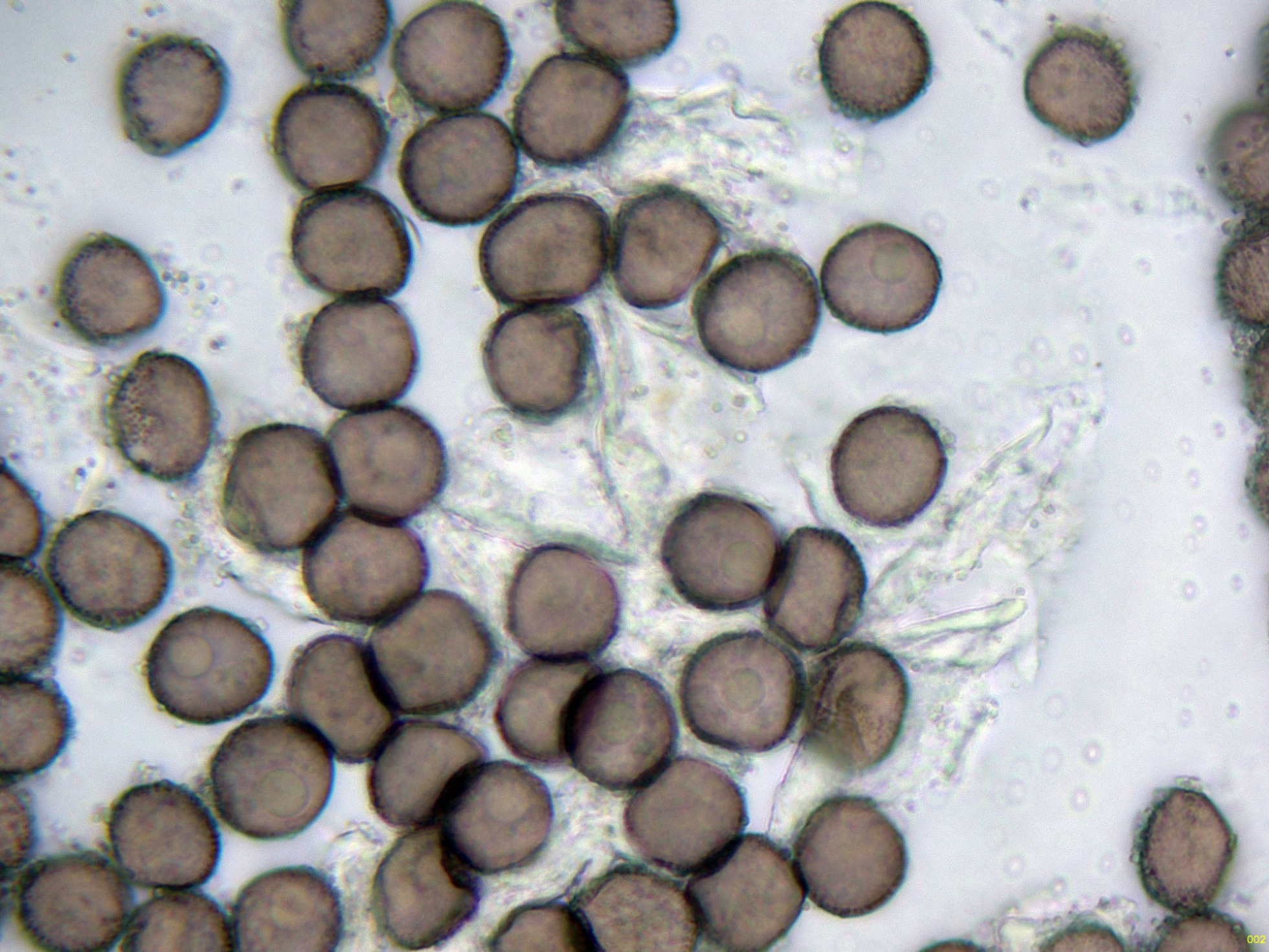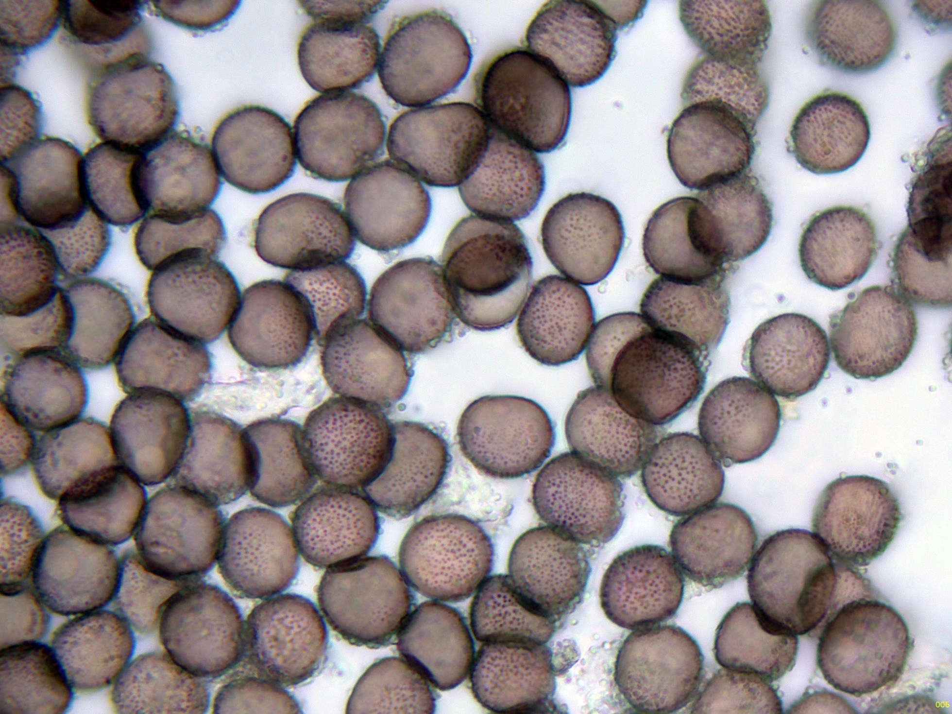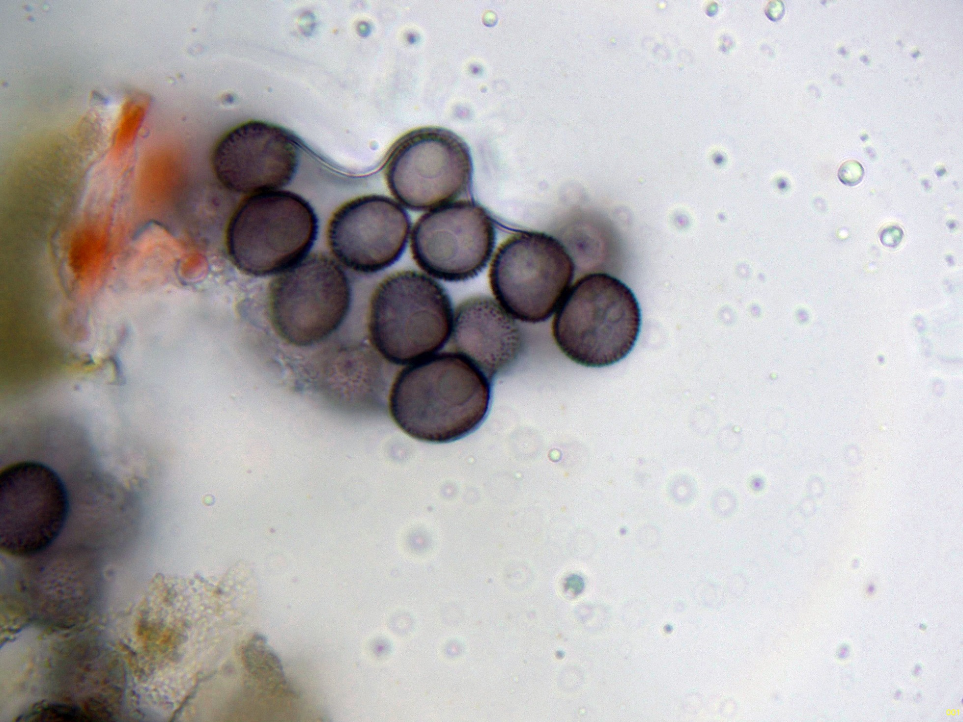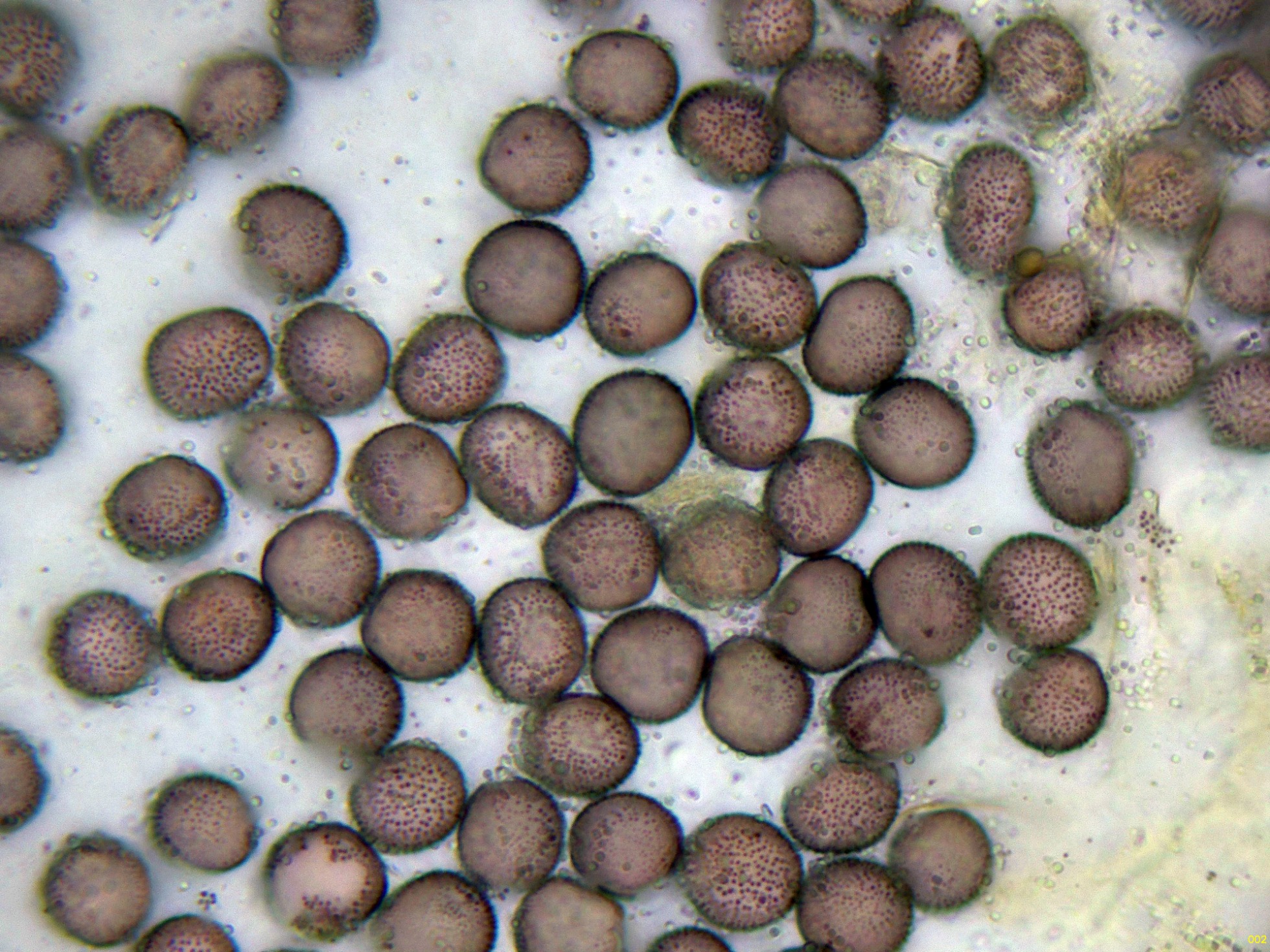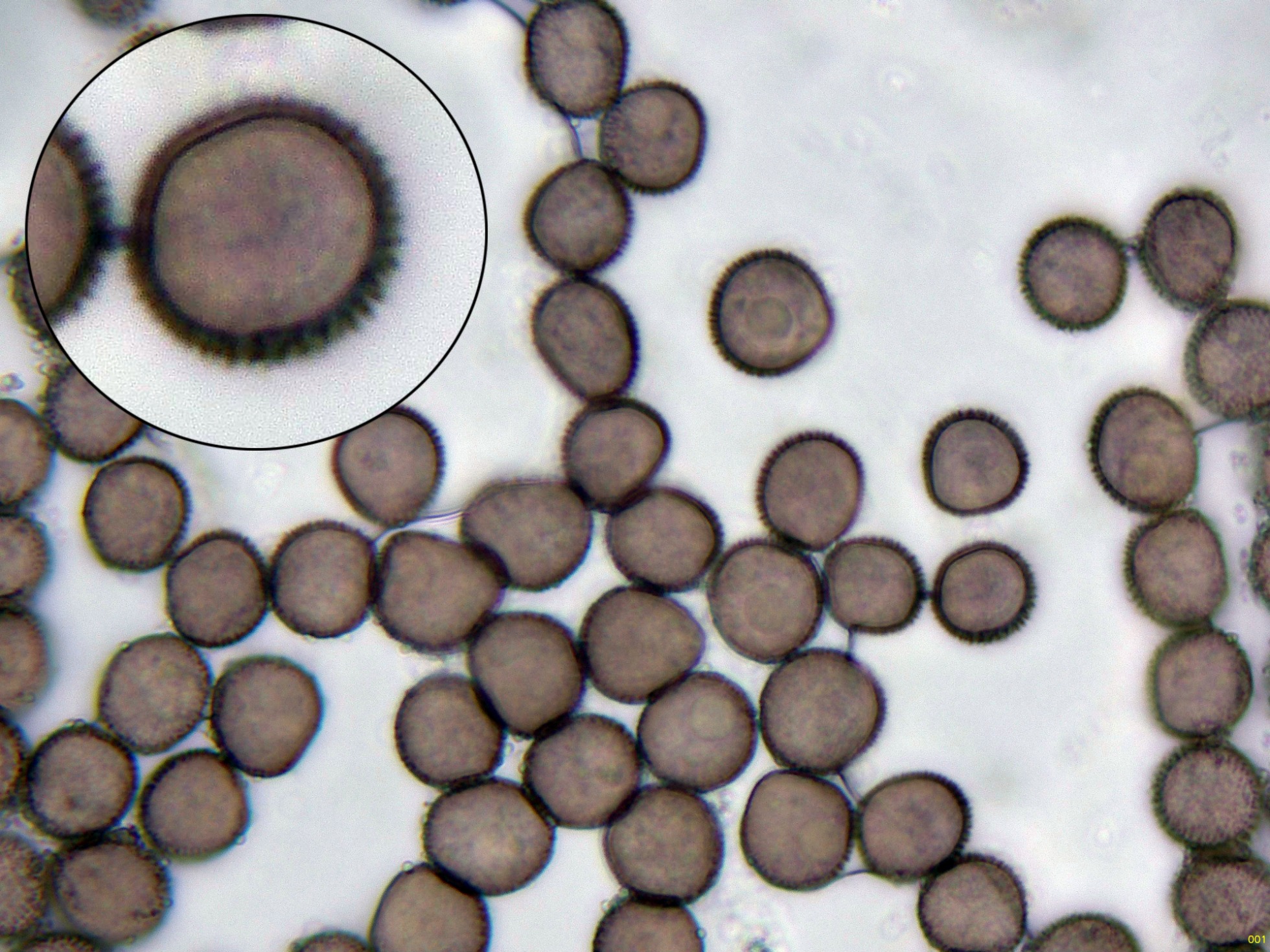 Estas esporas en función del plano observado, en su perímetro se puede apreciar su aspecto claramente espinoso, característico de la especie, ver miniatura superior izquierda: