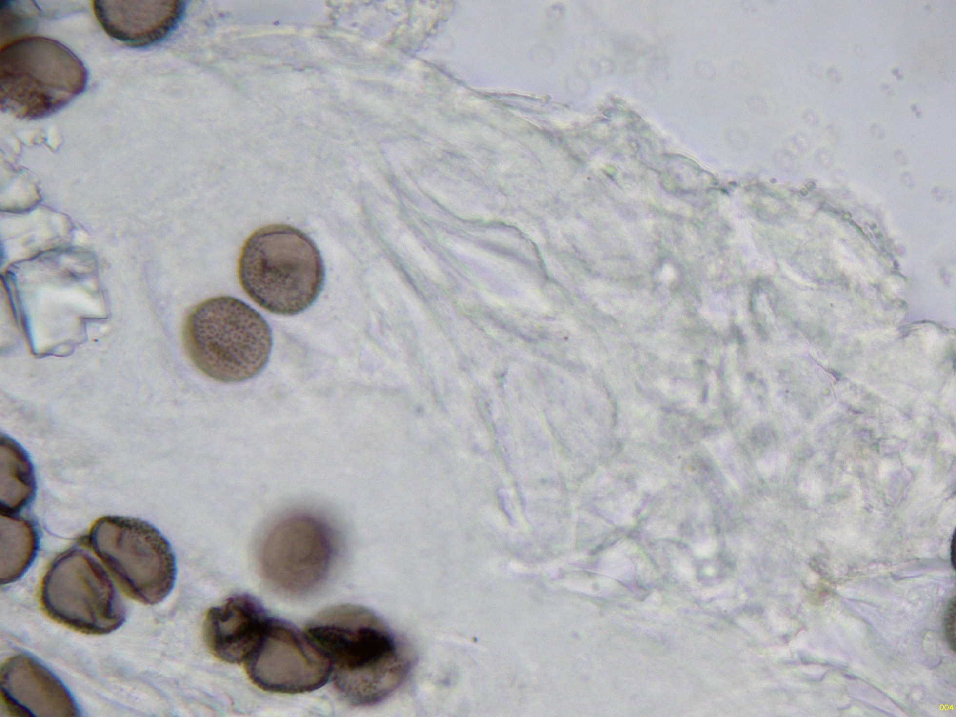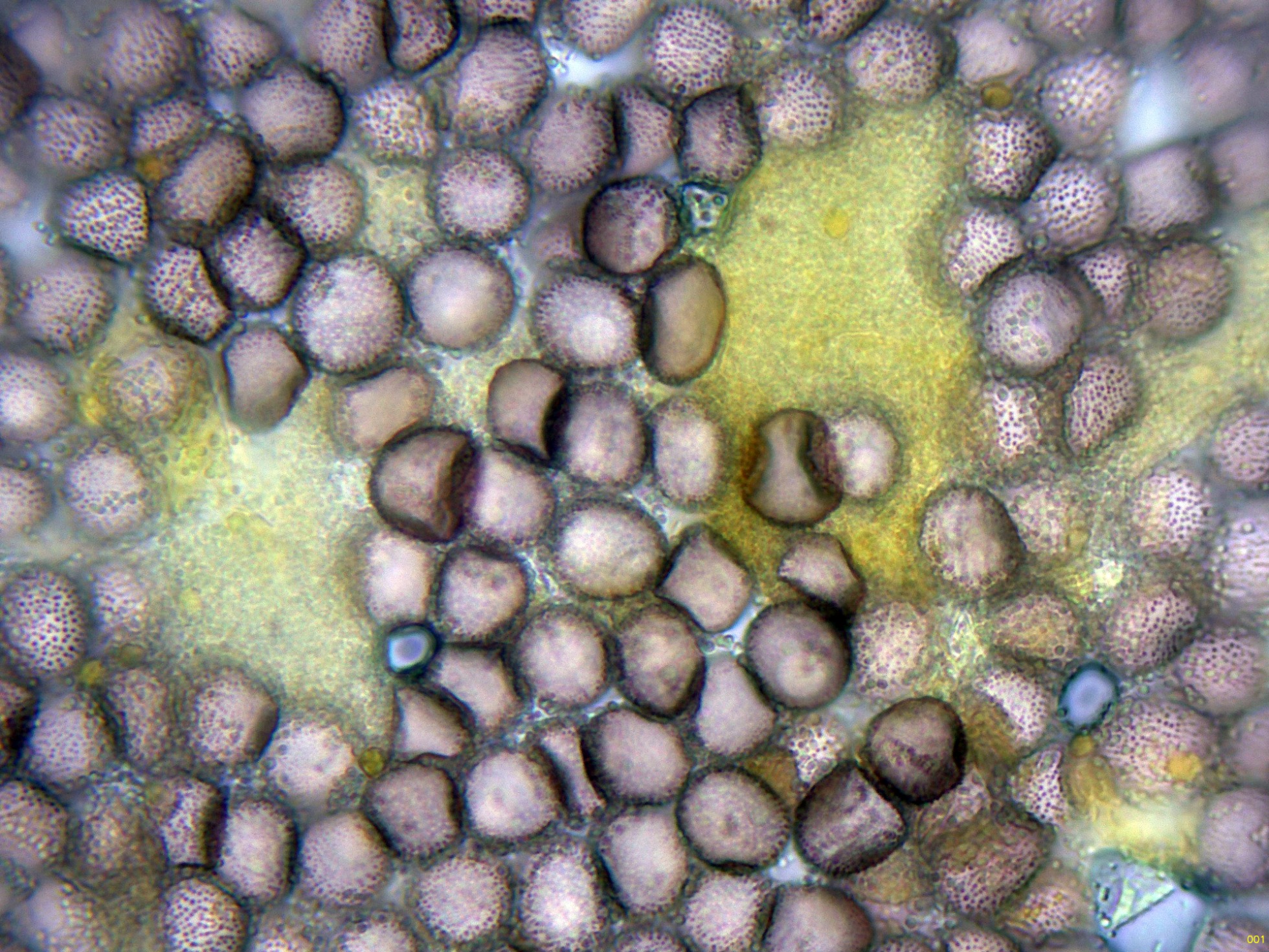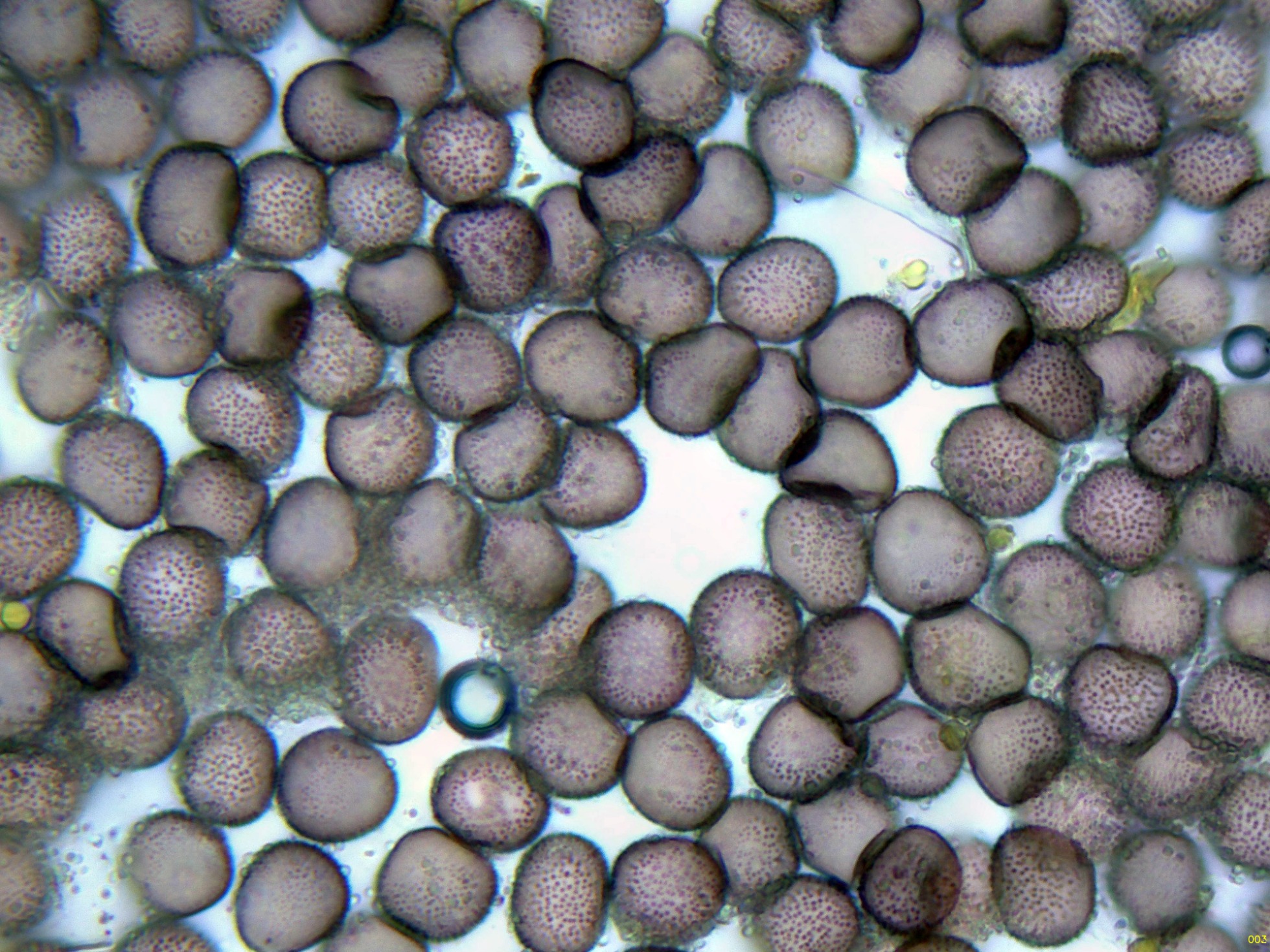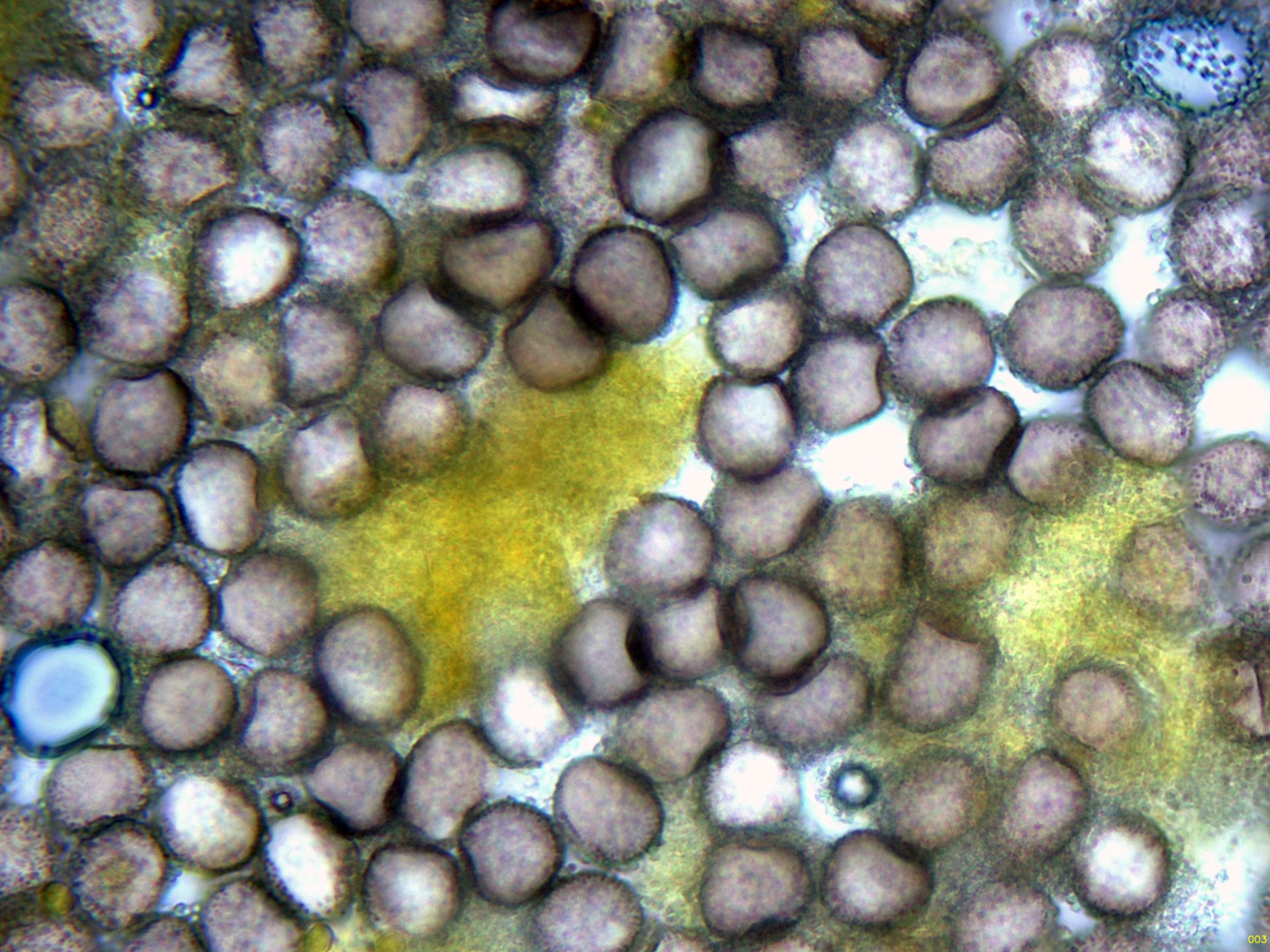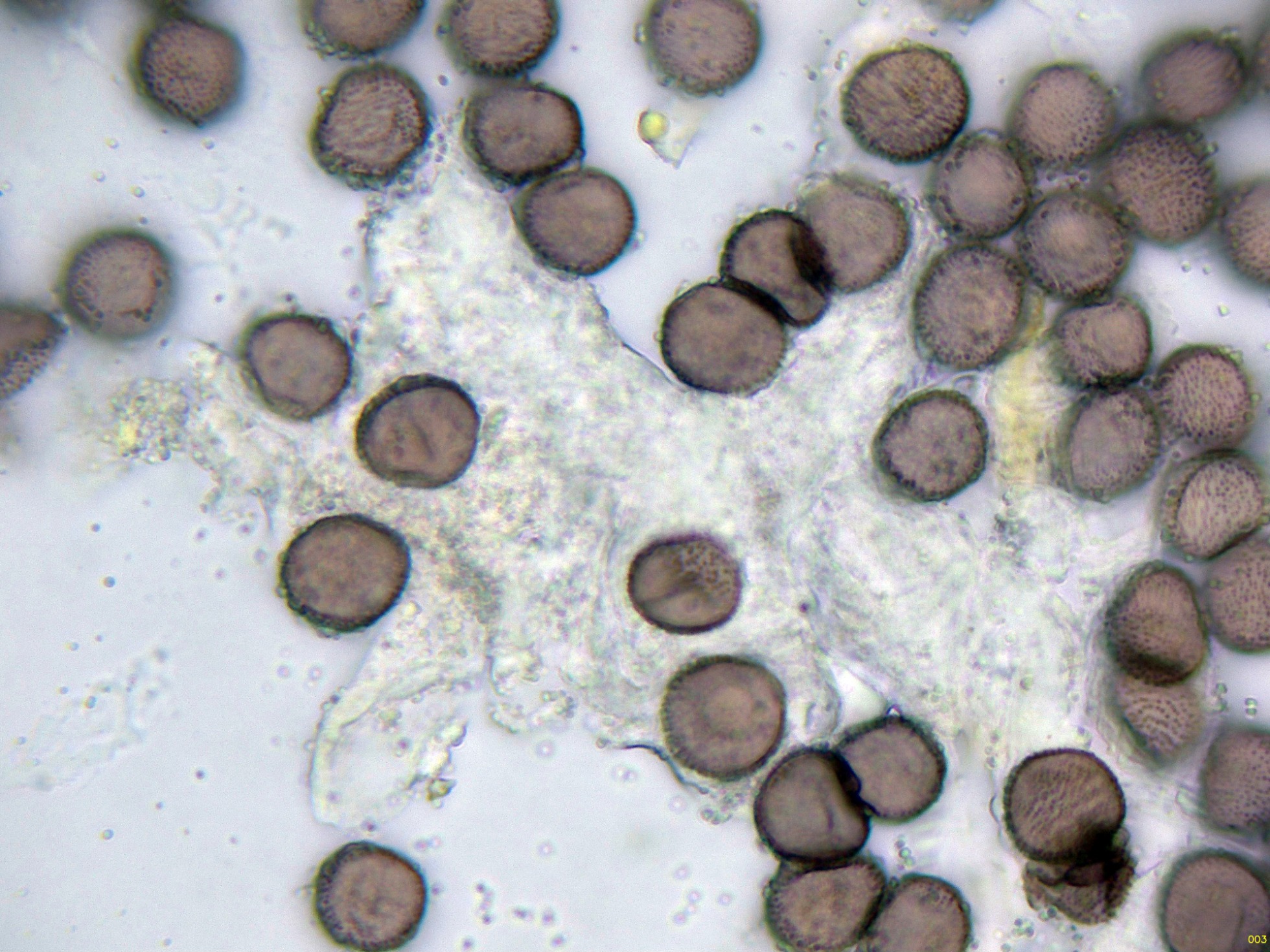 Estas esporas en función del plano observado, en su perímetro se puede apreciar su aspecto claramente espinoso, característico de la especie, ver miniatura superior izquierda: