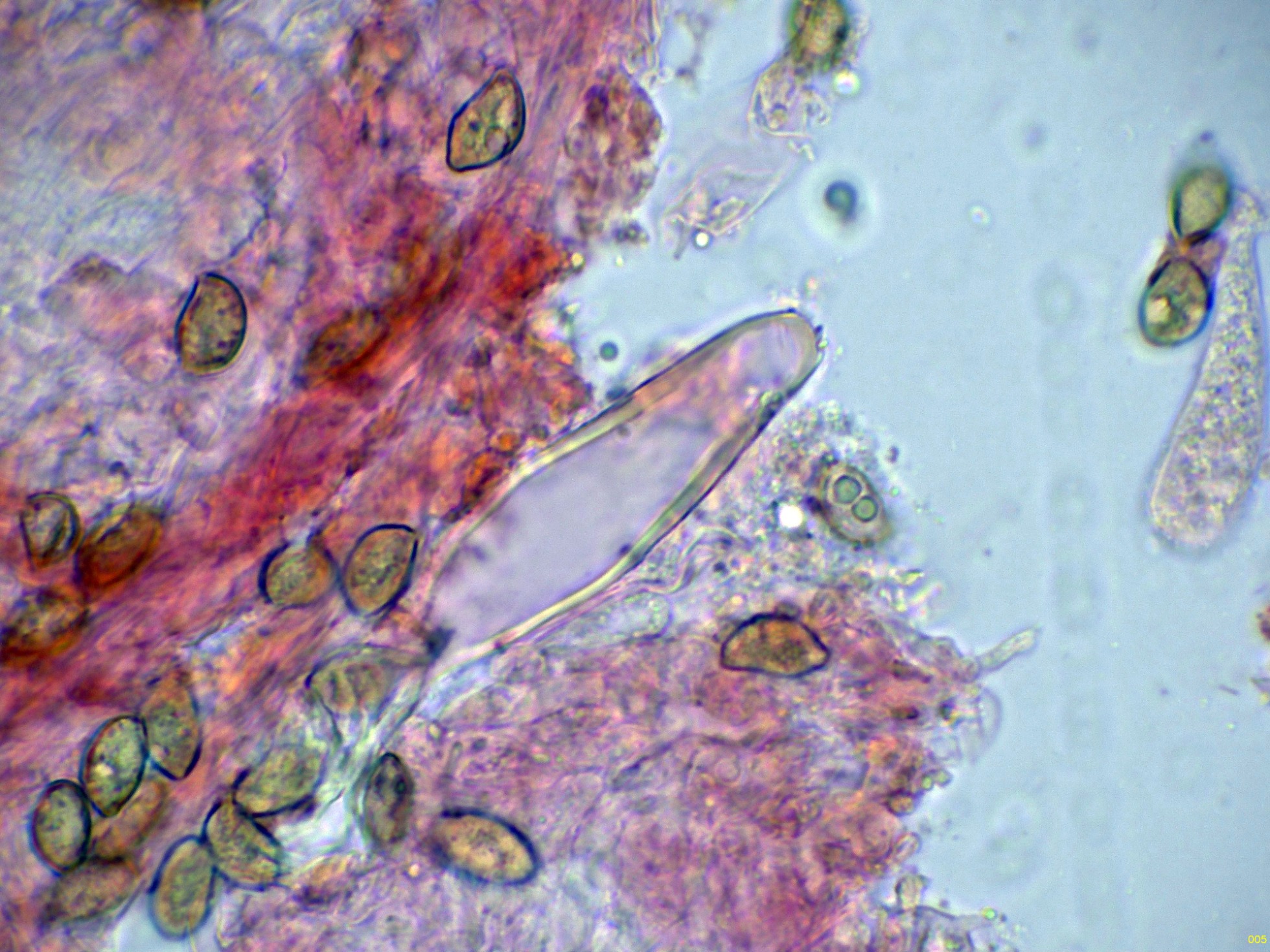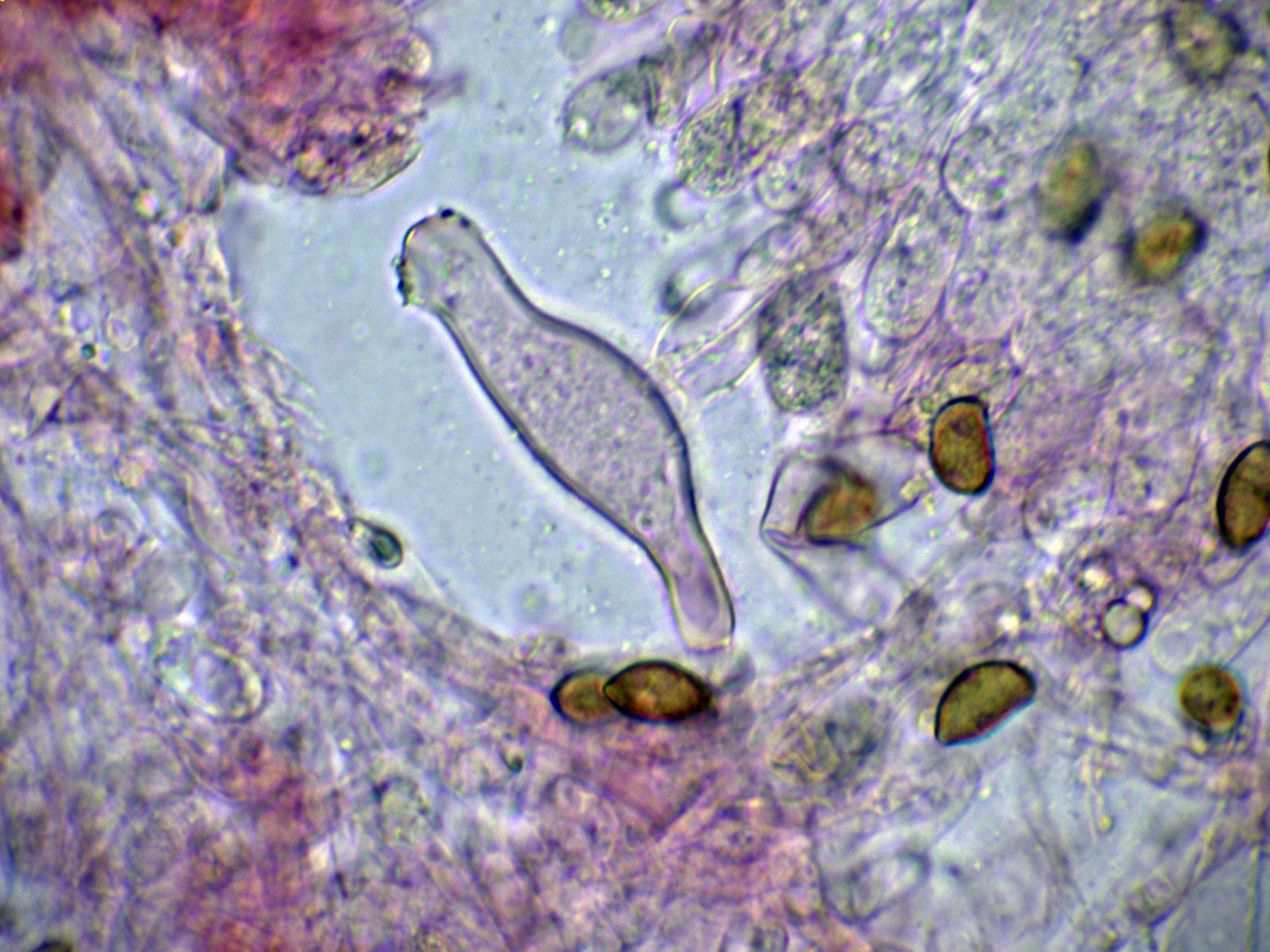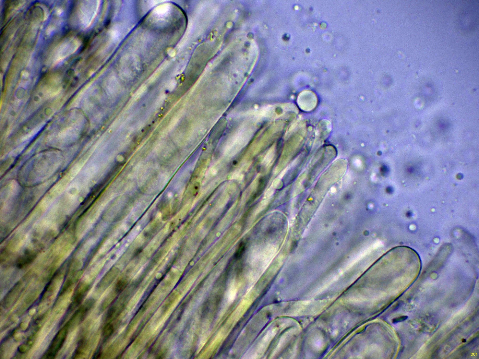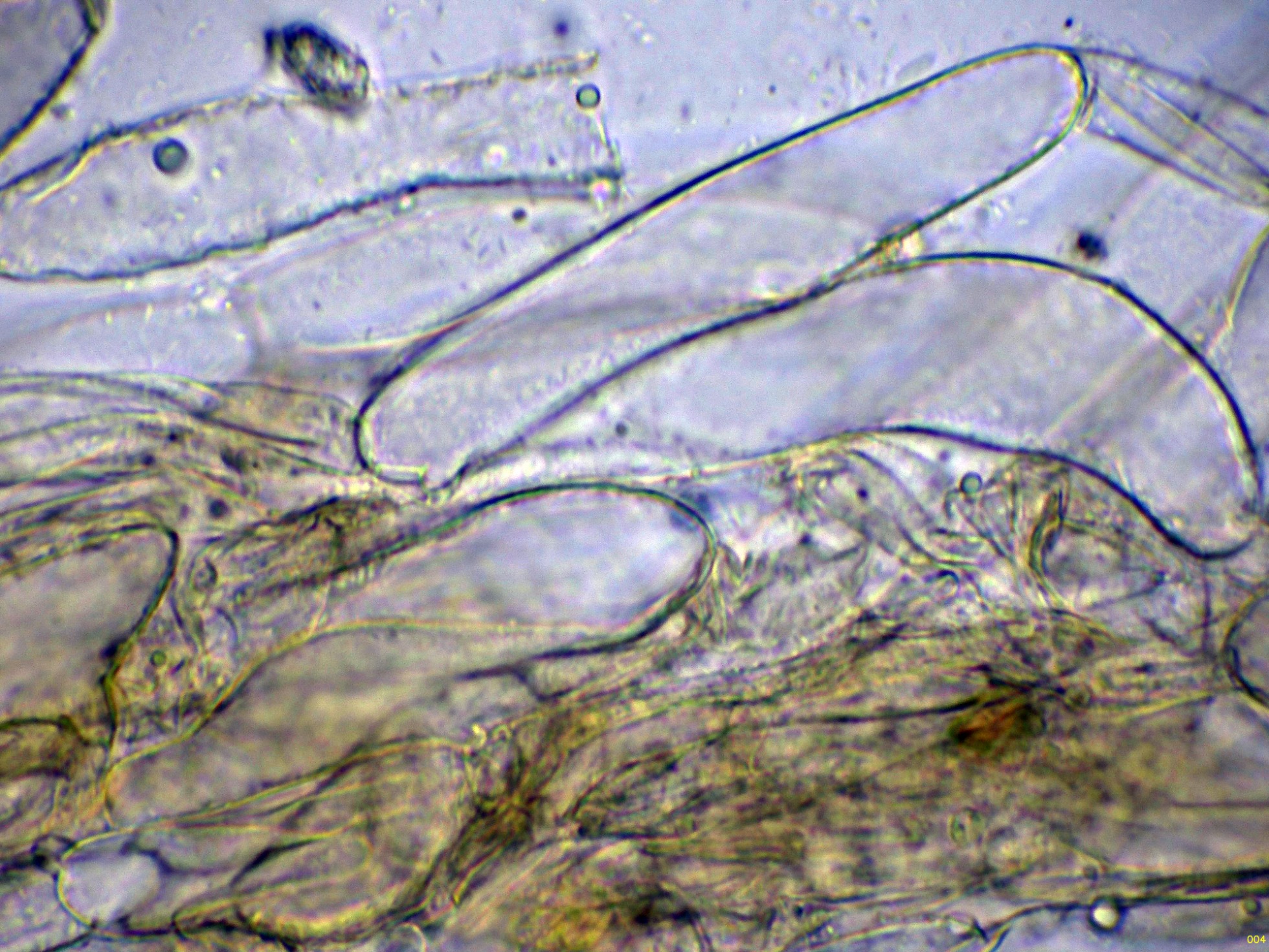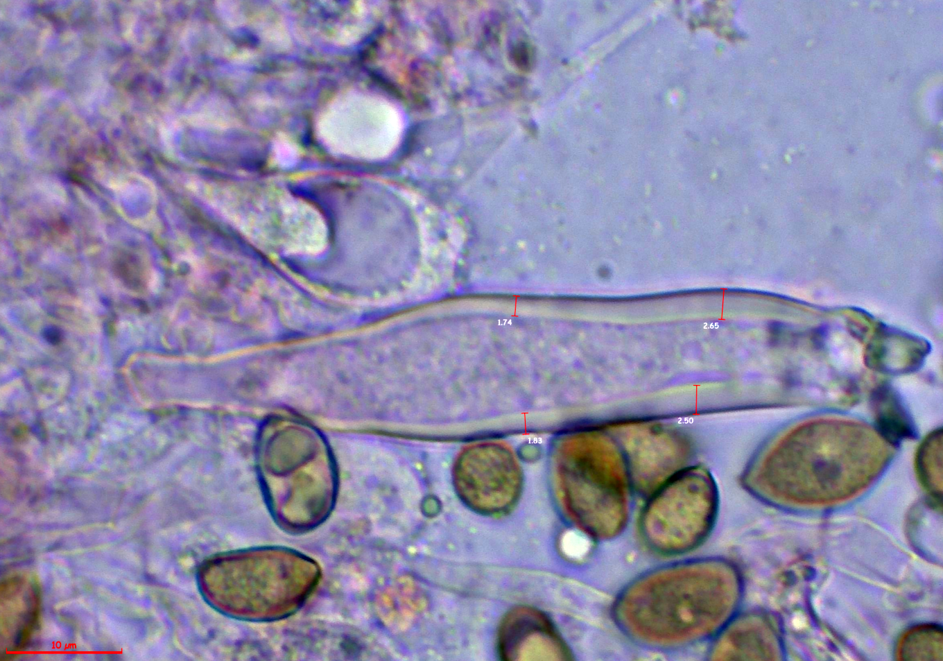 Pleurocistidios dispersos en la cara laminar, estos pleurocistidios con unas medidas de (43.8) 43.82 - 71.6 × 10.6 - 17.2 µm., con una media de Me = 61.7 × 14.6 µm. :