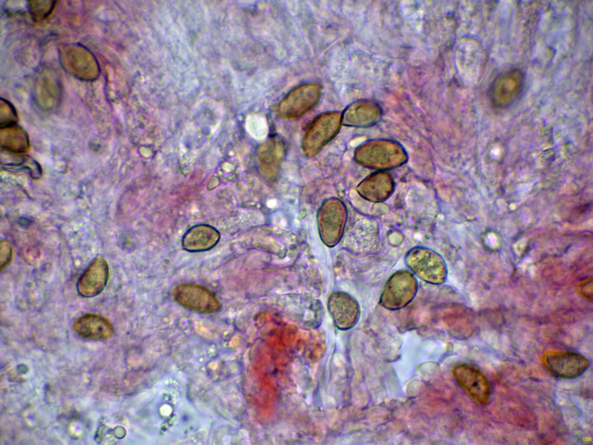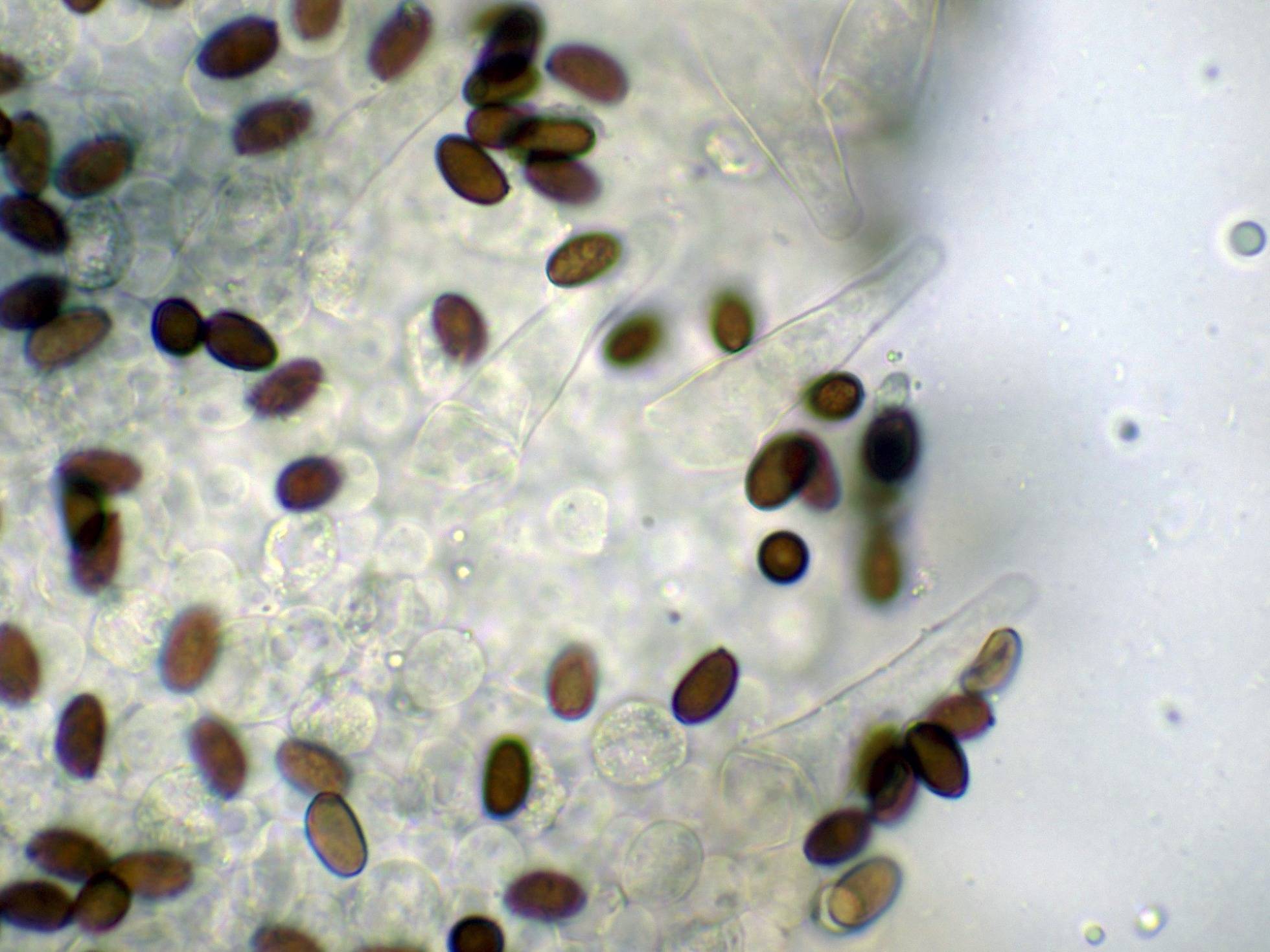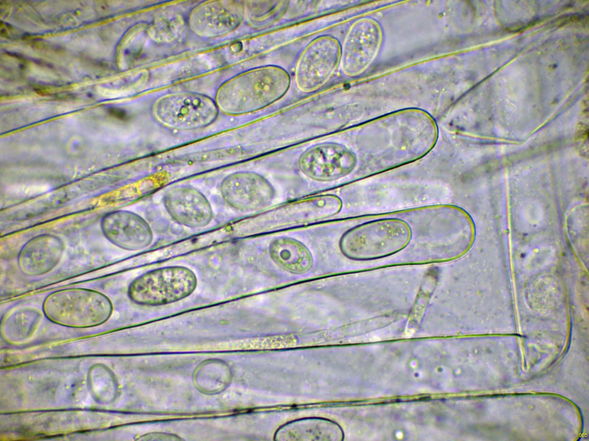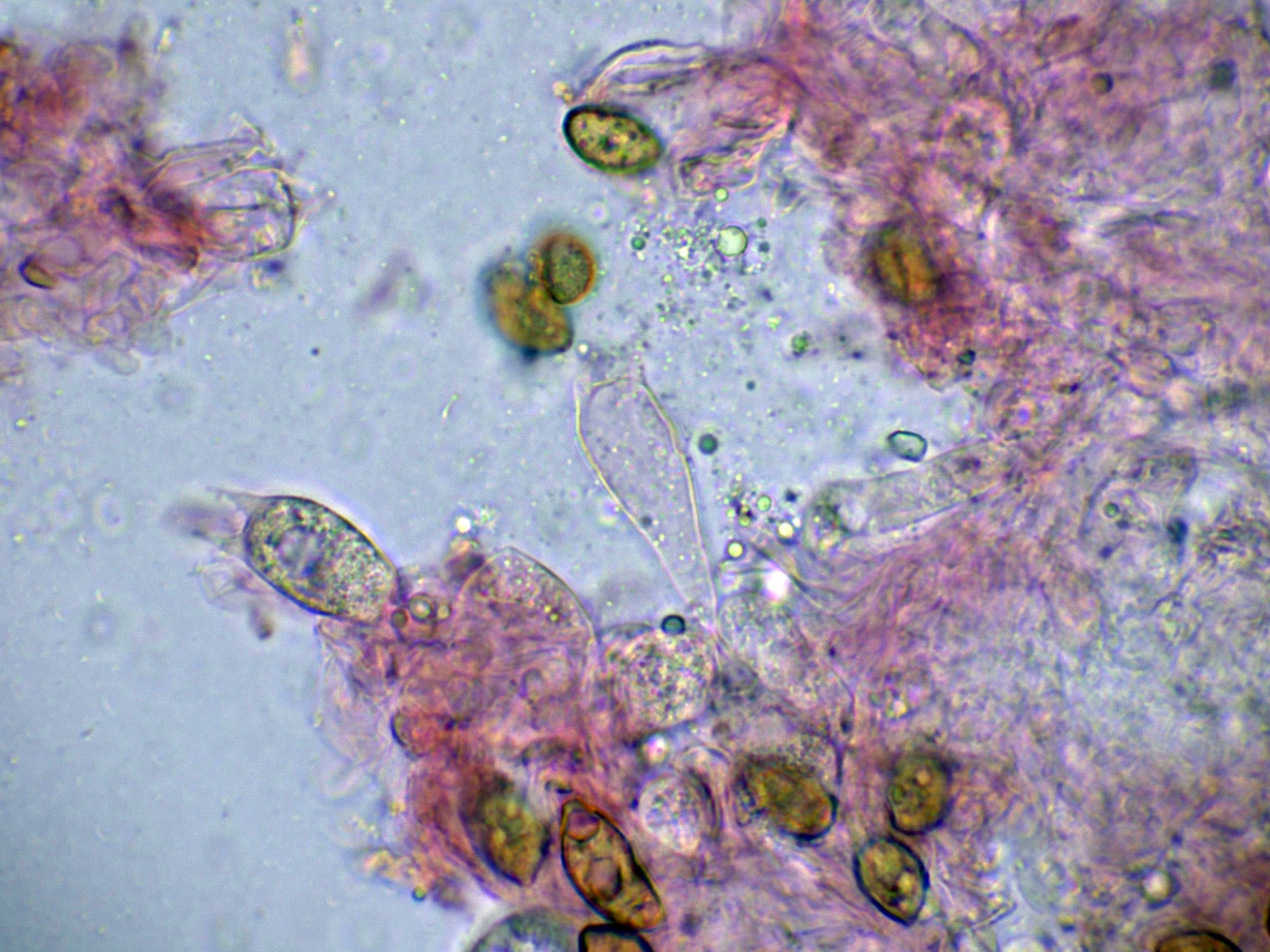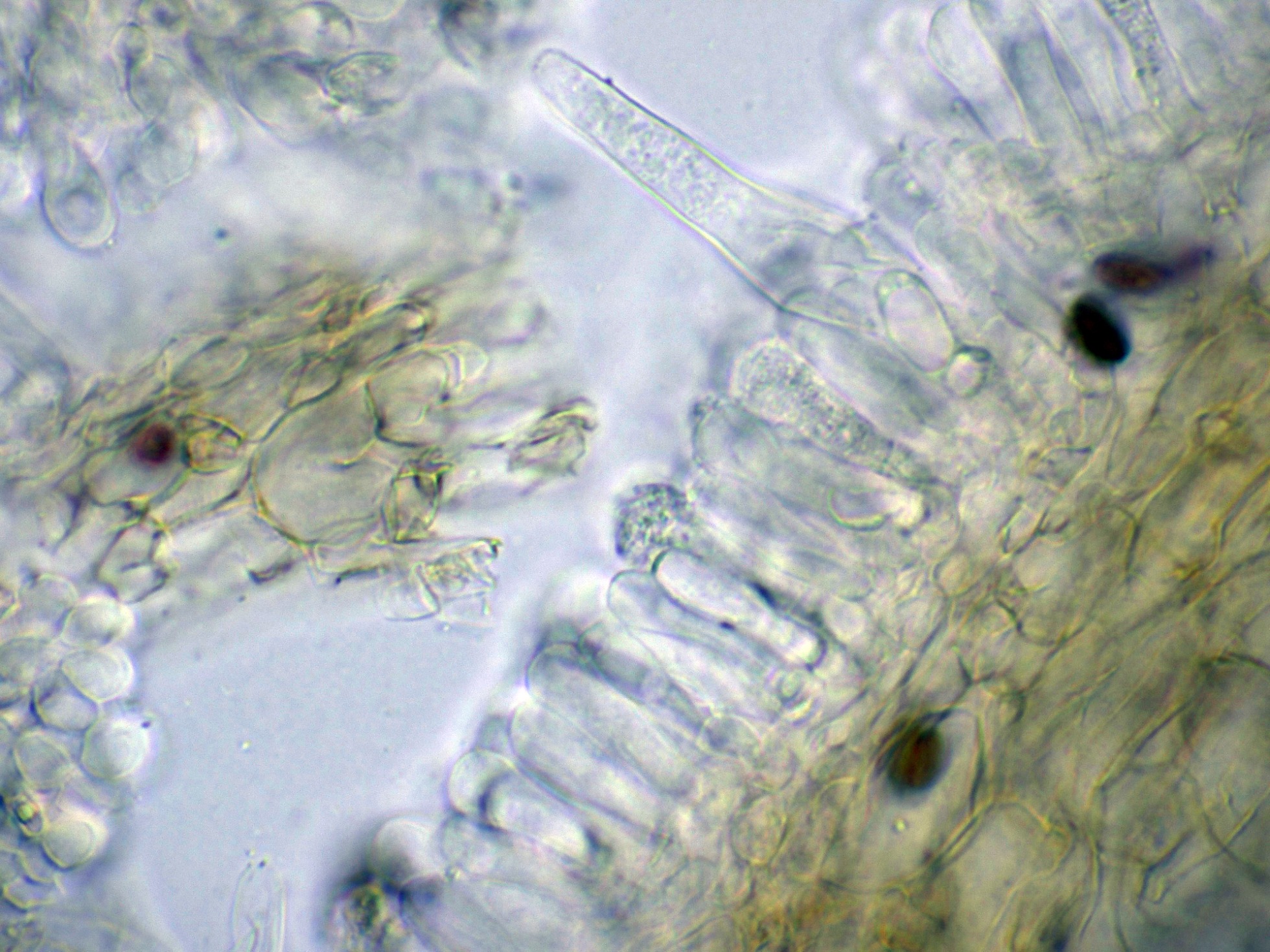 Pleurocistidios dispersos en la cara laminar, estos pleurocistidios con unas medidas de (43.8) 43.82 - 71.6 × 10.6 - 17.2 µm., con una media de Me = 61.7 × 14.6 µm. :