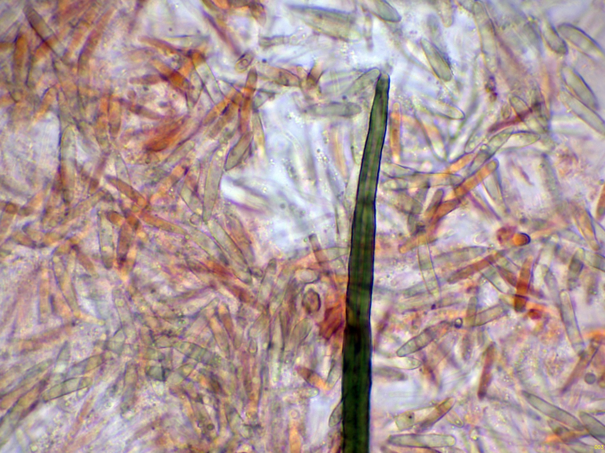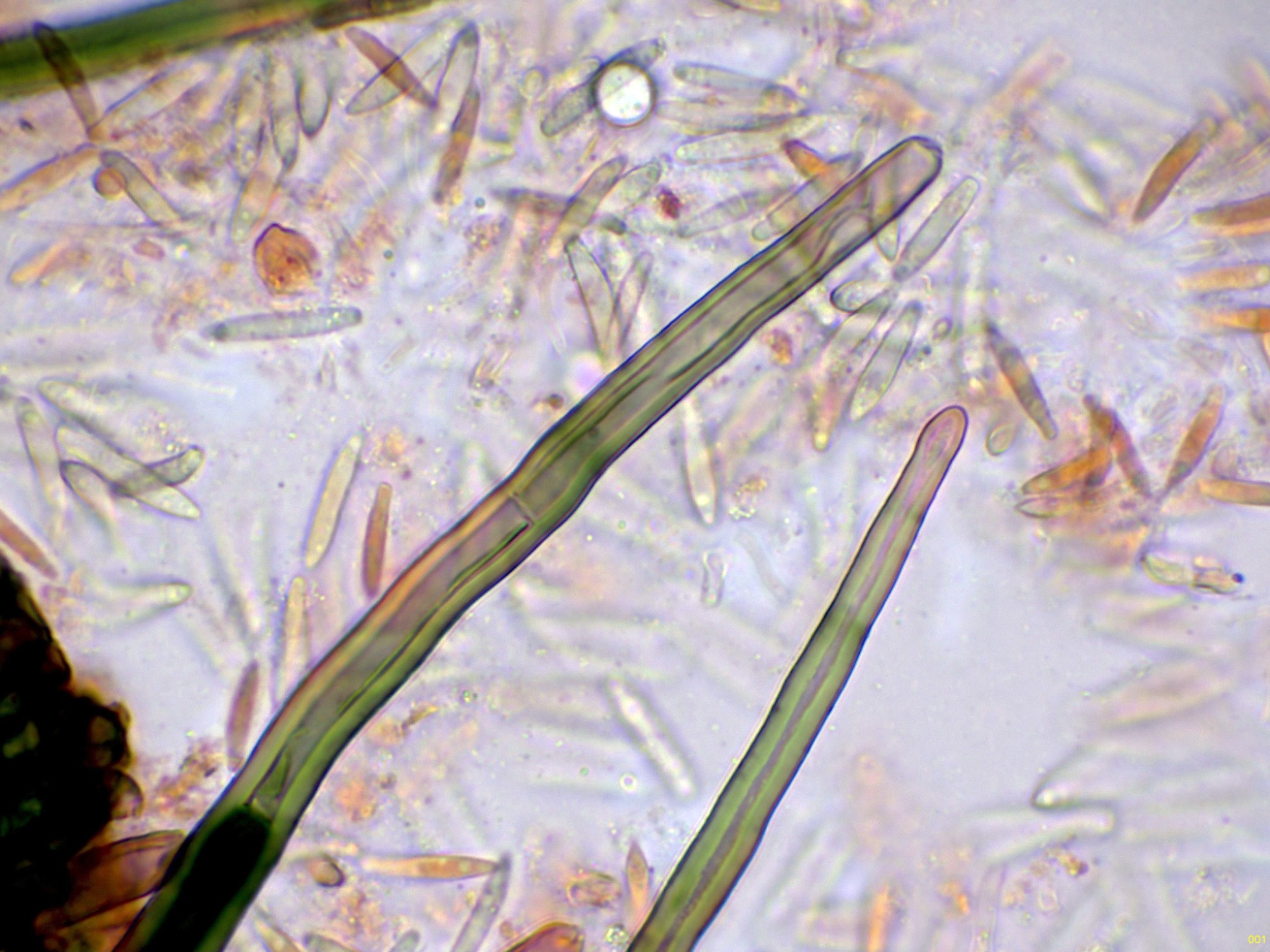 Pelos externos fuertemente pigmentados, con pocos septos, pared gruesa y el extremo algo más hialino, con una longitud cercana al diámetro del ascoma.
