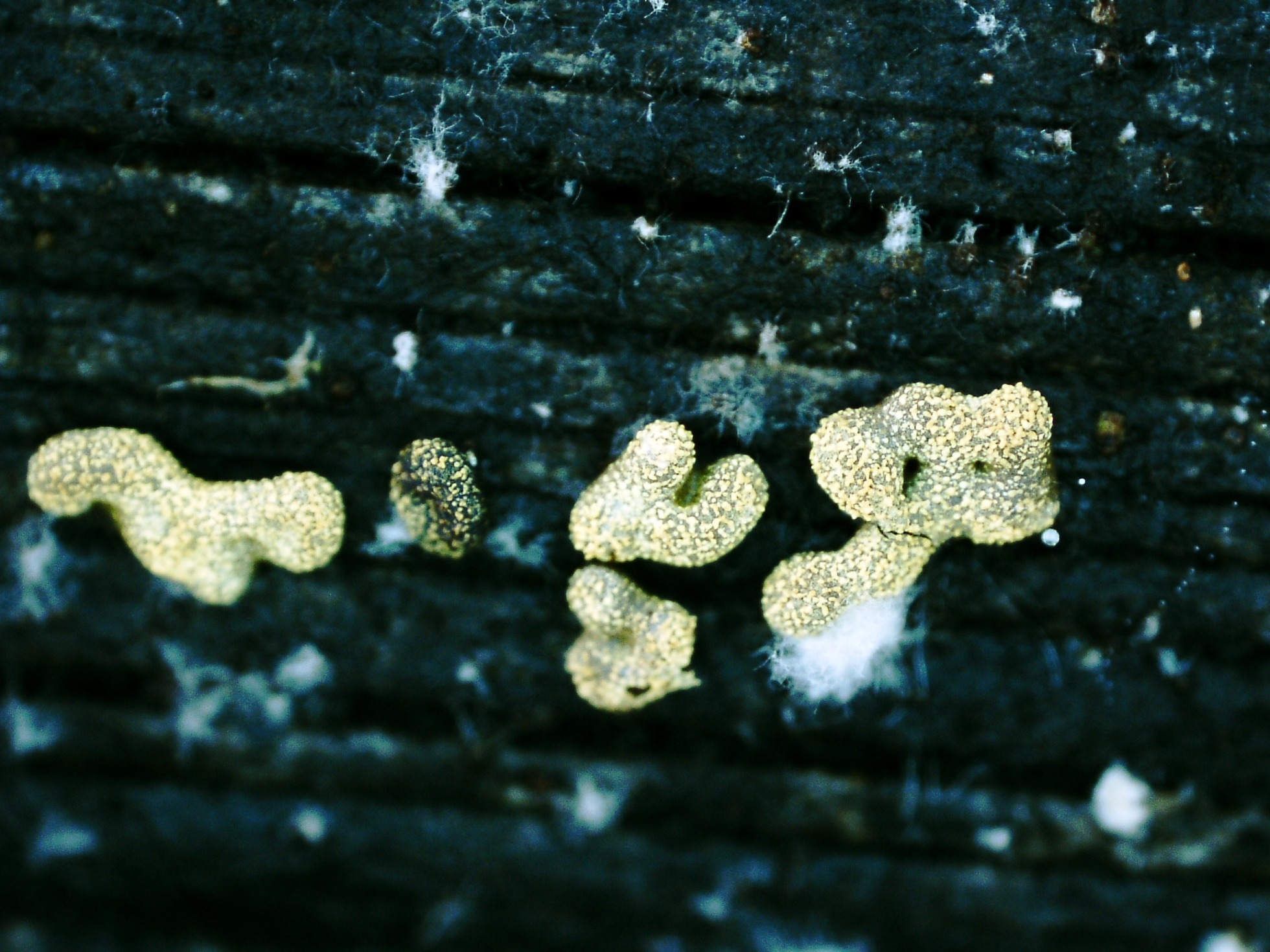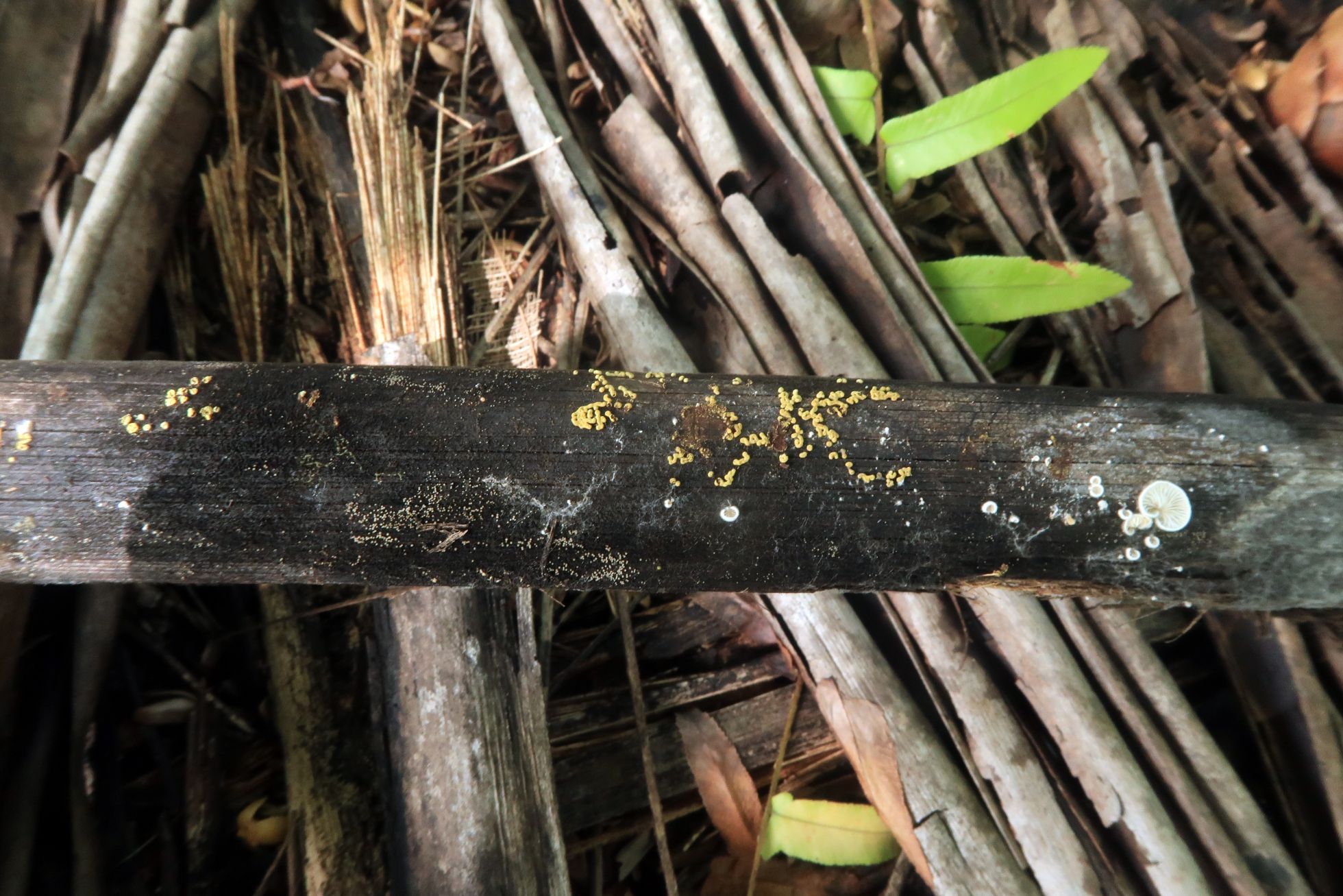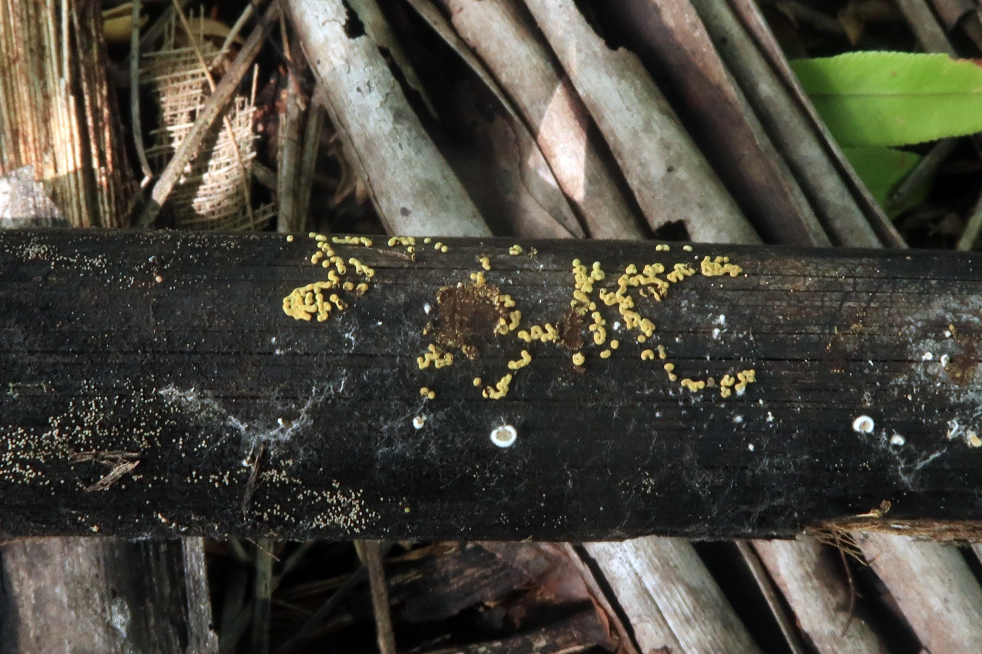 Ejemplares fusionándose unos con otros y apareciendo de manera abundante sobre la madera de un tallo del suelo en descomposición de Coccoloba uvifera (Uva de mar).