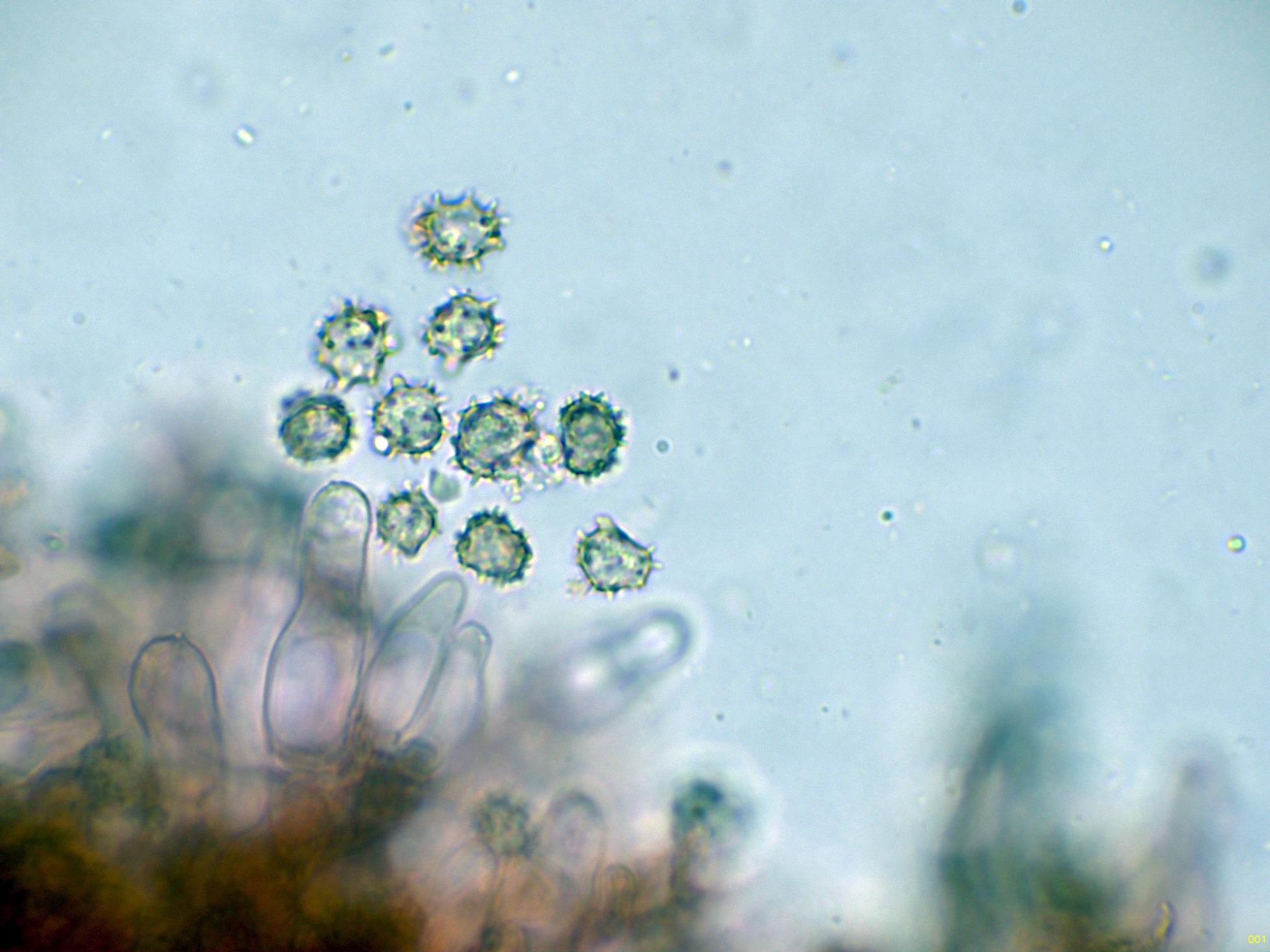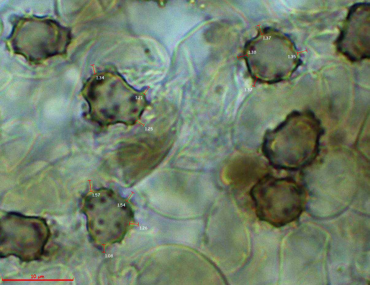 Estas esporas en distintos medios, con unas medidas sin contar la ornamentación de: