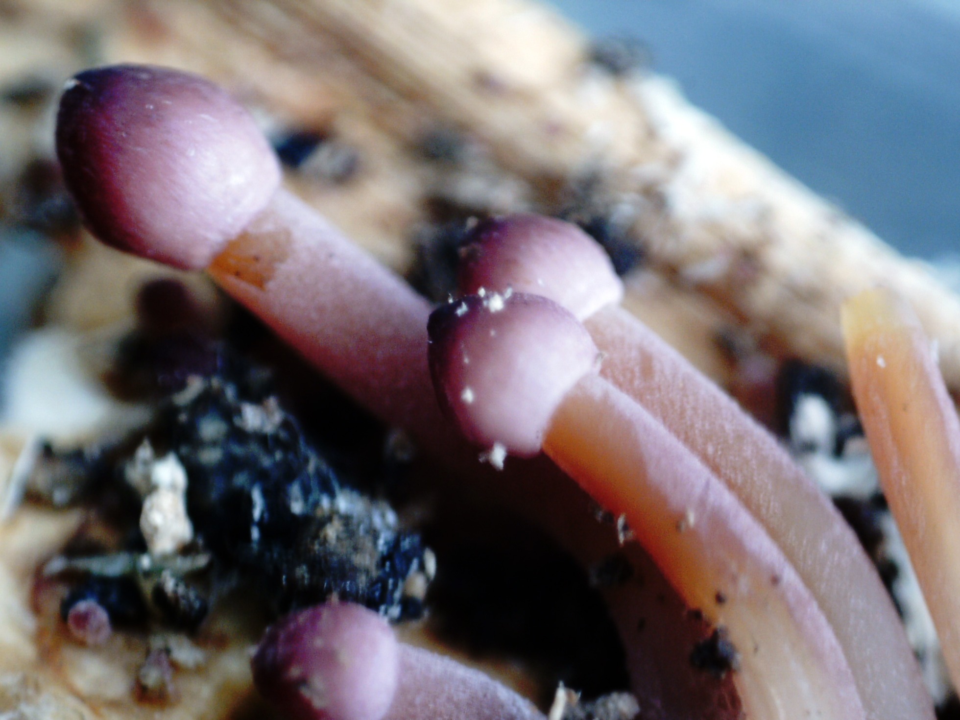 Una Mycena, como se trataba de unos primordios, para poder llegar a su identidad, no me quedó mas remedio que recurrir a los datos moleculares, la secuencia salió parcialmente ruidosa, pero apuntó claramente a la Mycena purpureofusca: