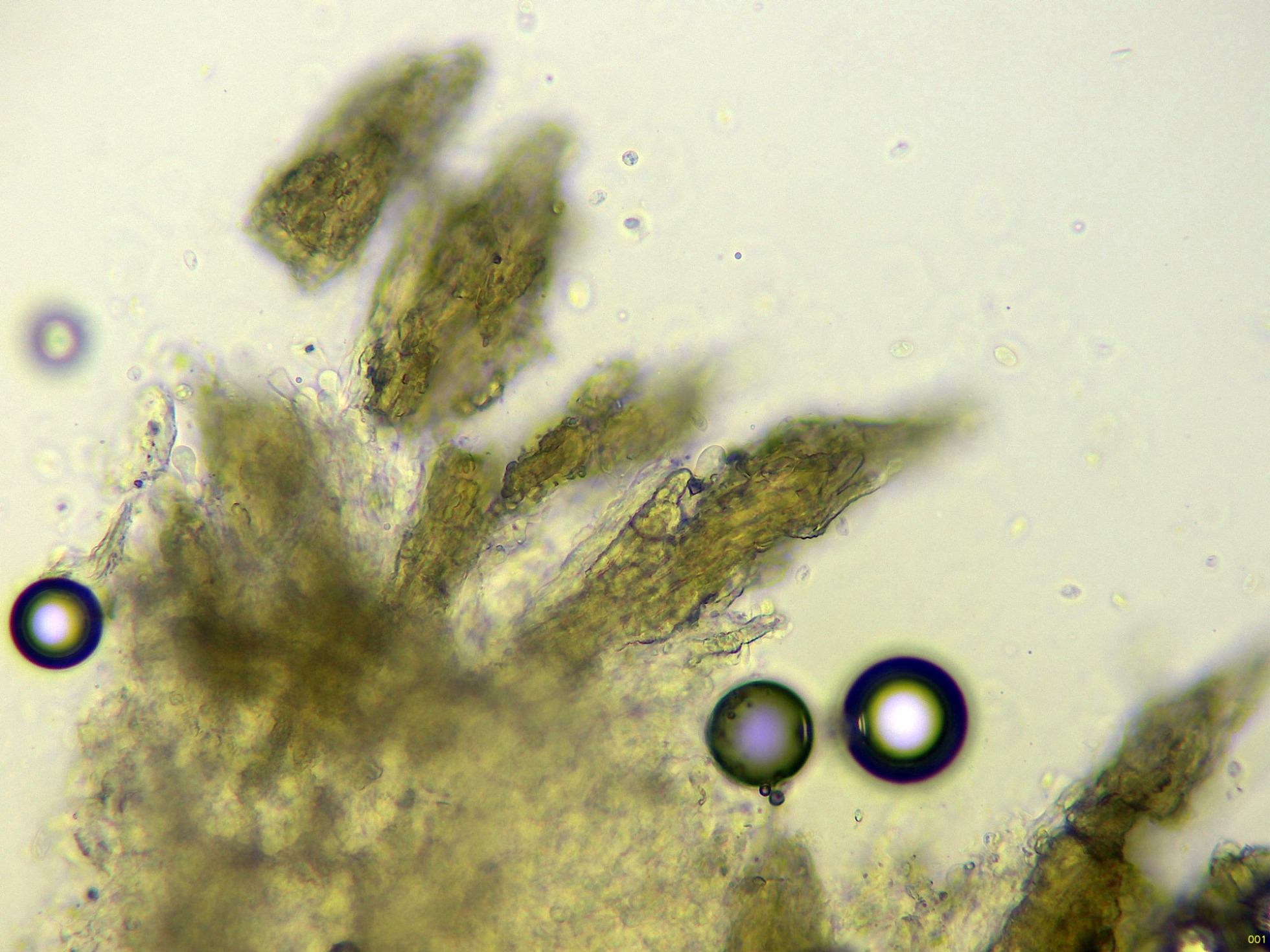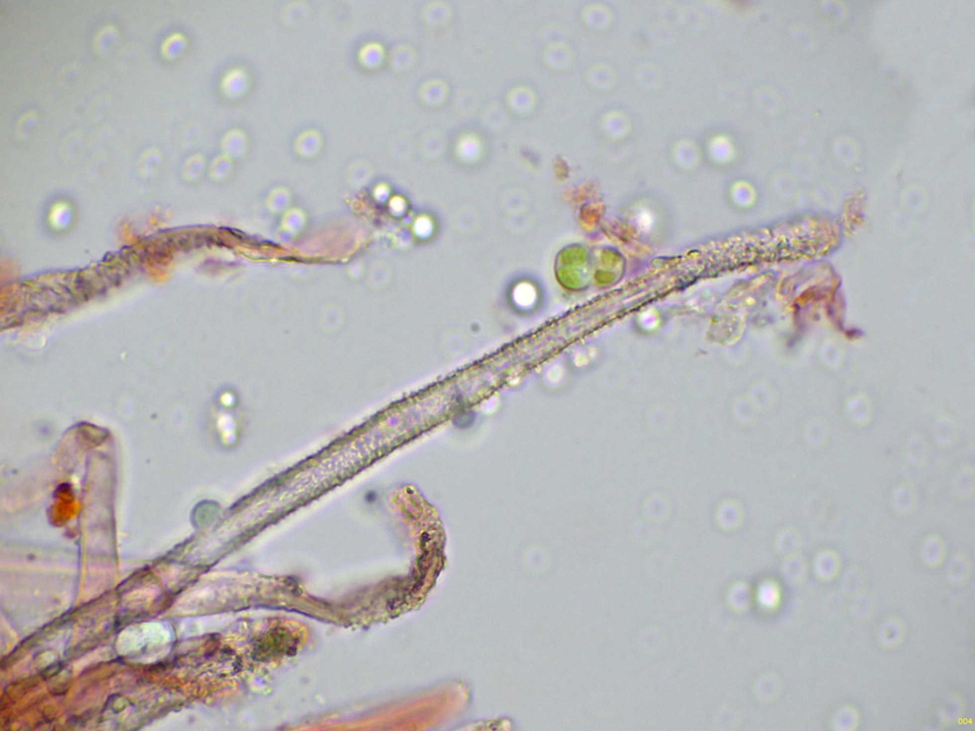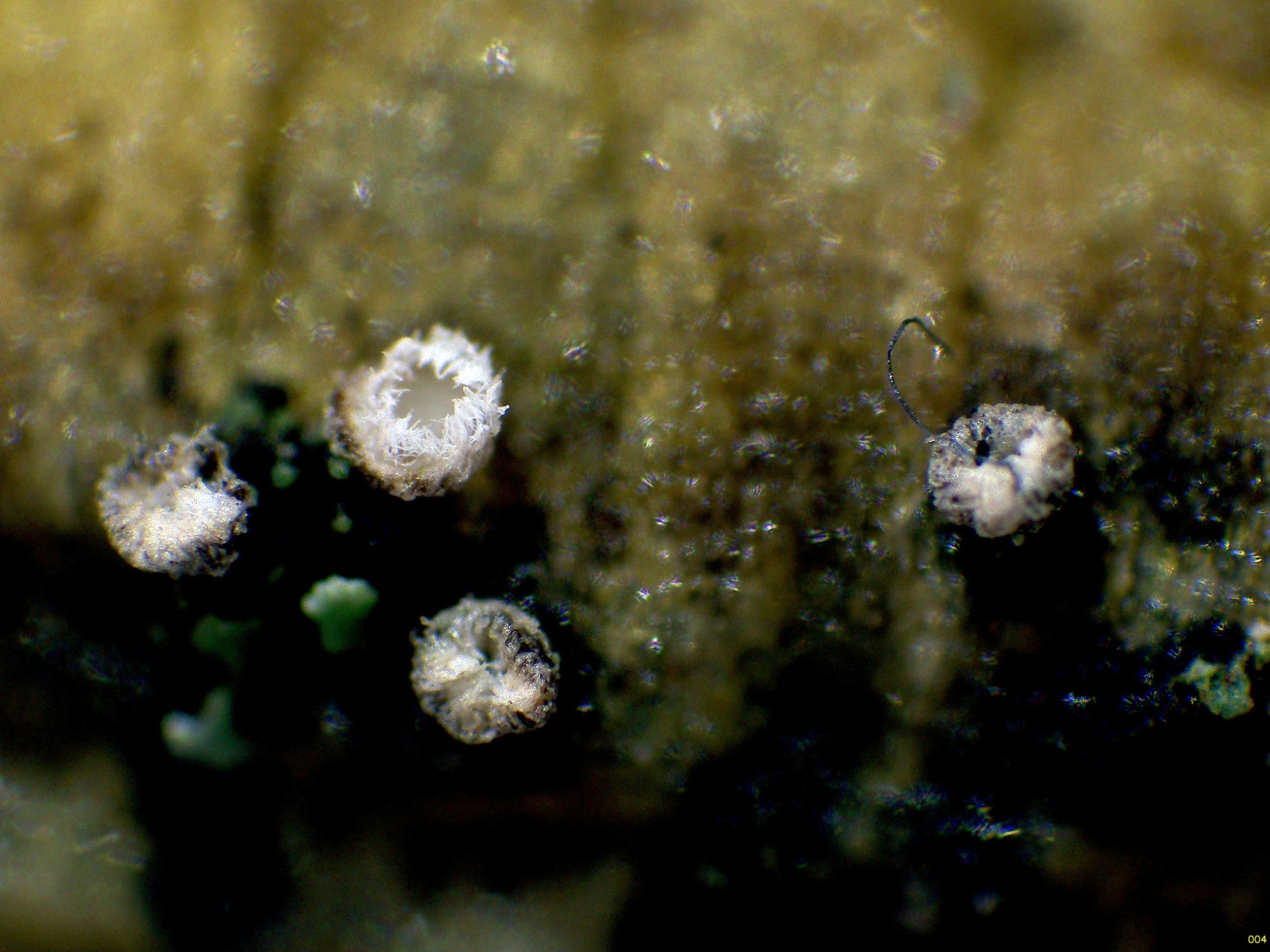 Seguimos con un diminuto basidiomiceto, aunque no he podido obtener esporas, ya tan solo por los pelos marginales no me queda duda de su identidad, la Flagelloscypha minutissima: