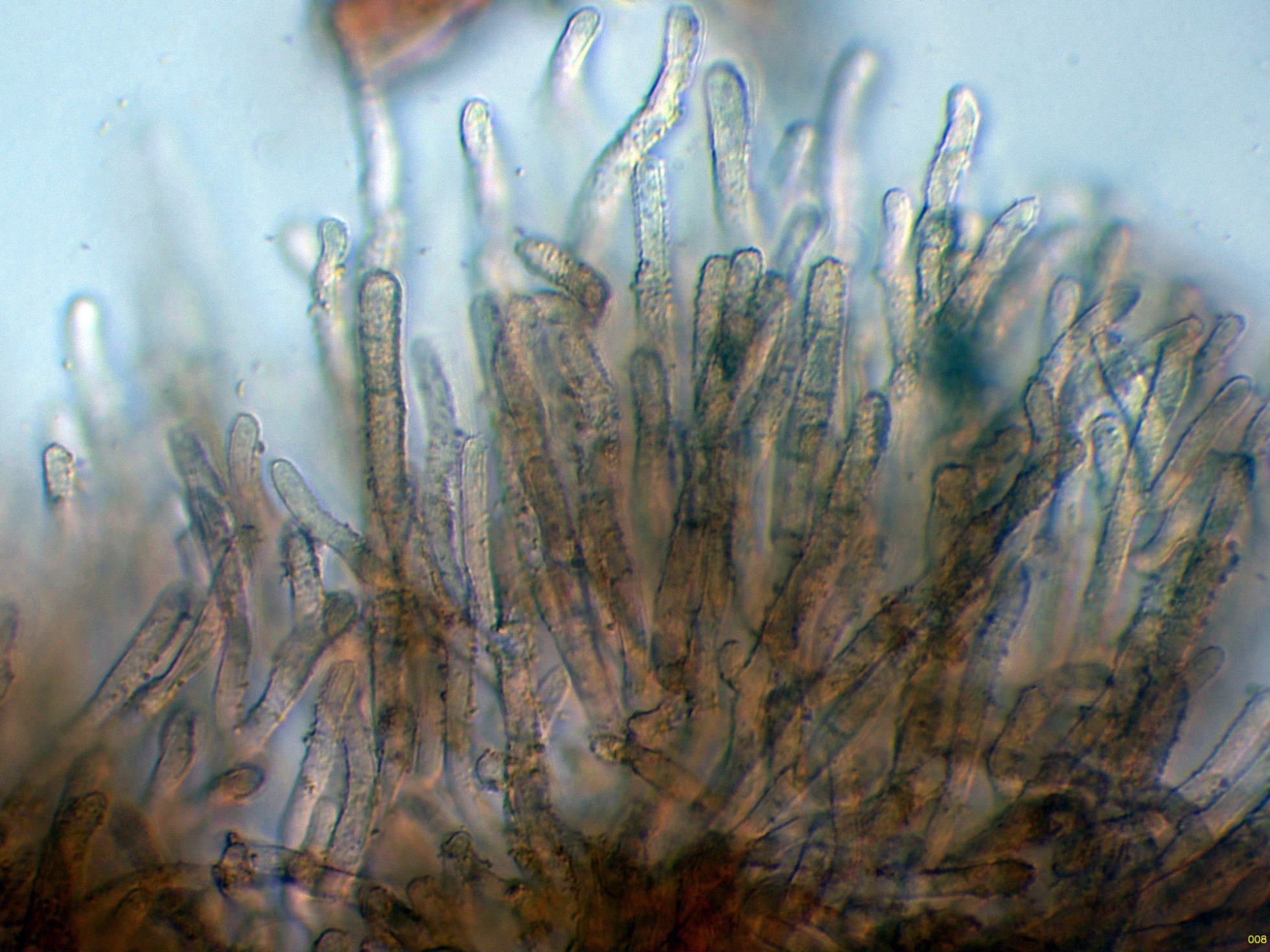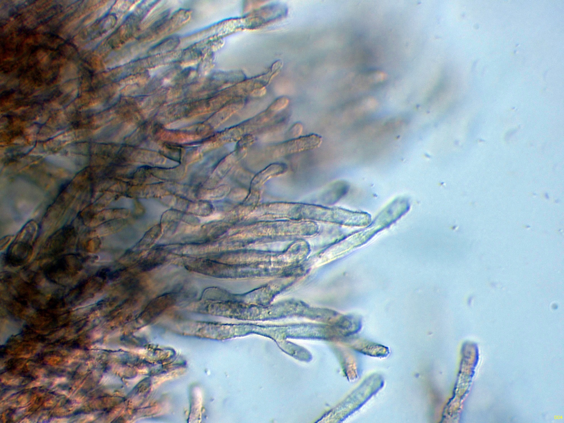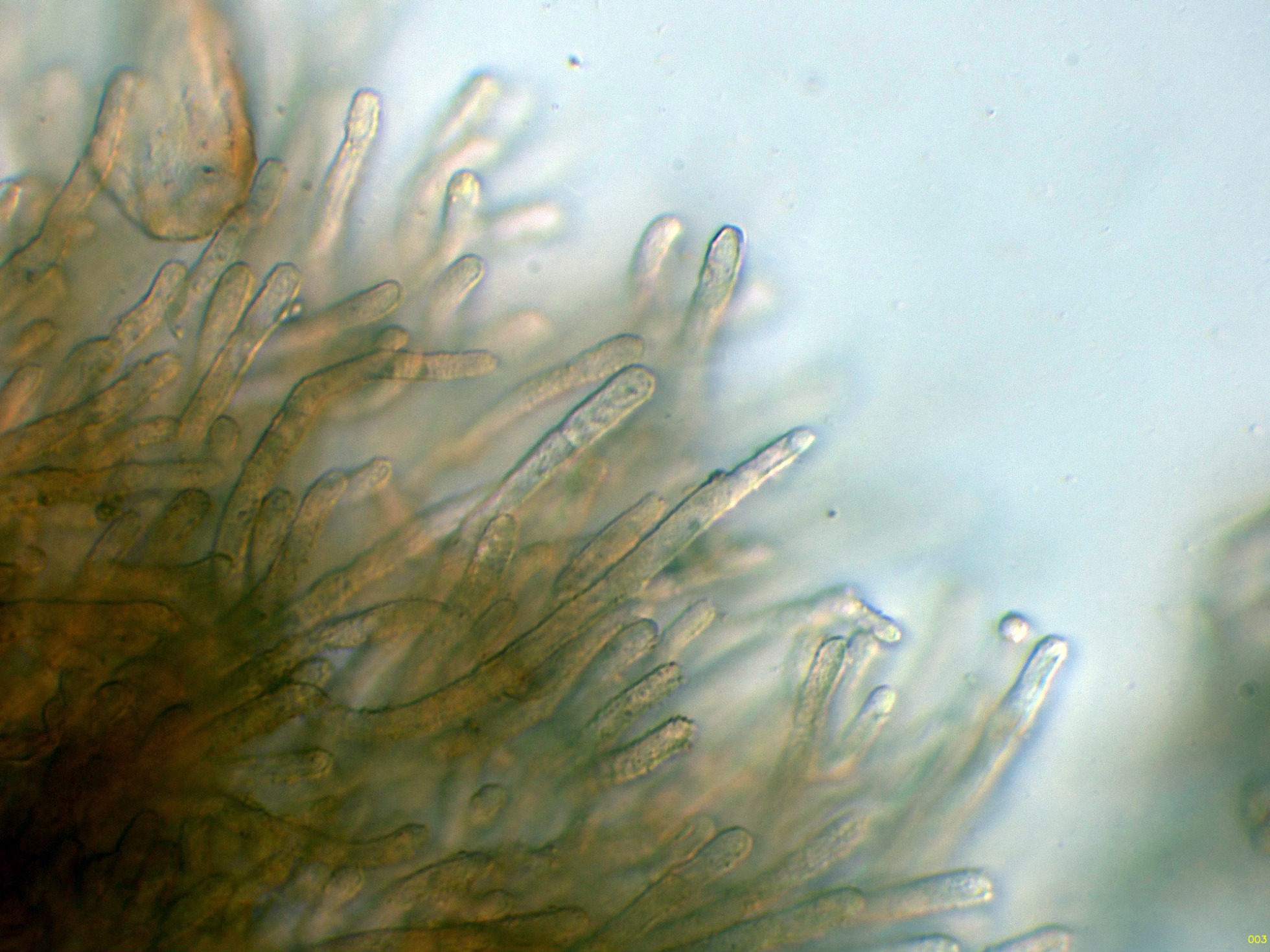 Hifas terminales a modo de caulocistidios de la capa corticial del estípite en solución de Rojo Congo diluido: