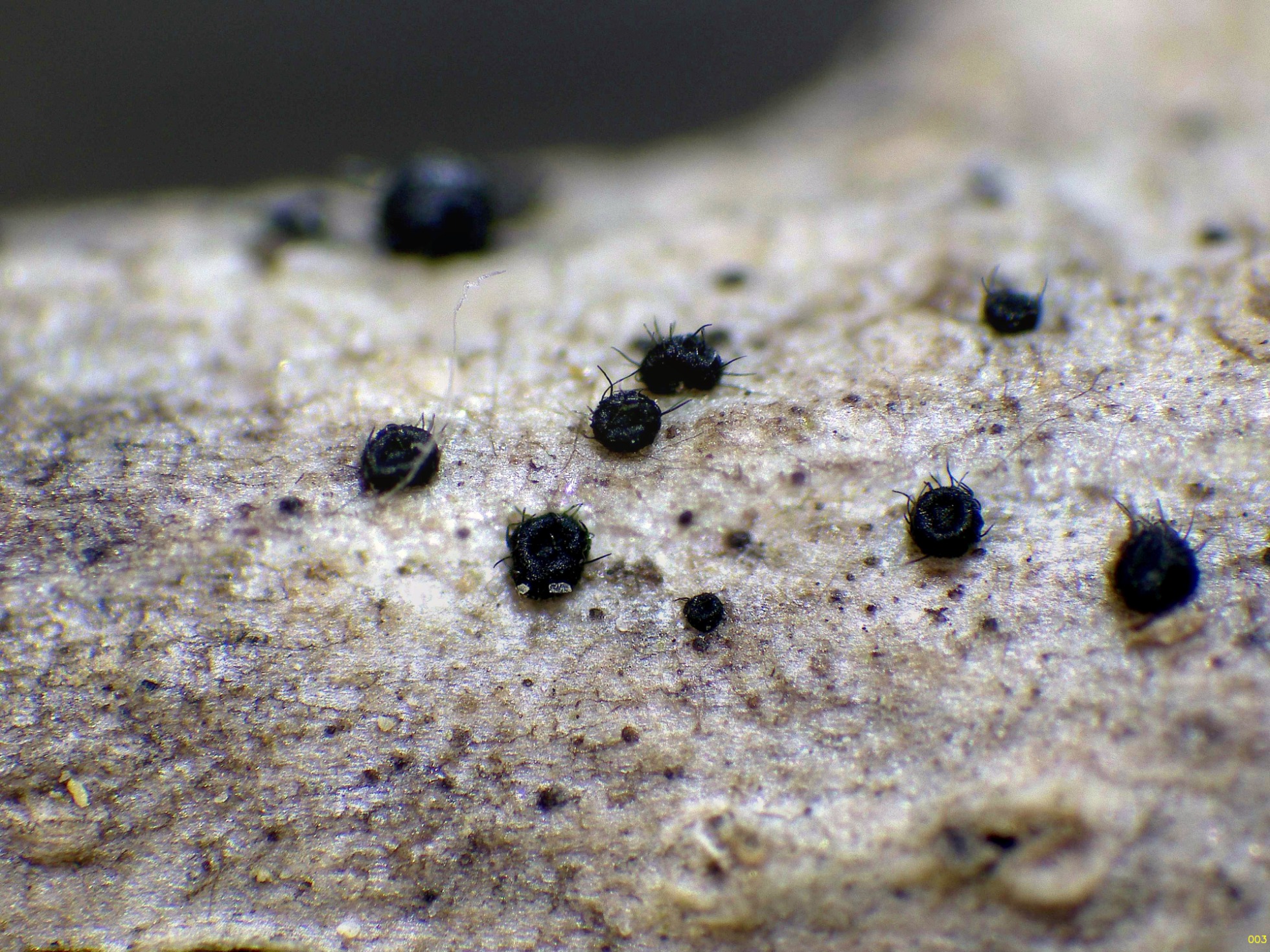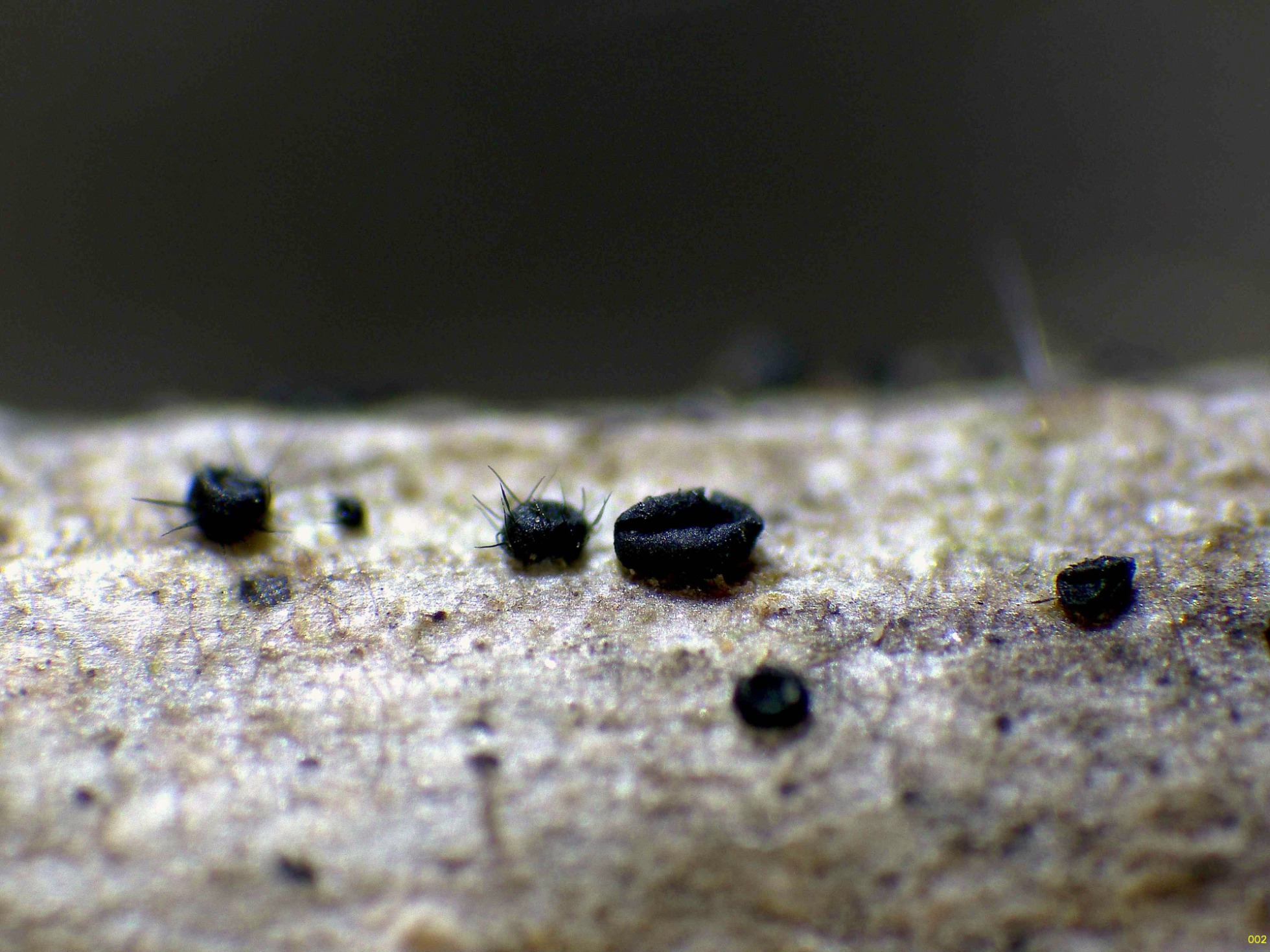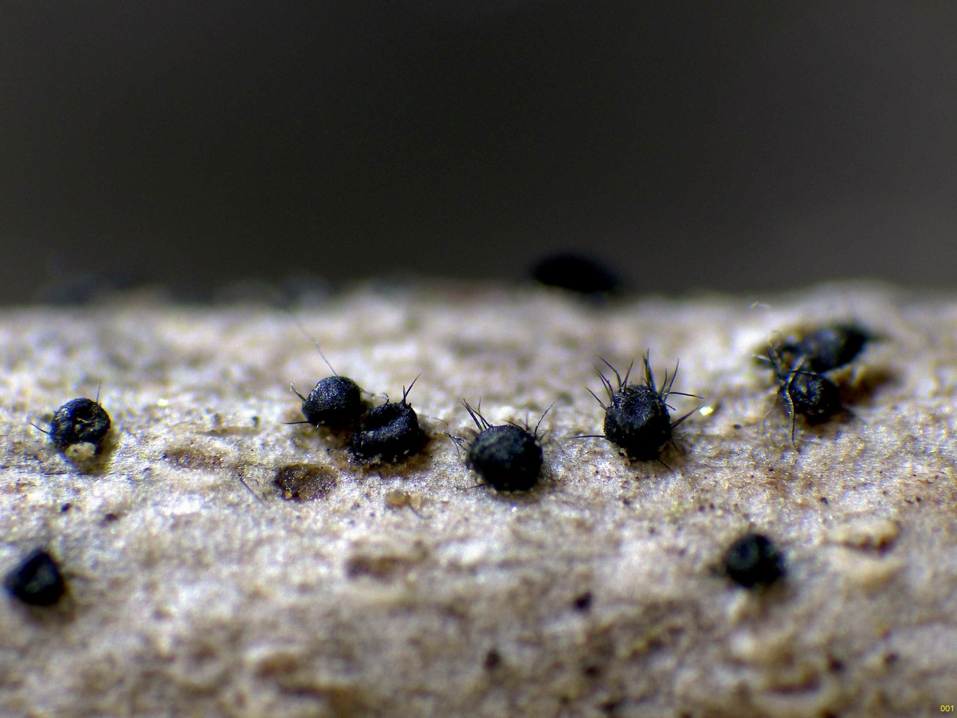 Conidiomas esféricos, con su superficie cubierta de pelos, de color negro, con un diámetro sin contar los pelos de entre 0,2 a 0,3 mm.