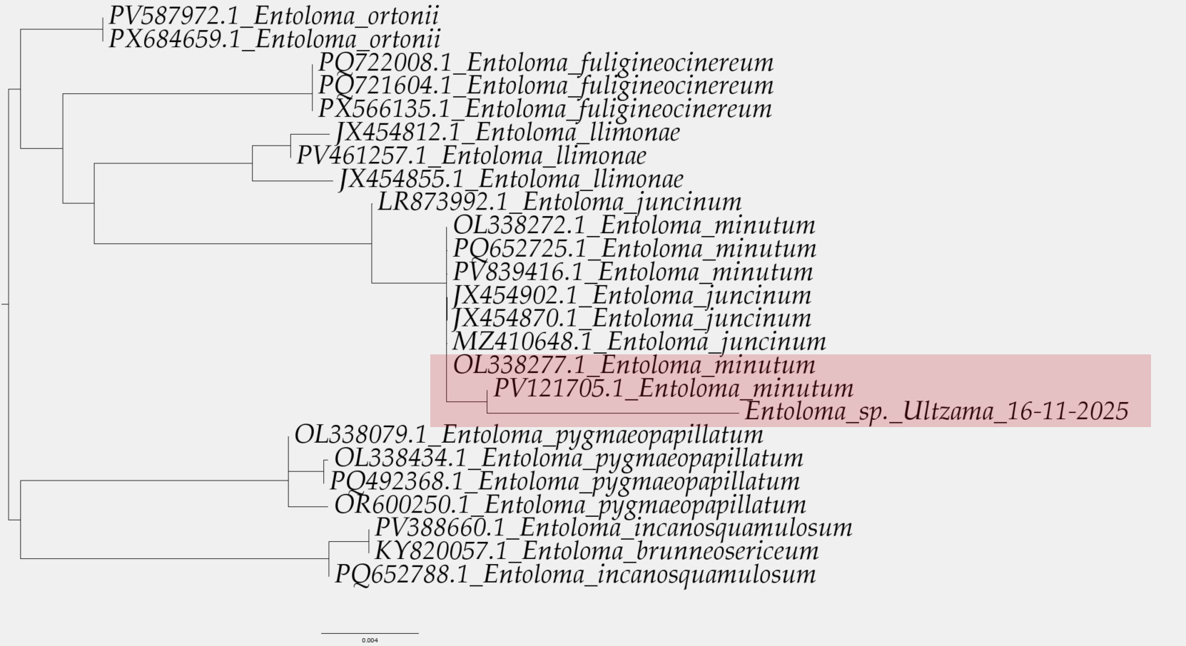 En el árbol vemos a nuestra especie dentro del Clado del Entoloma minutum y el Entoloma juncinum, ambos Entolomas prácticamente idénticos a nivel molecular en cuanto al gen ITS se refiere, para poder inclinarme por una u otra opción he utilizado las Claves de Entoloma de Funga Nordica, estas claves otorgan unas medidas para las esporas del Entoloma minutum de 8-11(-11,5) x 6,5-8,5 μm. bastante cercanas a mi propuesta, frente al Entoloma juncinum, según la misma fuente con unas medidas para sus esporas de 8-10 x 6-8 μm., con unas medidas más cortas, especialmente en cuanto a su longitud se refiere, y con 5 a 7 ángulos.