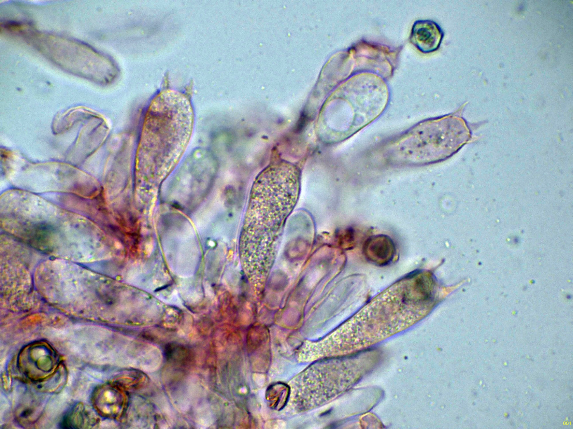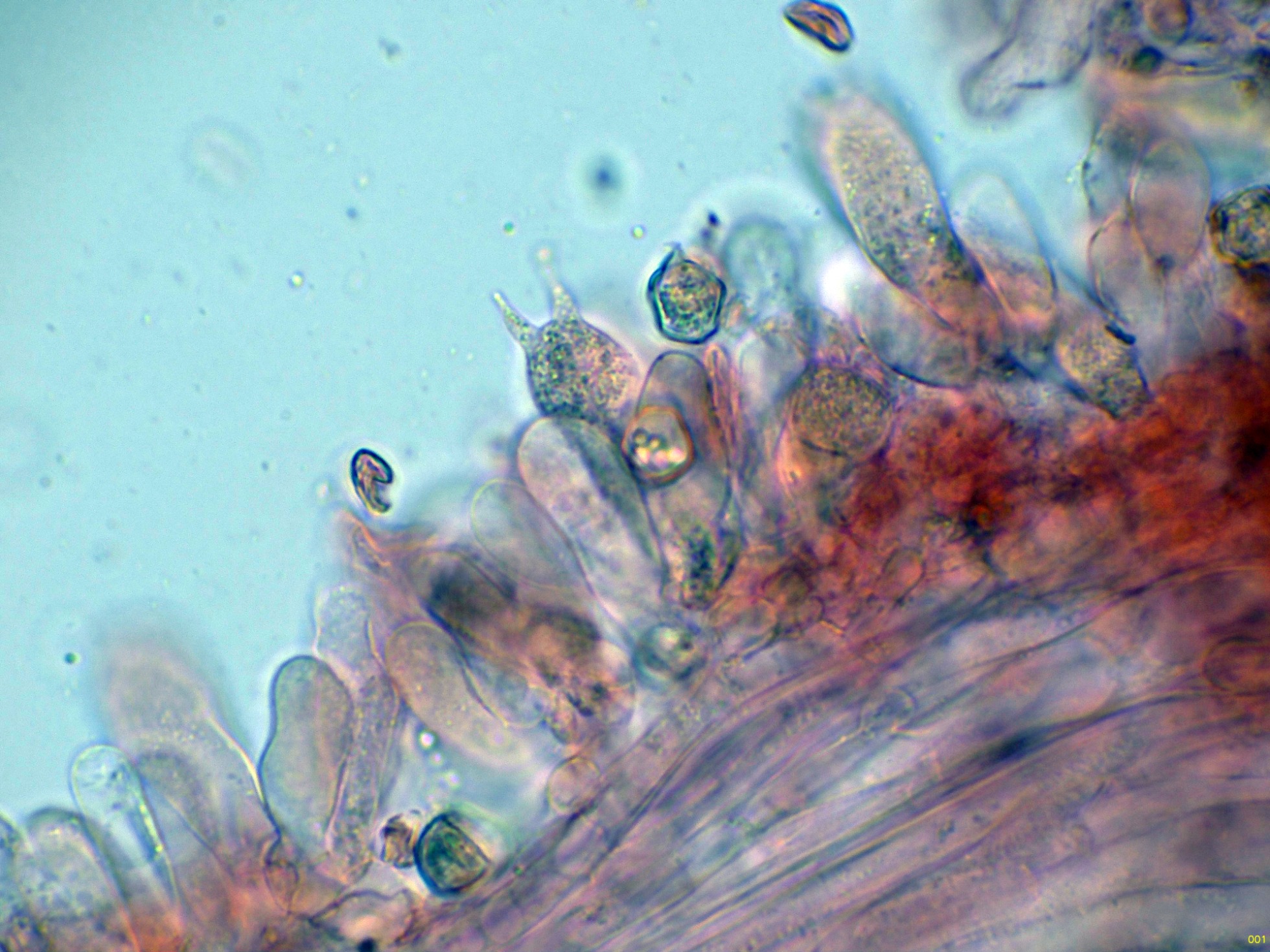 Los basidios en agua, estos basidios con unas medidas de (16.3) 16.9 - 22.8 (24.2) × (4.6) 5.1 - 6.7 (7.1) µm.