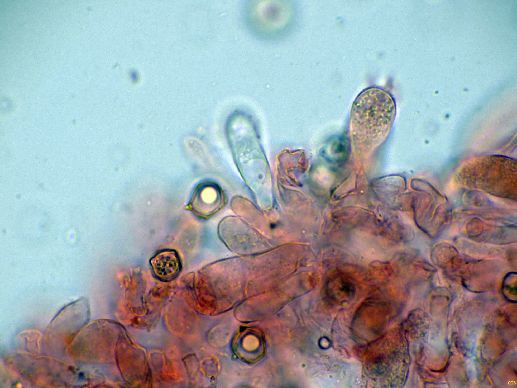 Los basidios en solución de Rojo Congo, con unas medidas de (21.4) 21.5 - 31 (31.9) × (8.2) 8.9 - 10.7 (10.8) µm.