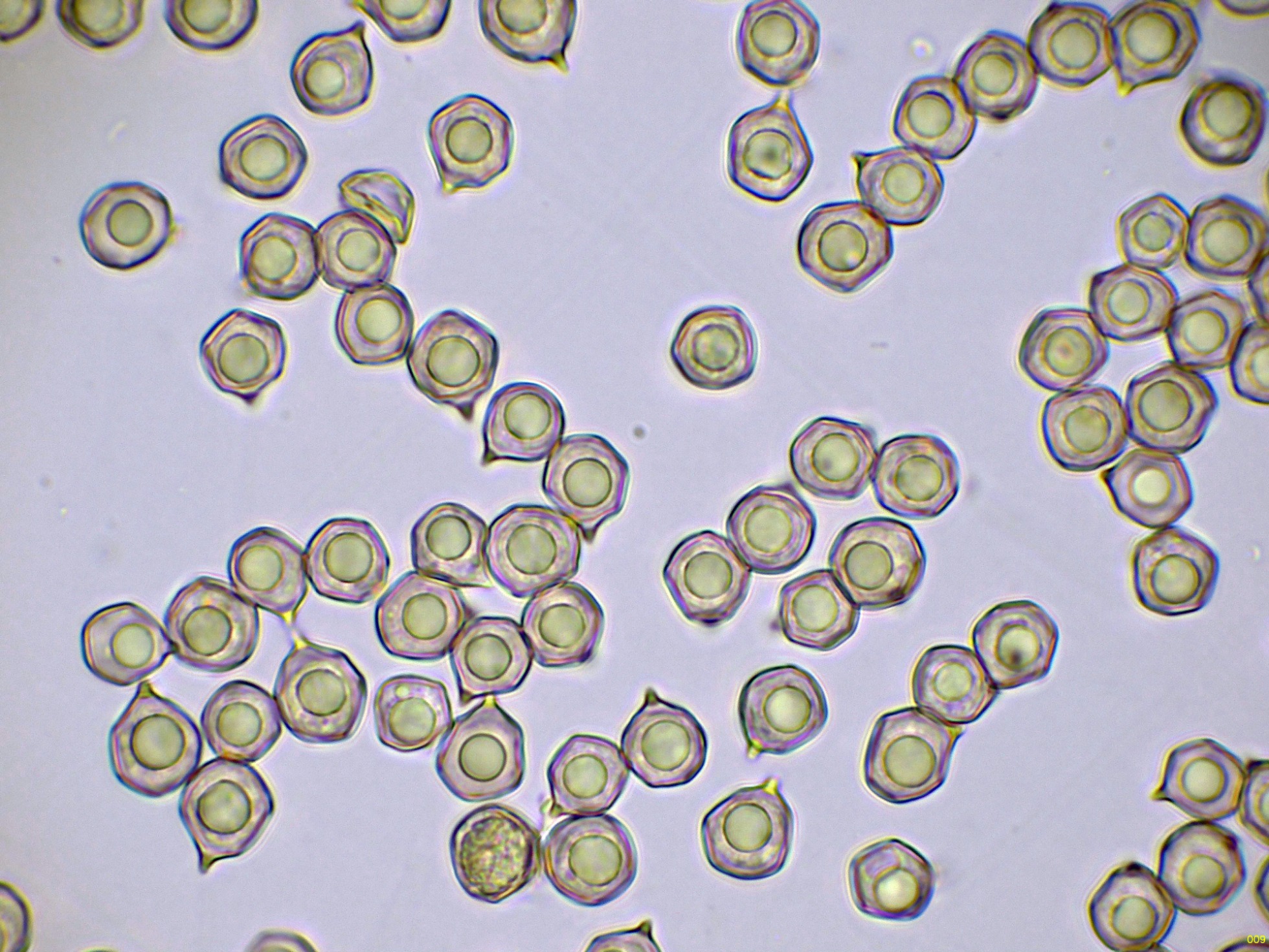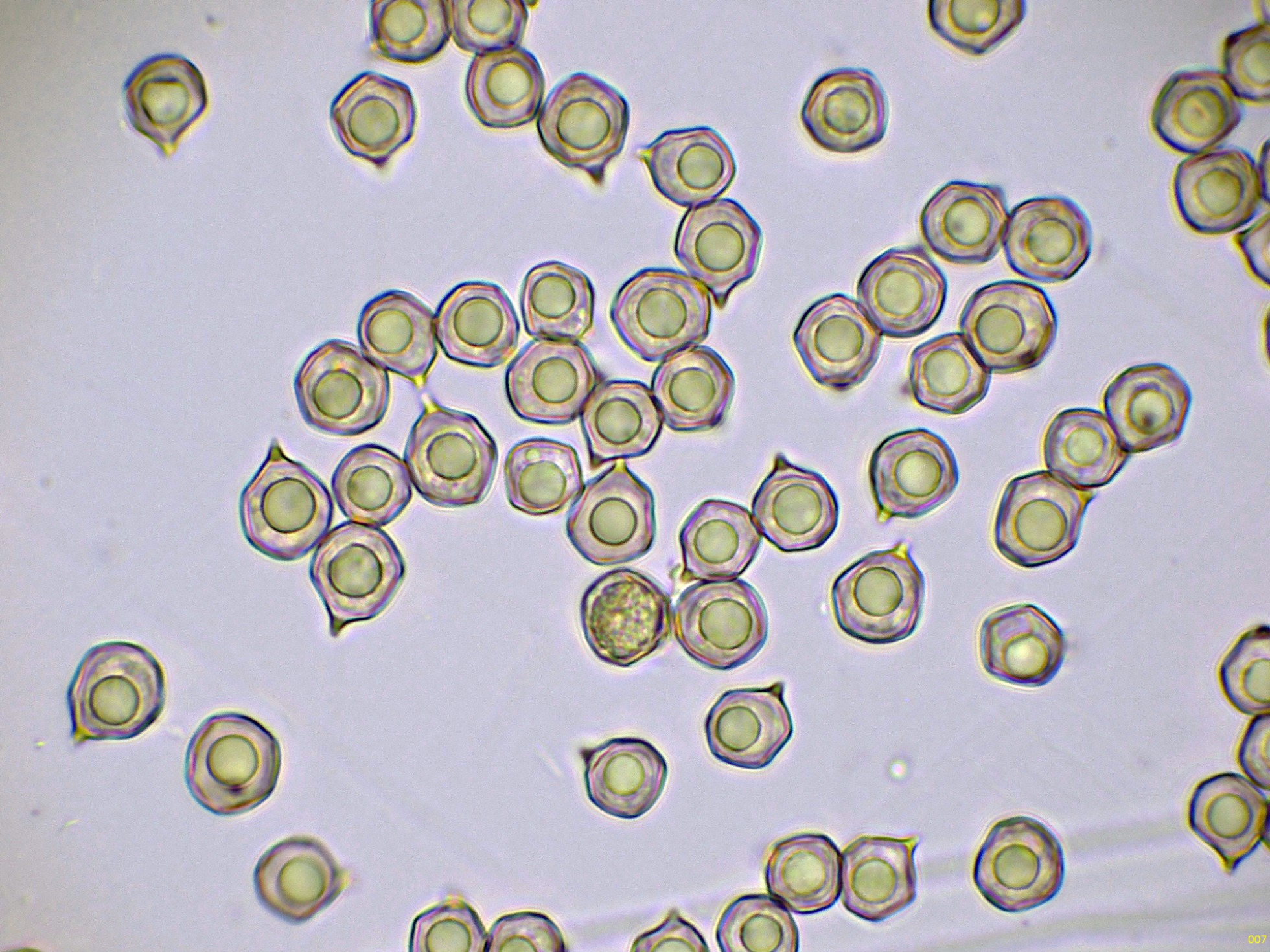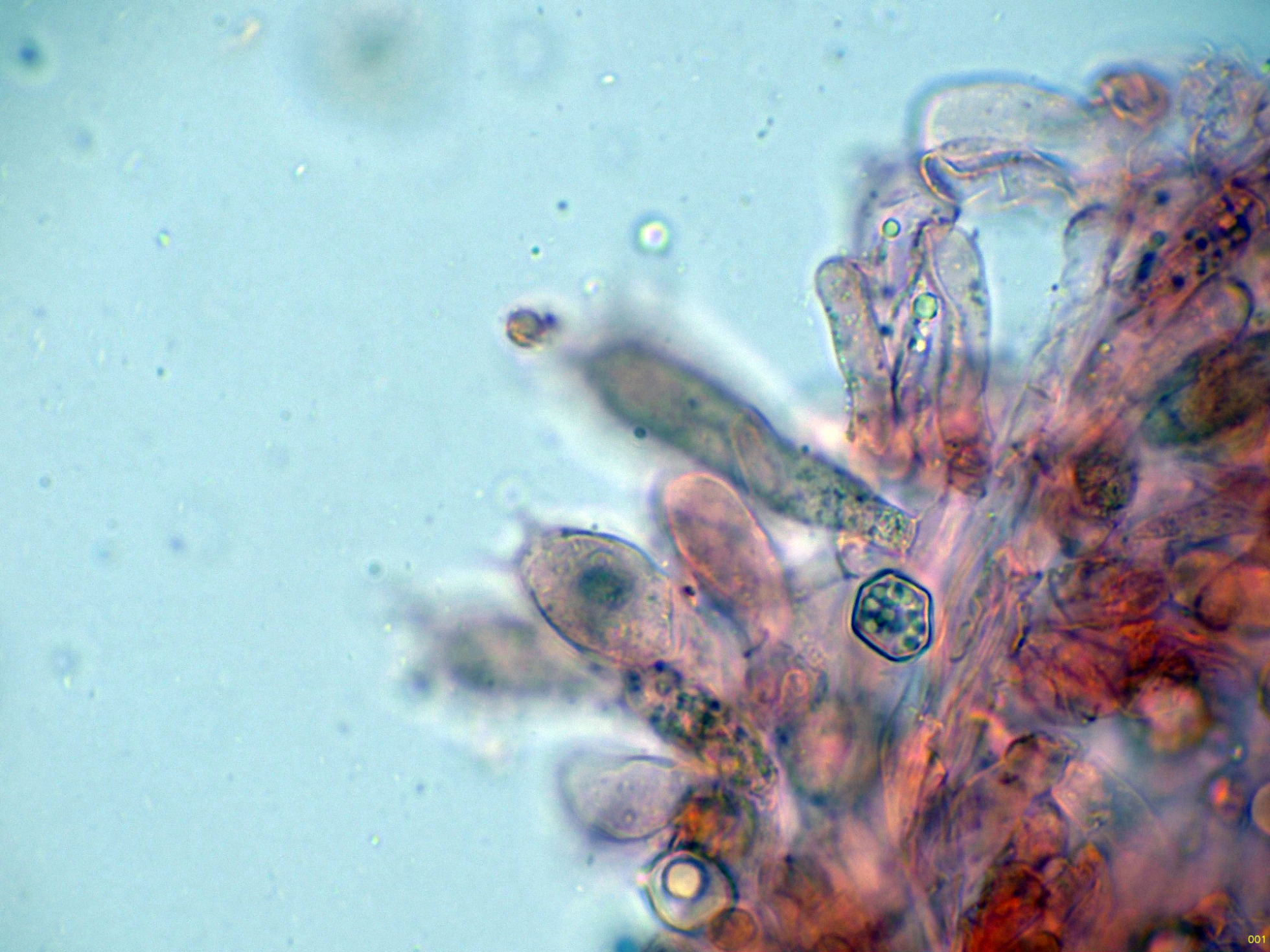 Y las esporas en Reactivo de Melzer, con un comportamiento prácticamente inamiloide, aunque en otros estudios, si que pude observar una reacción débilmente amiloide.