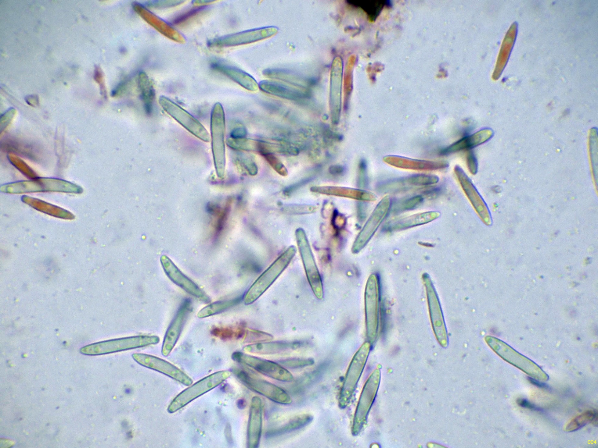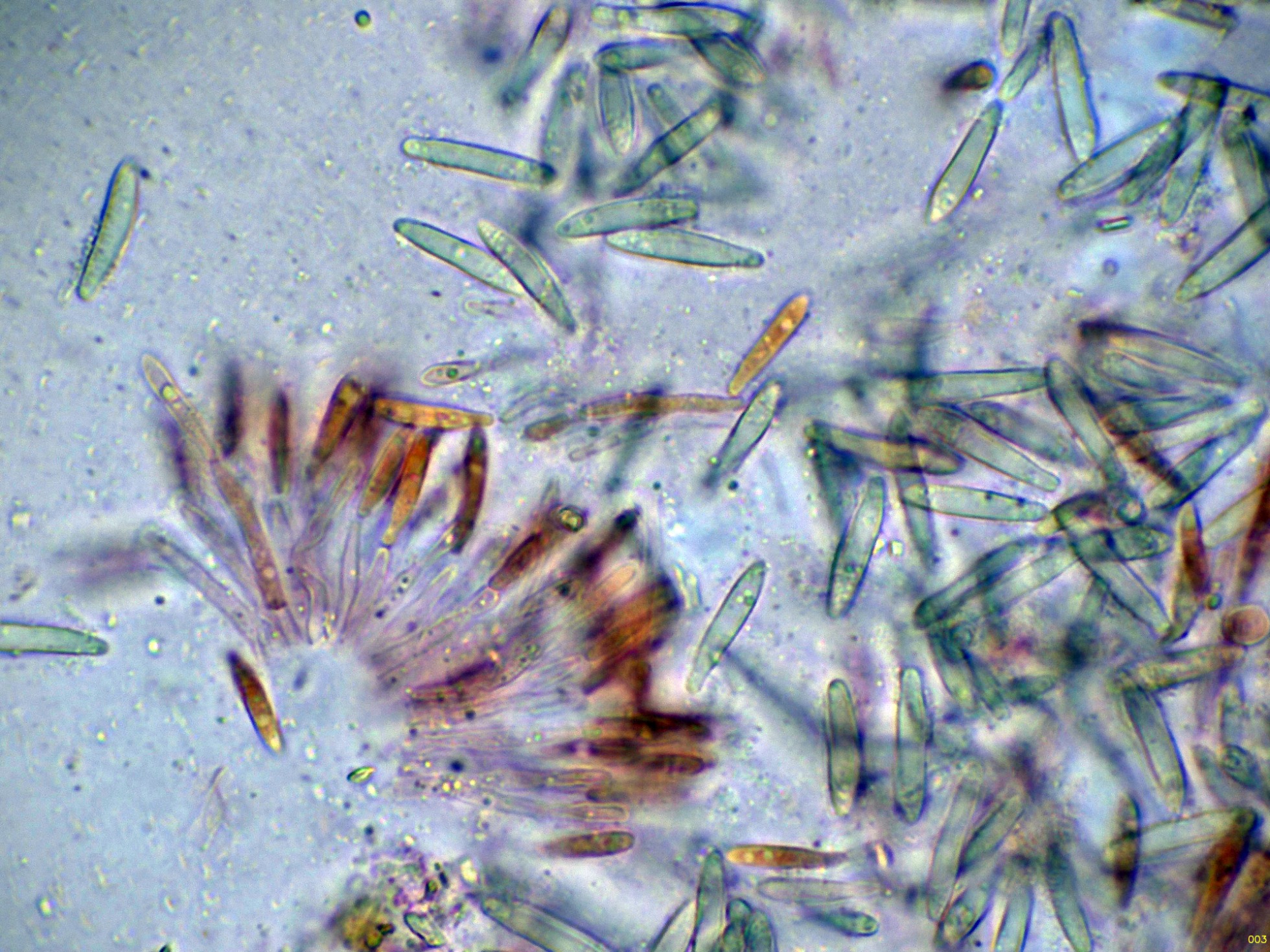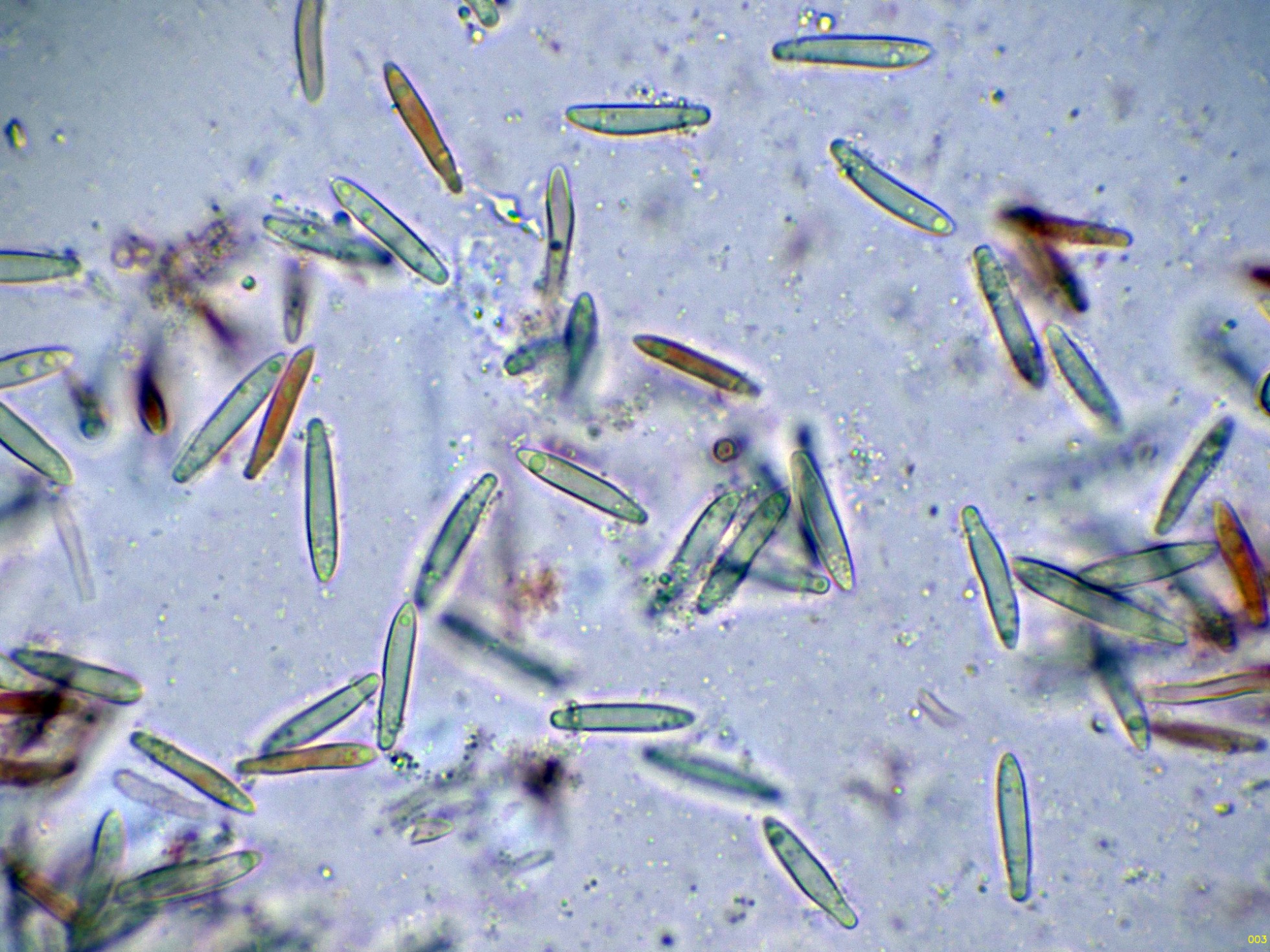 Estas hifas producen unos conidios cilíndricos con los extremos algo apuntados, con unas medidas en agua de: