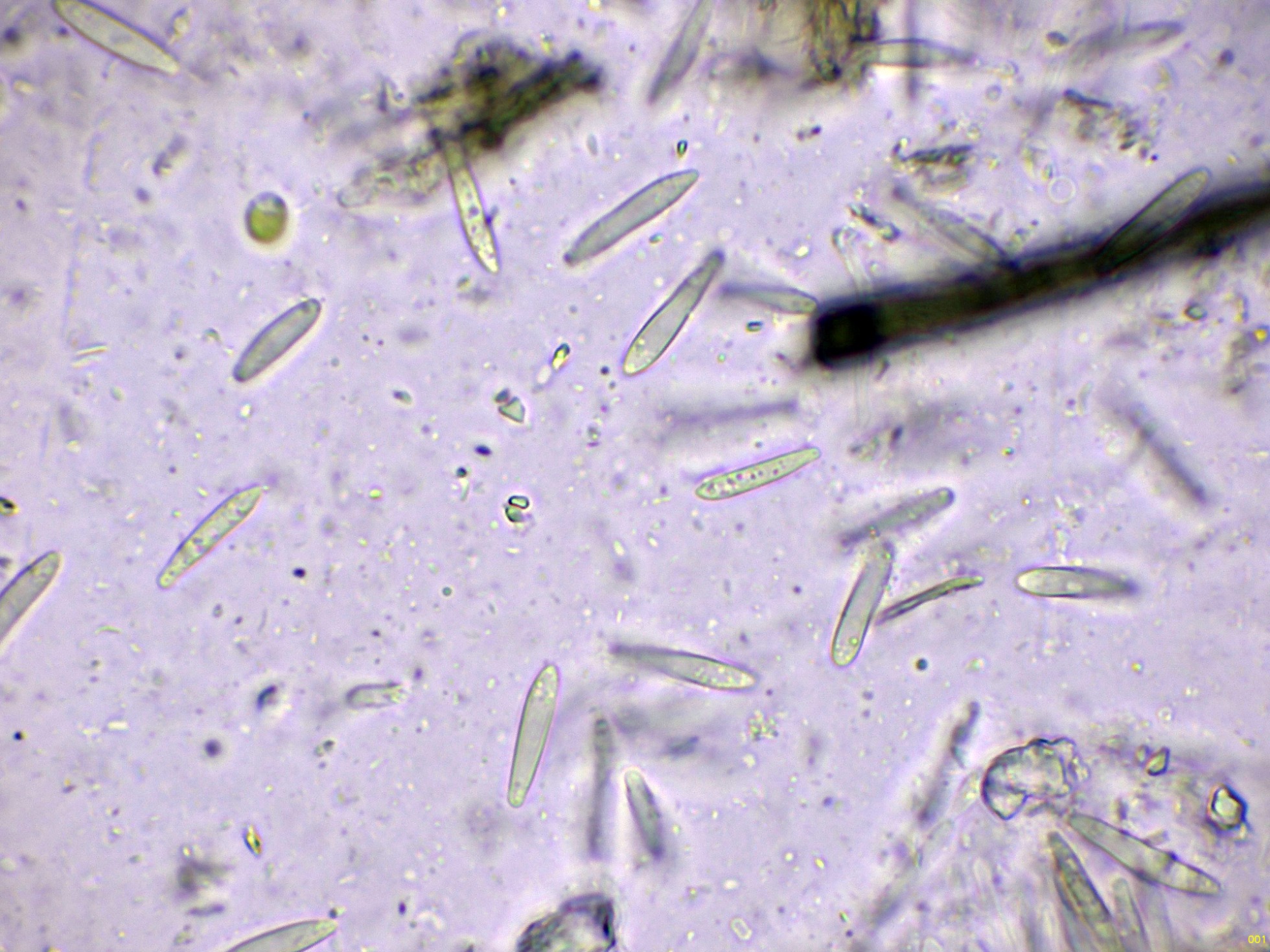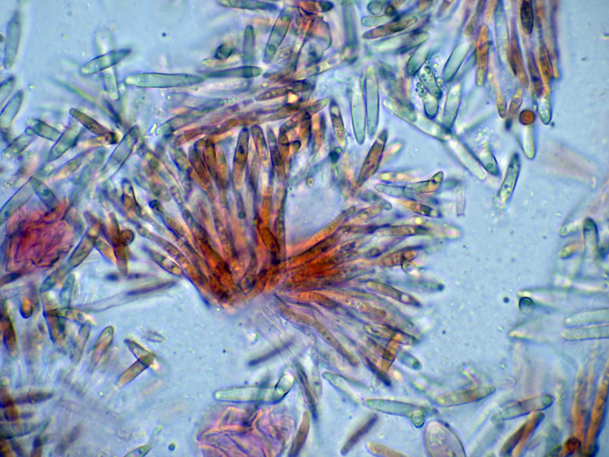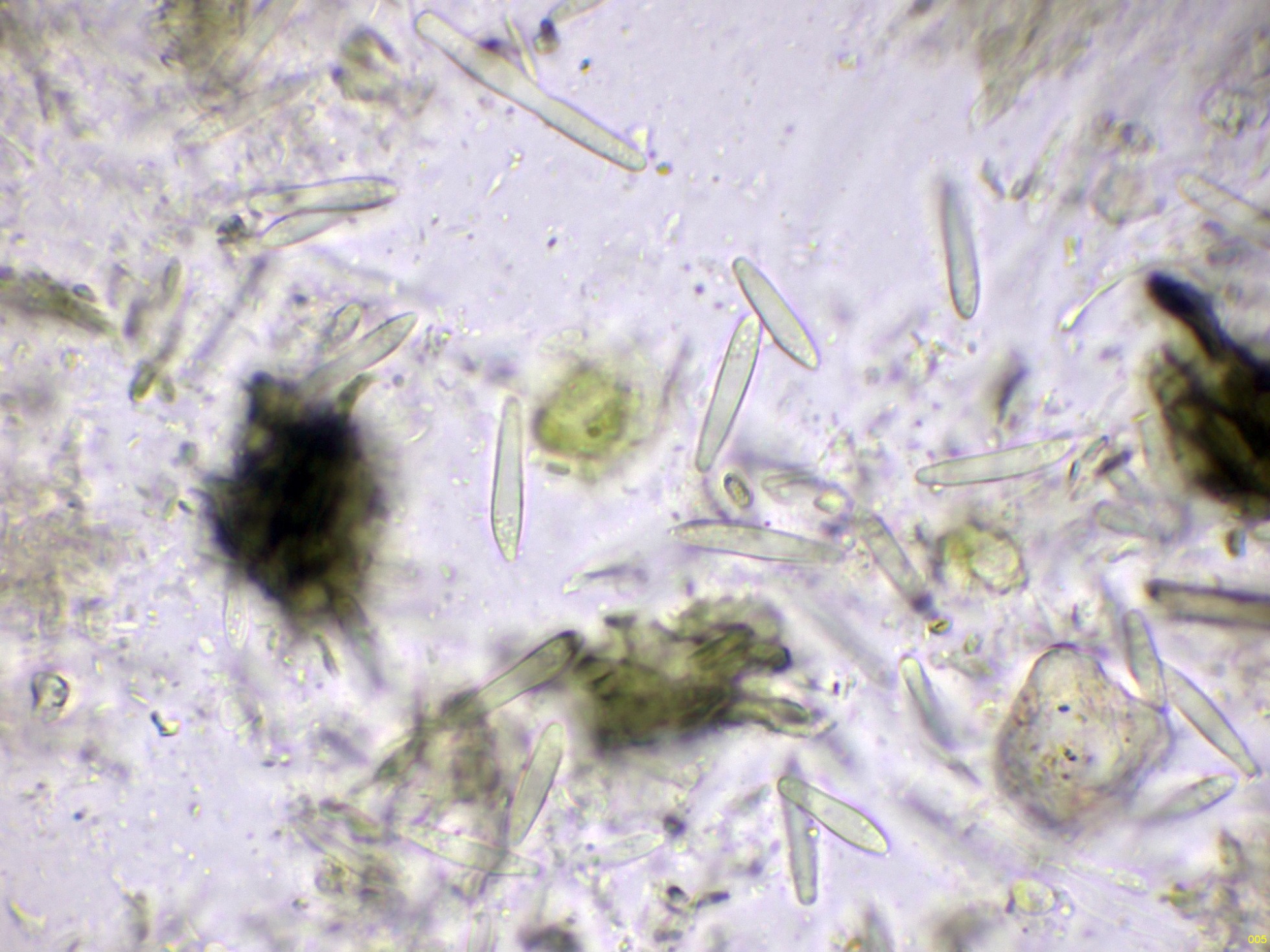 Estas hifas producen unos conidios cilíndricos con los extremos algo apuntados, con unas medidas en agua de: