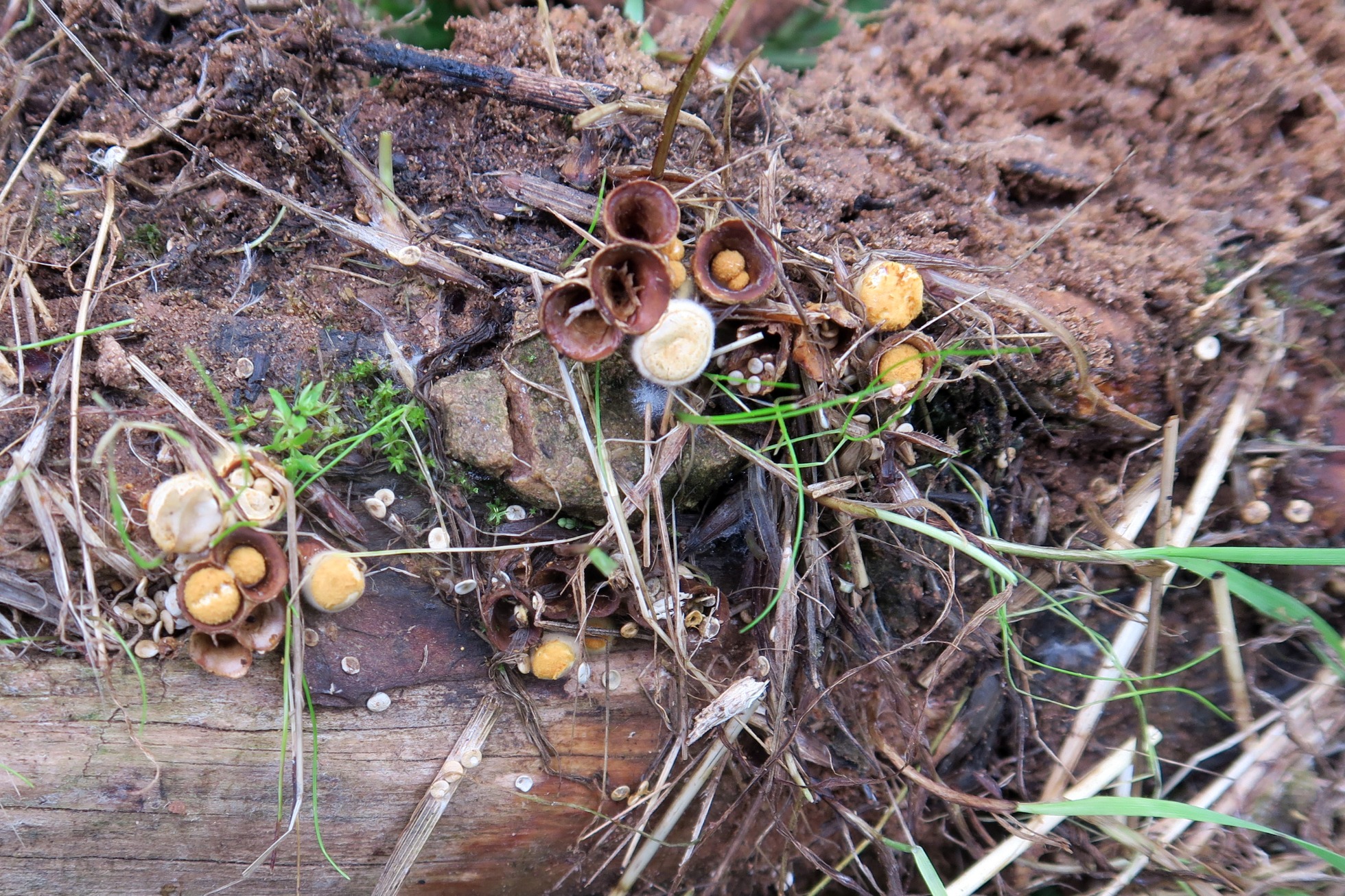 Con forma de nido de pájaro, tenemos el Crucibulum laeve: