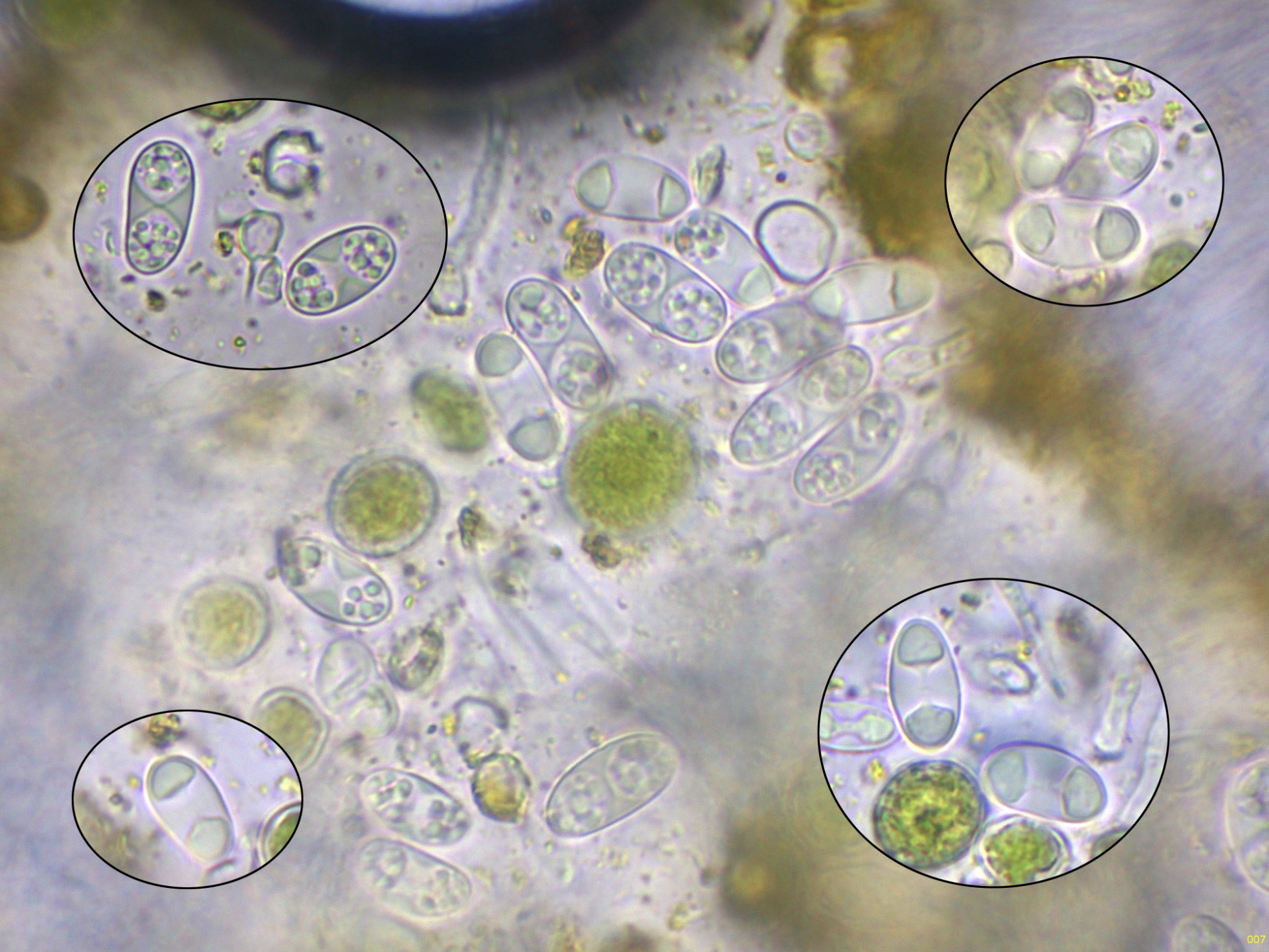 Por debajo de estas ya se pueden observar abundantes esfrerocistos: