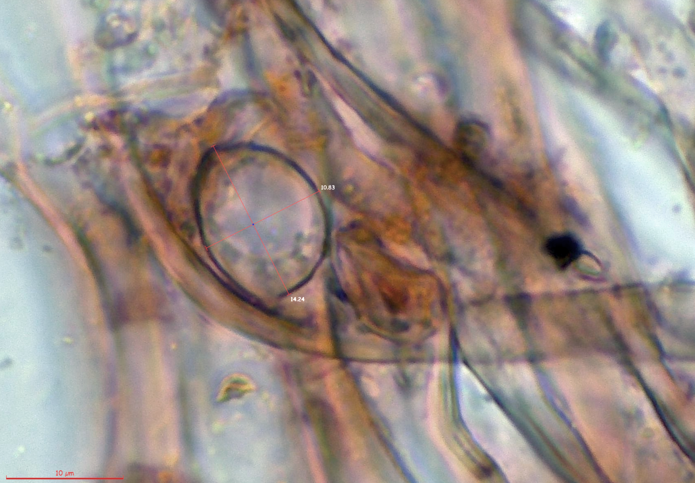 Y por último una espora ampliada con sus medidas: